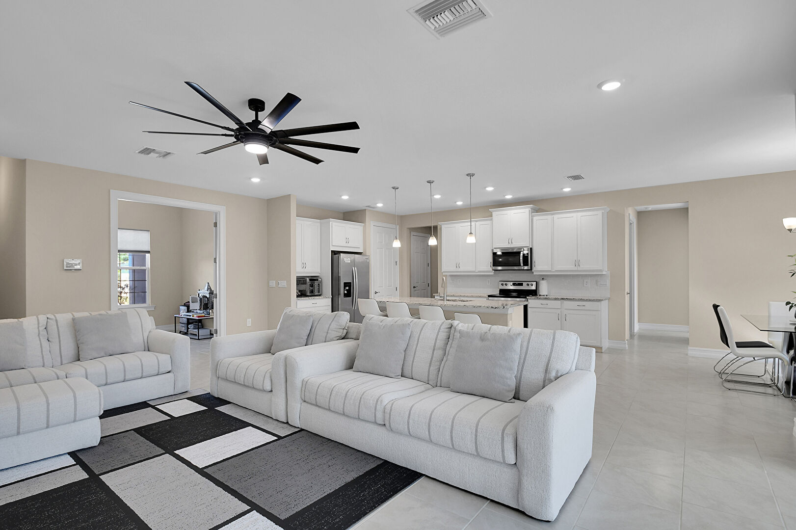 Baseboards Wall, Ceiling Fan, Drywall, L Shaped Kitchen, Natural Light, Recessed Lighting, Tile Floor, Vent, L Shaped Kitchen, Natural Light, Vent