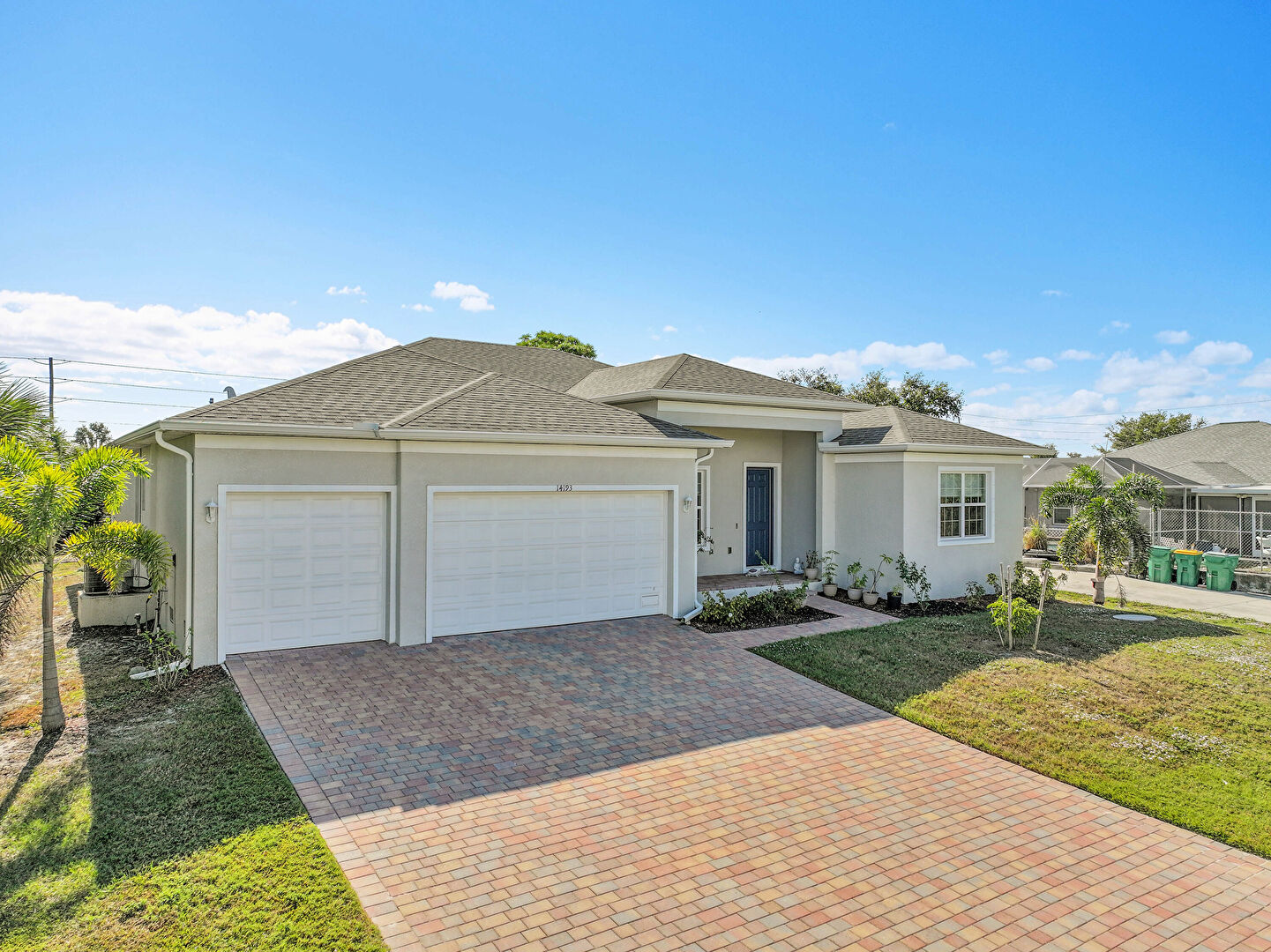Downspout, Driveway, Gutters, Lawn, Porch, Shingle Roof, Stucco Siding, Driveway, Lawn, Shingle Roof