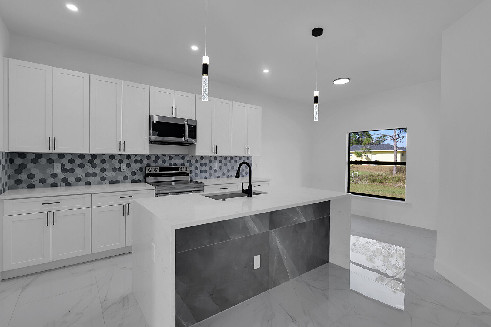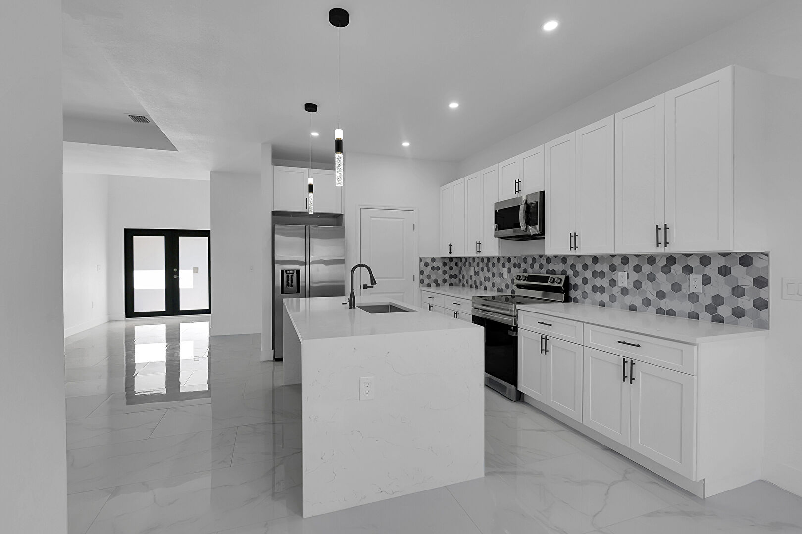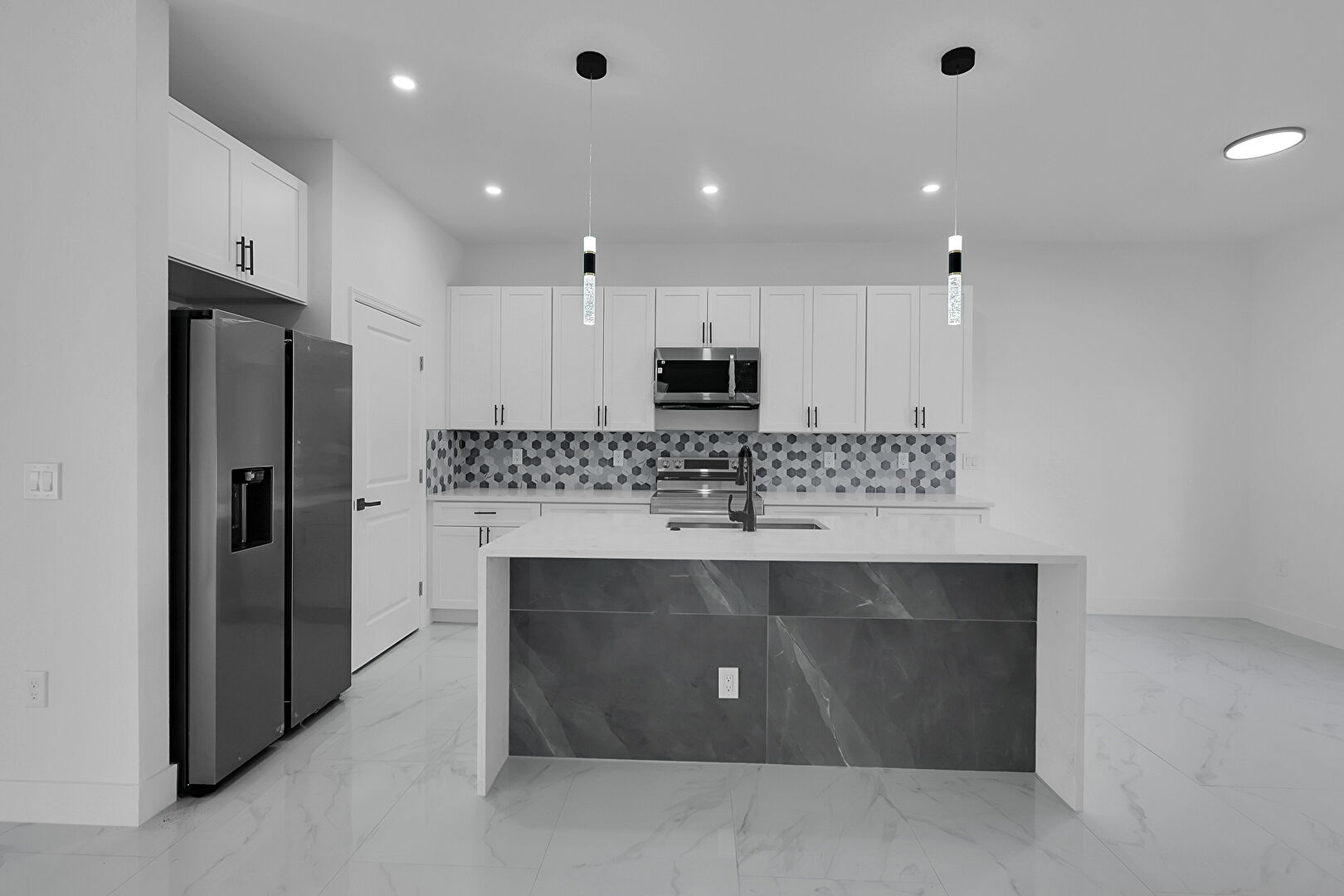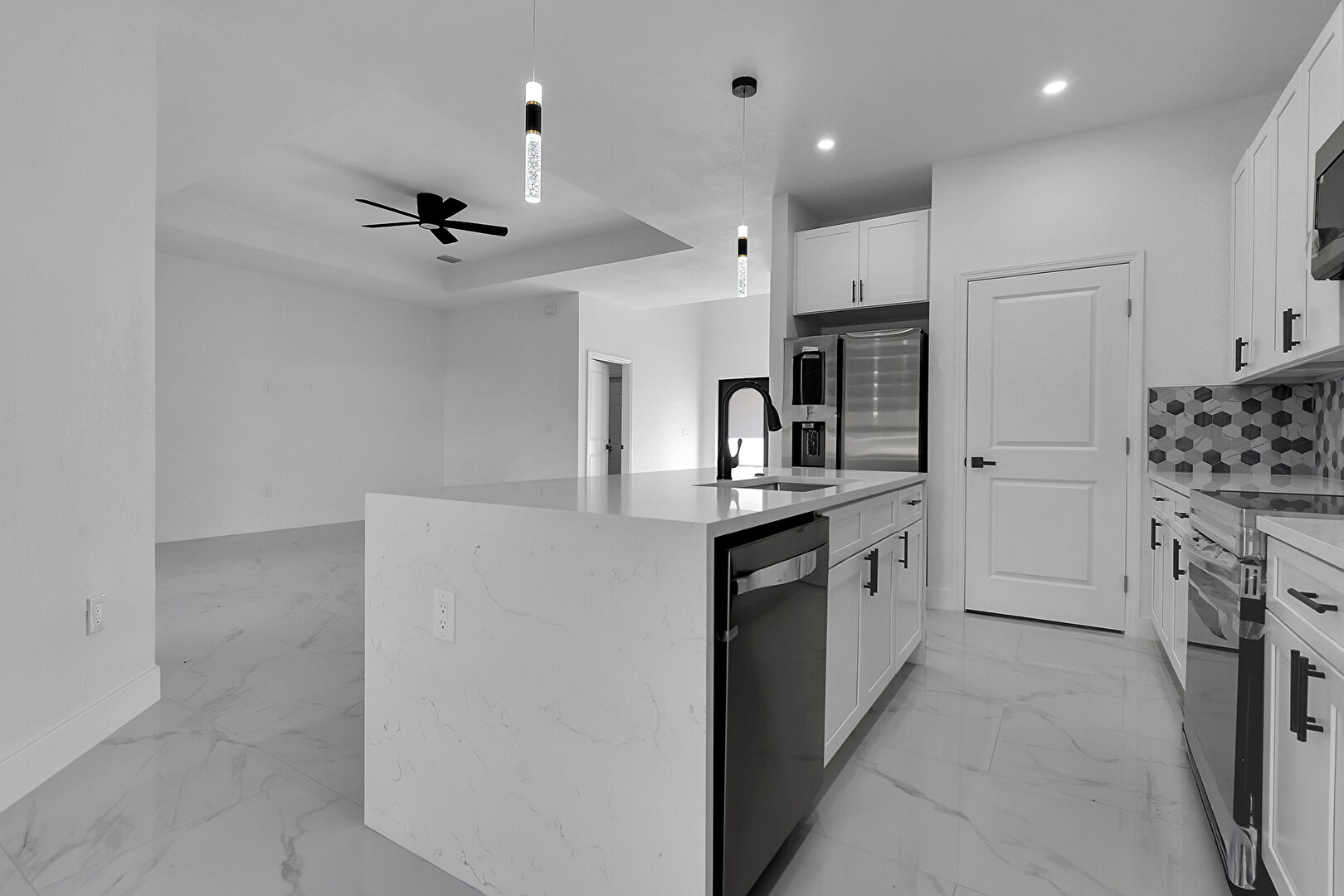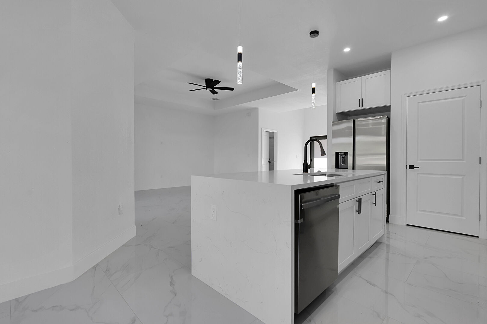Baseboards Wall, Ceiling Fan, Drywall, French Doors, Kitchen Island, L Shaped Kitchen, Marble Finish Floor, Natural Light, Opens To Living Area, Pendant Lighting, Recessed Lighting, Shaker Cabinets, Stone Countertops, Vent, Kitchen Island, Natural Light, Recessed Lighting, Shaker Cabinets, Stone Countertops, Tray Ceiling