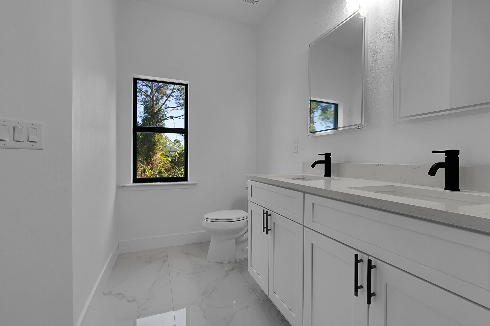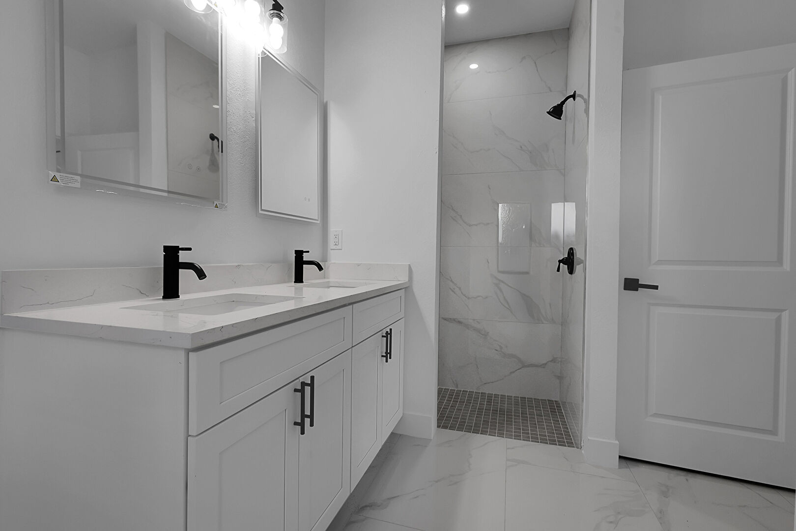 Baseboards Wall, Double Vanity, Drywall, Marble Finish Floor, Natural Light, Recessed Lighting, Full Bathroom