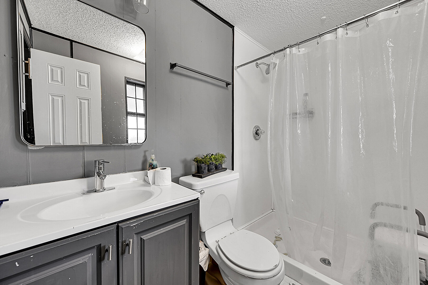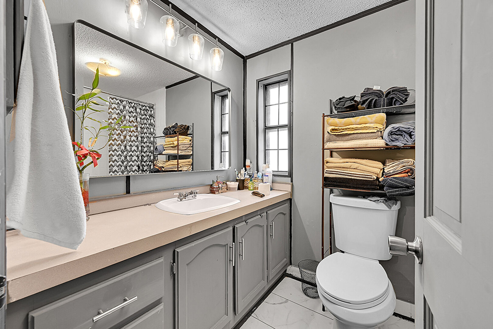 Full Bathroom, Natural Light, Vanity, Textured Ceiling