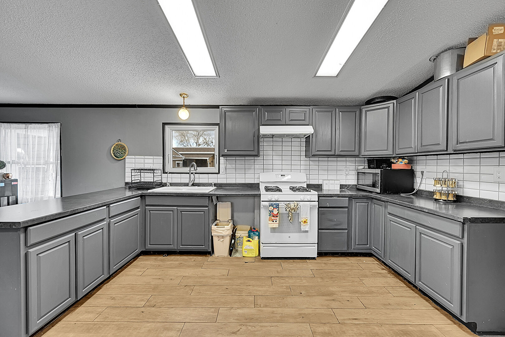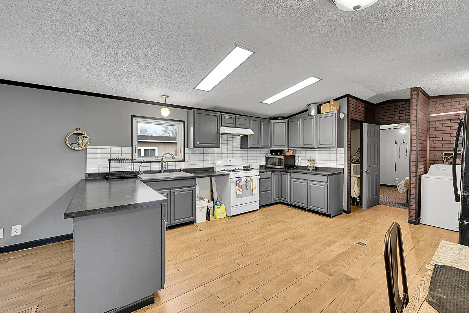Brick Wall, Crown Molding, Drywall, Gray Cabinets, Kitchen Peninsula, Laundry, Natural Light, Raised Cabinets, Textured Ceiling, U Shaped Kitchen, Vaulted Ceiling, Washer Dryer, Washer Hookup, Wood Finish Floor, Baseboards Wall, Natural Light
