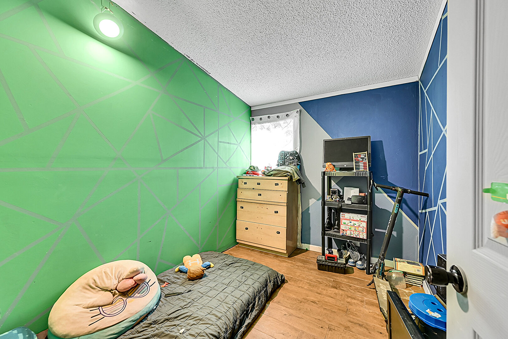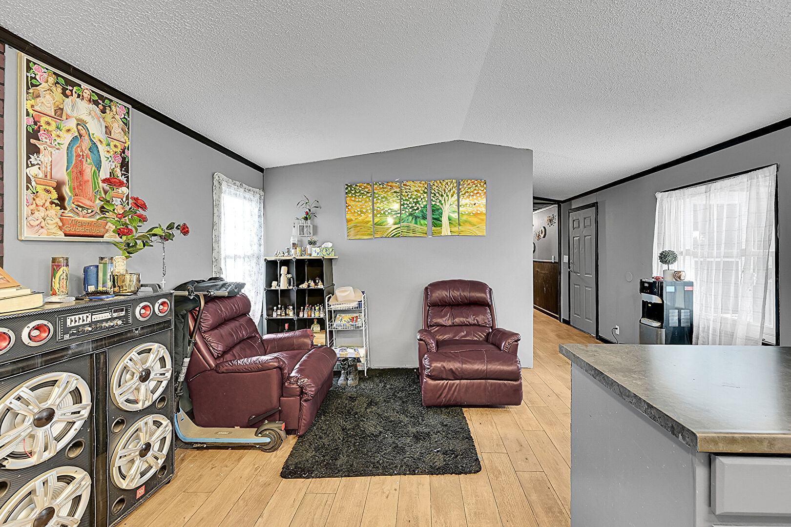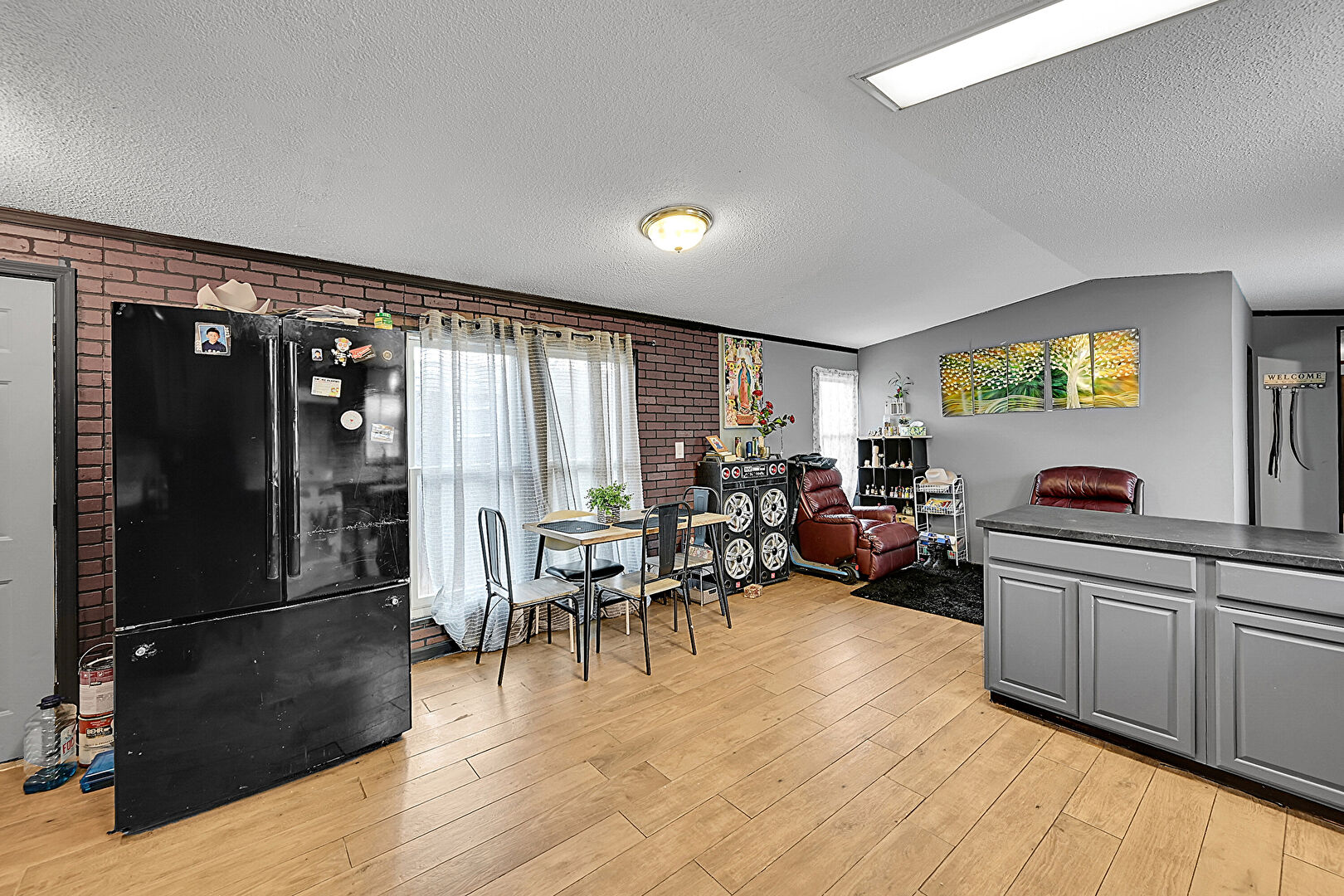 Accent Wall, Baseboards Wall, Natural Light, Textured Ceiling, Wood Finish Floor, Drywall