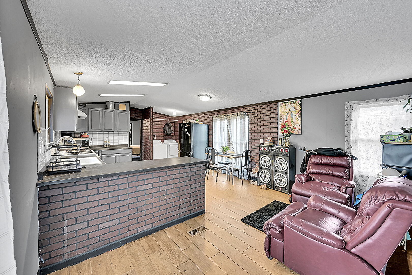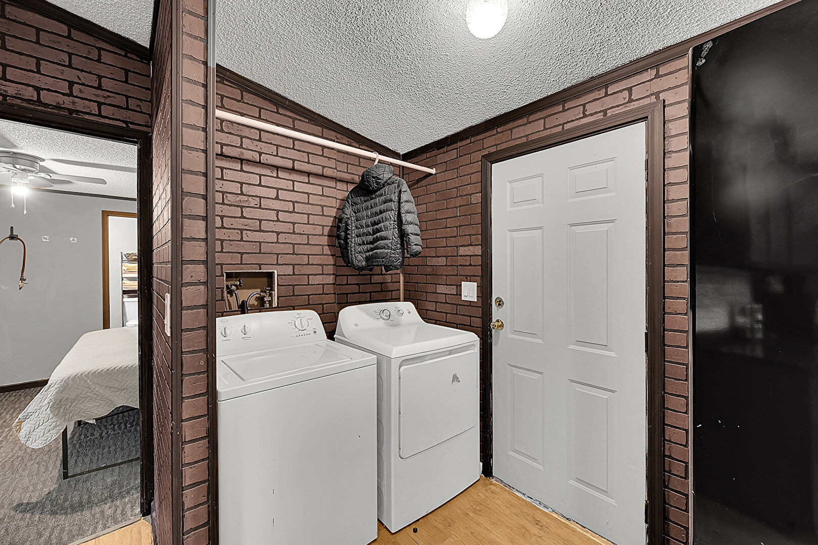 Brick Wall, Drywall, Natural Light, Textured Ceiling, Vaulted Ceiling, Washer Dryer, Wood Finish Floor, Laundry, Wood Finish Floor