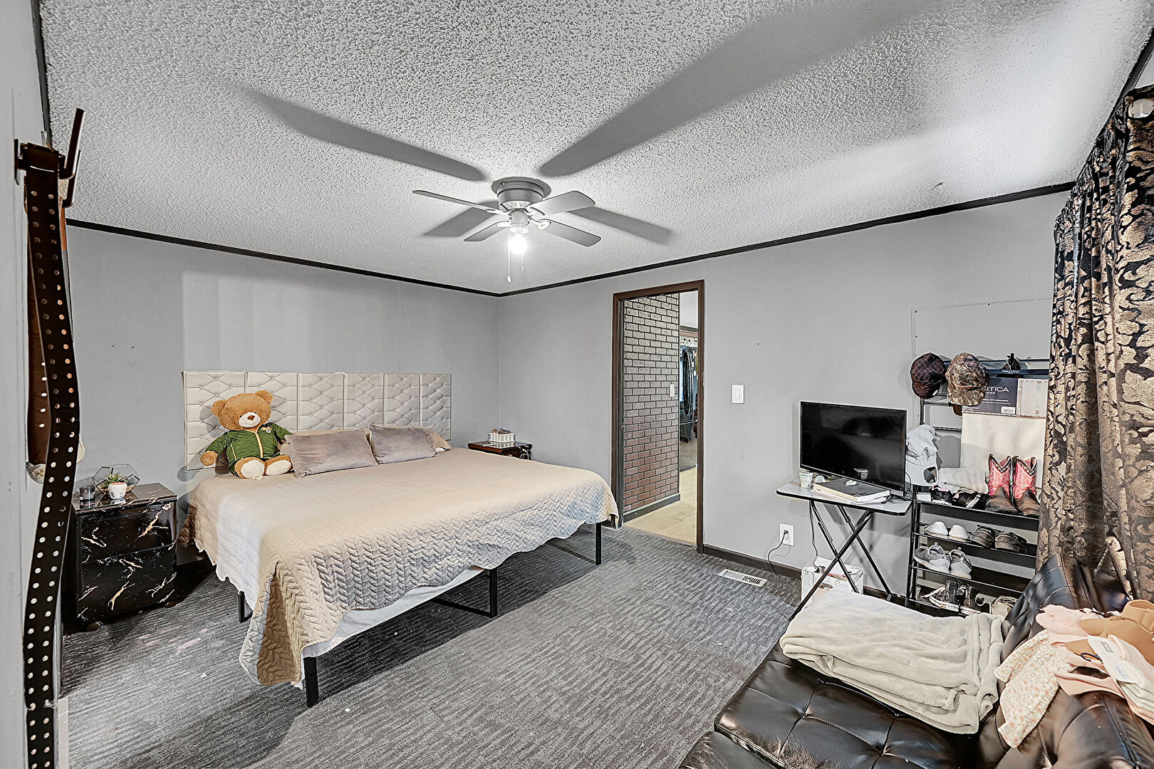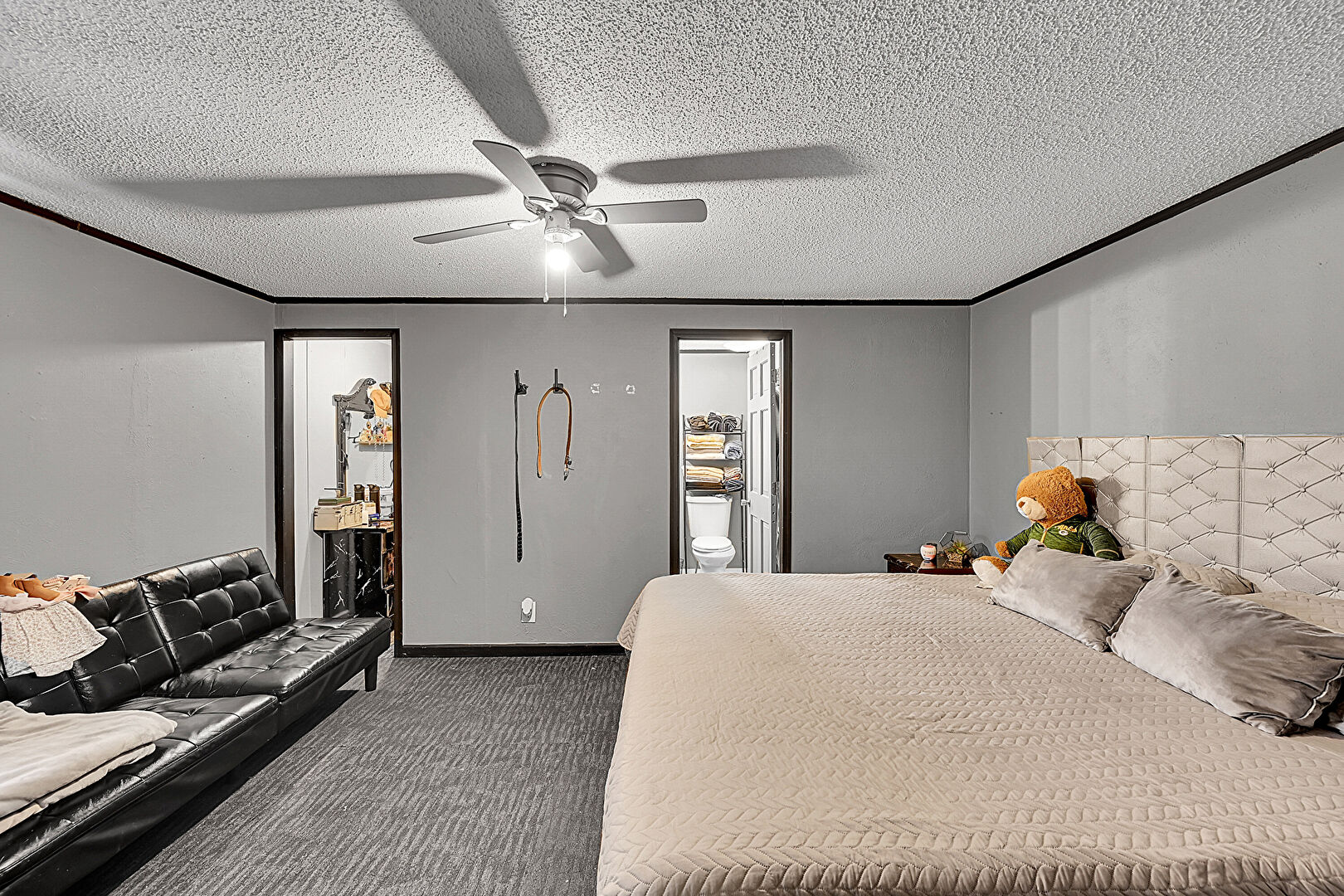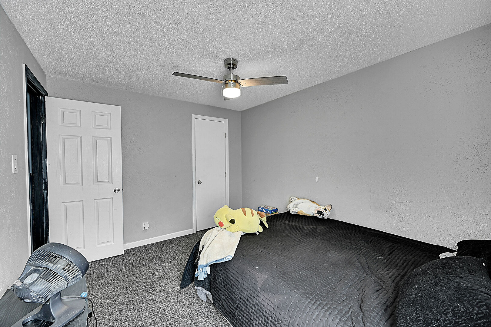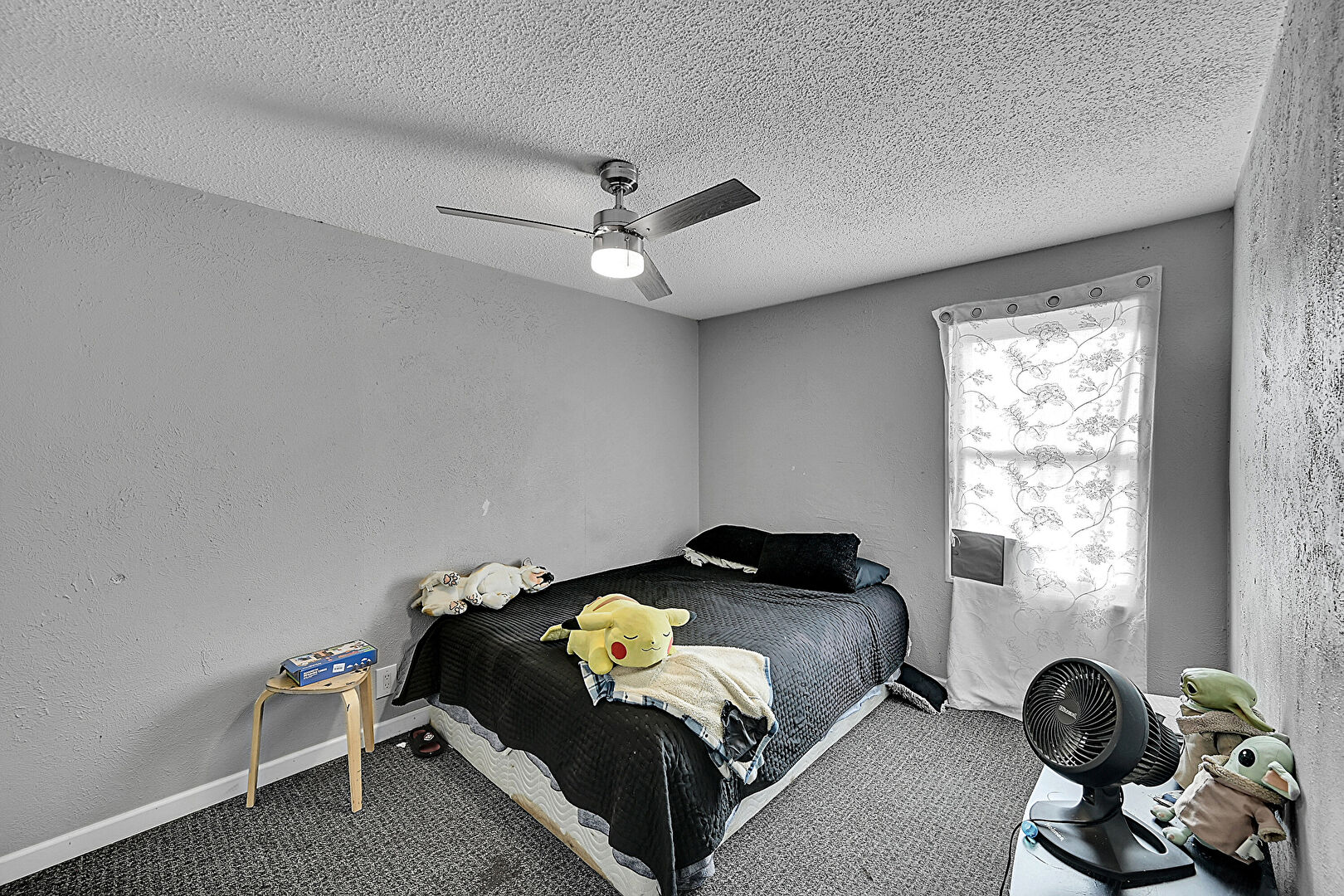 Baseboards Wall, Carpet, Ceiling Fan, Natural Light, Textured Ceiling, Textured Wall, Carpet, Textured Ceiling