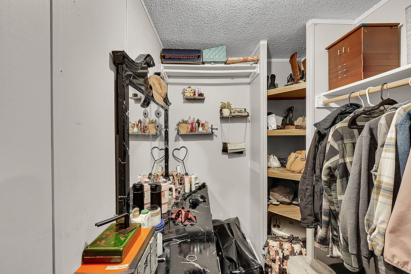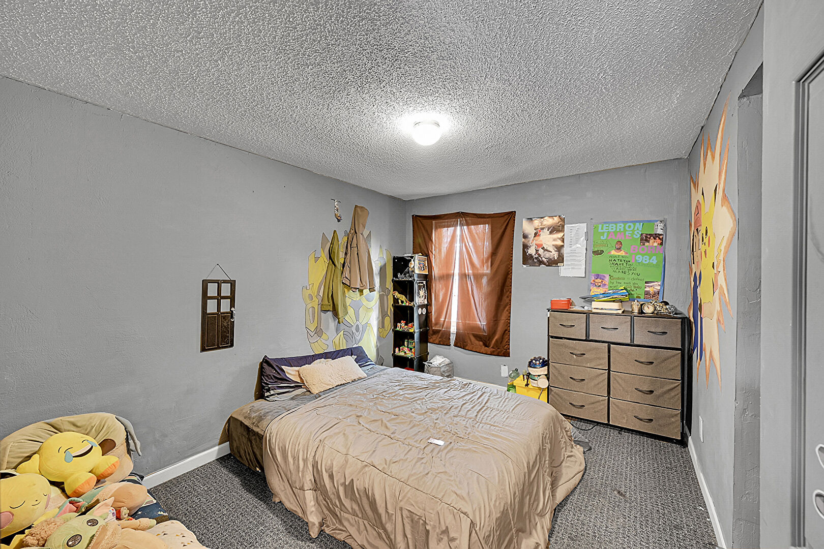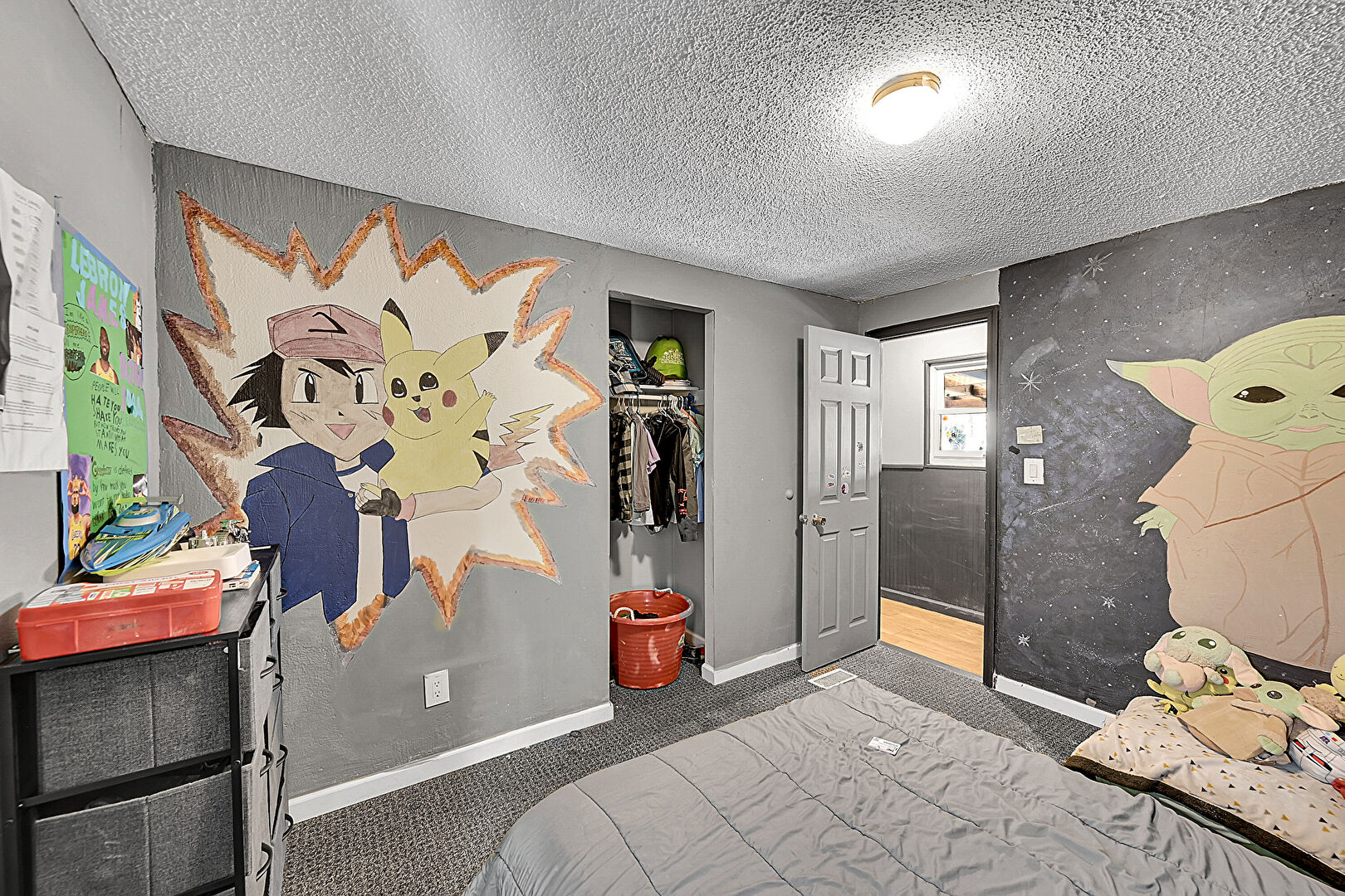 Accent Wall, Baseboards Wall, Carpet, Drywall, Textured Ceiling, Wallpaper Wall, Closet, Textured Ceiling