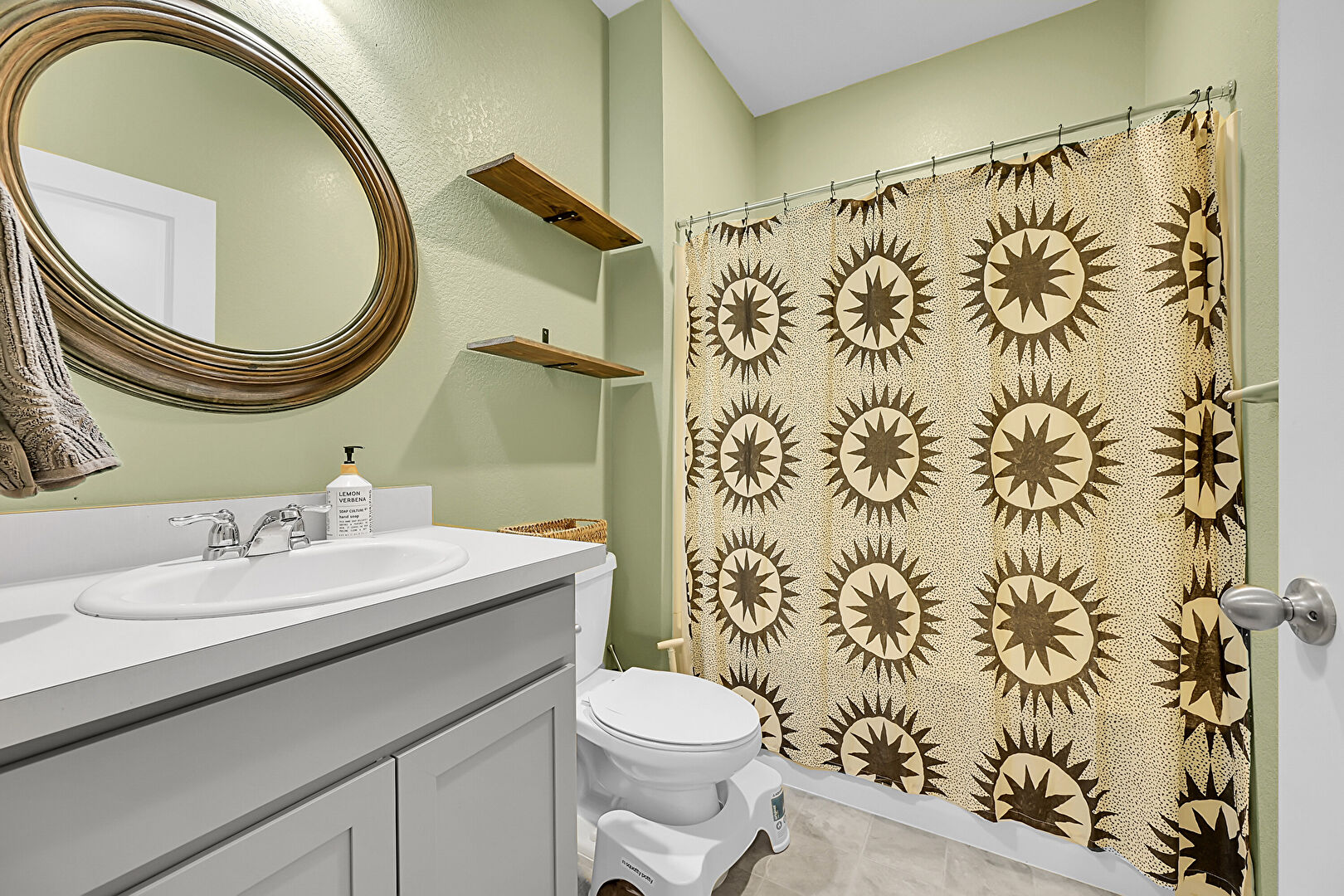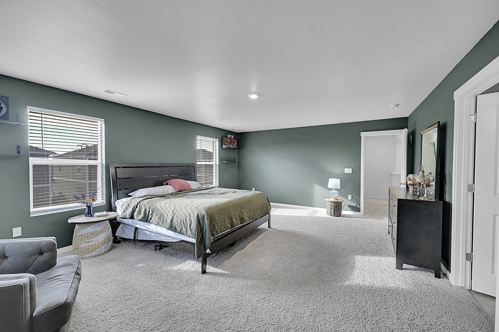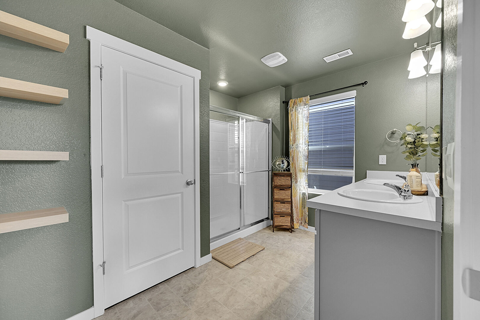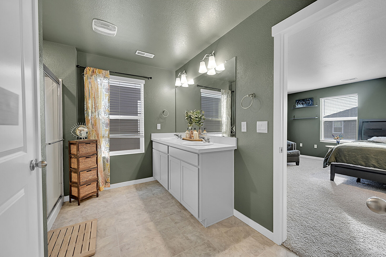 Baseboards Wall, Carpet, Double Vanity, Ensuite Bathroom, Full Bathroom, Textured Ceiling, Textured Wall, Vent, Vinyl Floor, Full Bathroom, Natural Light