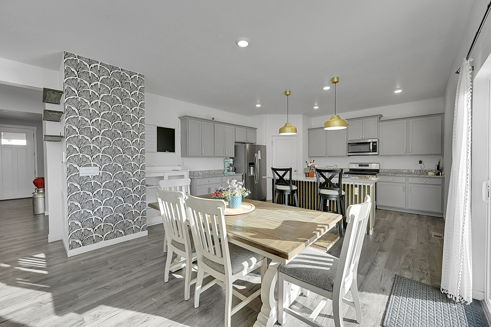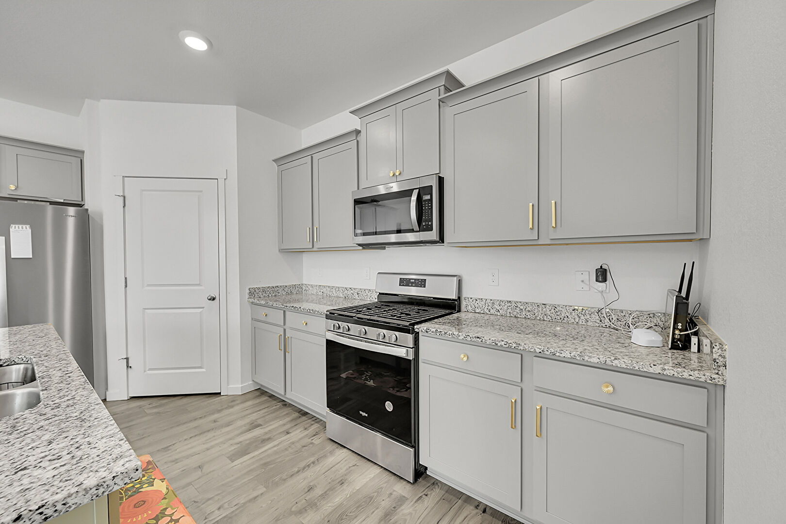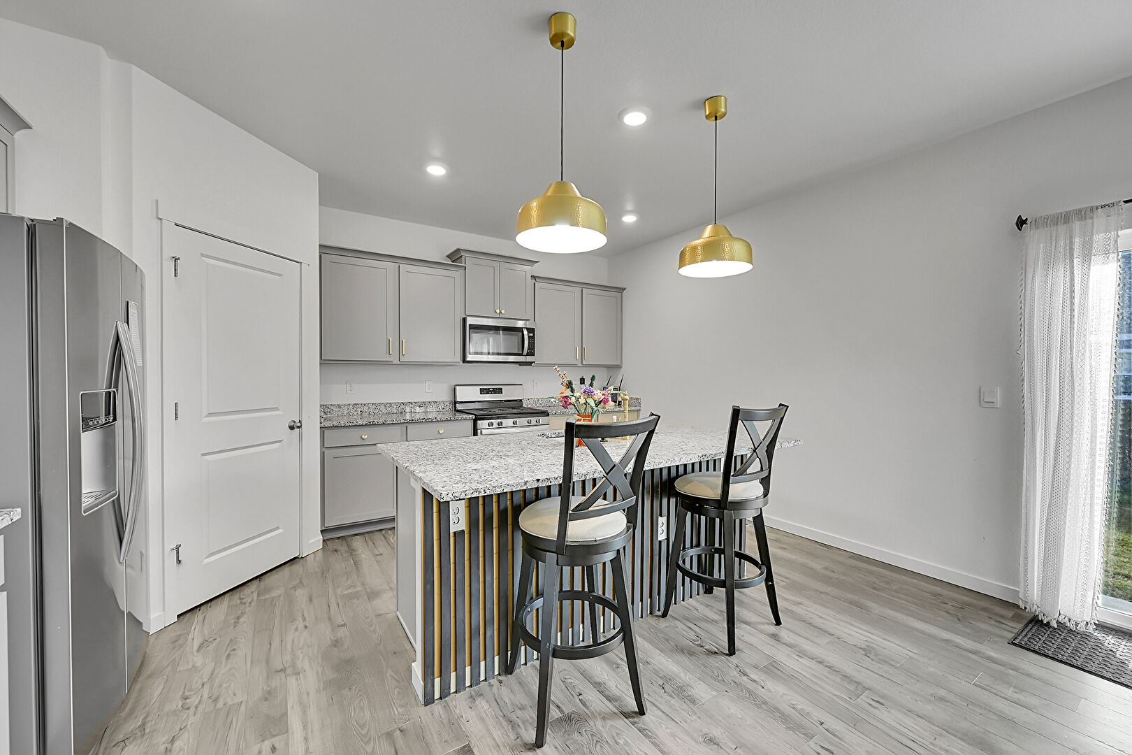 Baseboards Wall, Crown Molding Cabinets, Drywall, Gray Cabinets, Kitchen Bar, Kitchen Island, Pendant Lighting, Recessed Lighting, Shaker Cabinets, Stone Countertops, Wood Finish Floor, Natural Light, Recessed Lighting