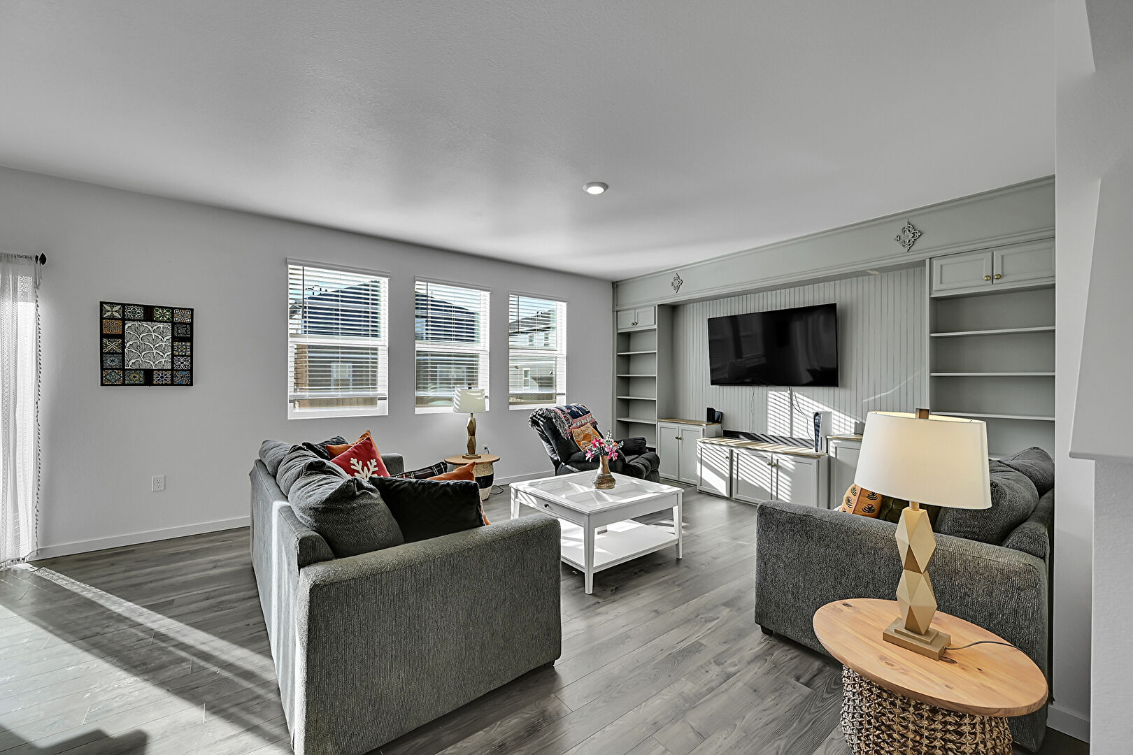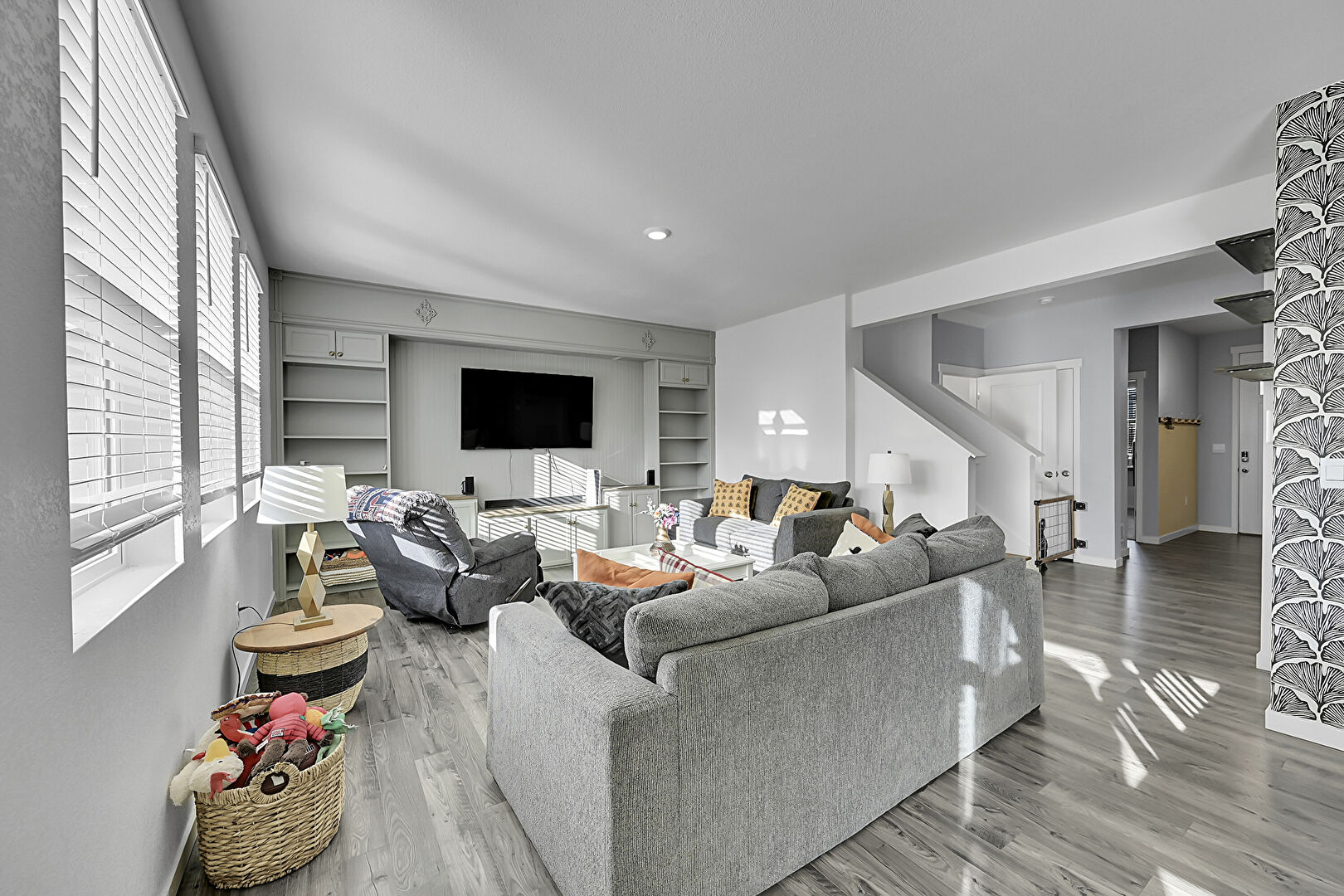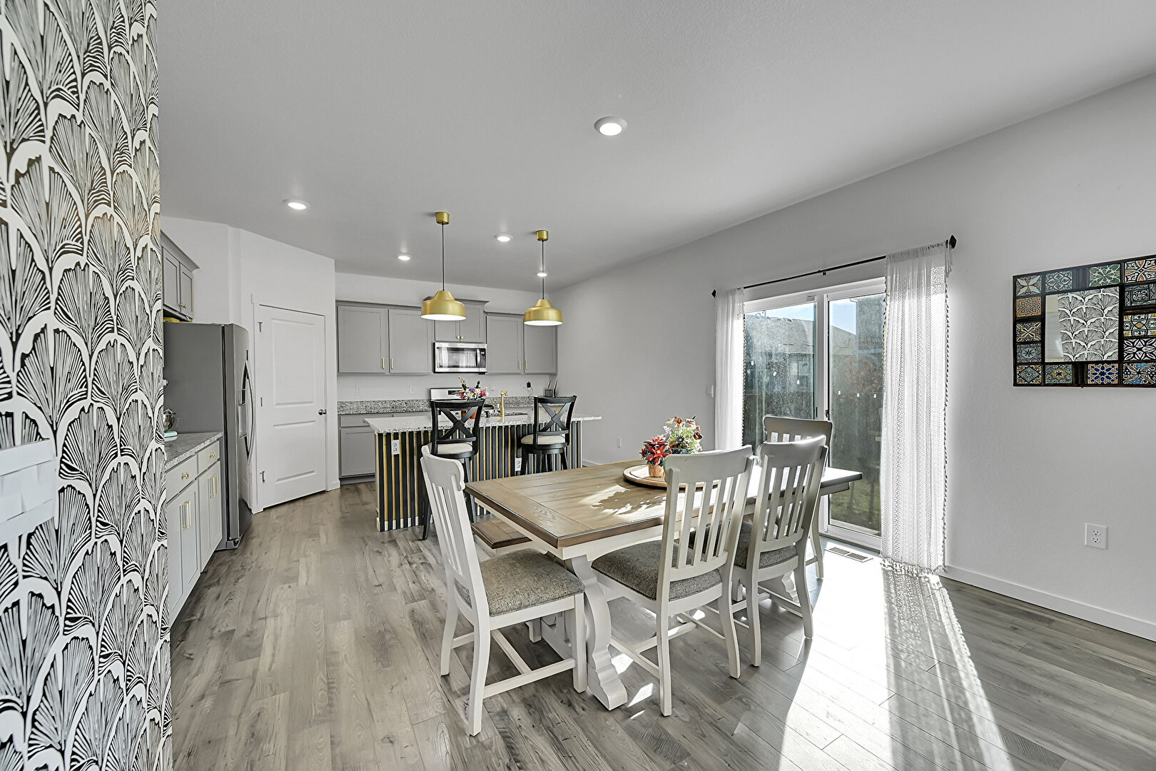Baseboards Wall, Crown Molding Cabinets, Drywall, Gray Cabinets, Kitchen Bar, Kitchen Island, Pendant Lighting, Recessed Lighting, Shaker Cabinets, Stone Countertops, Wood Finish Floor, Natural Light, Recessed Lighting