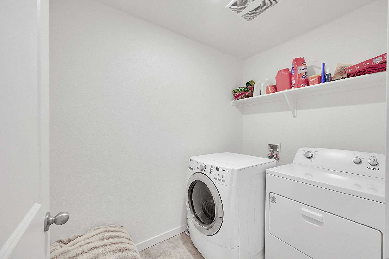 Baseboards Wall, Drywall, Laundry, Tile Floor, Washer Hookup, Vent