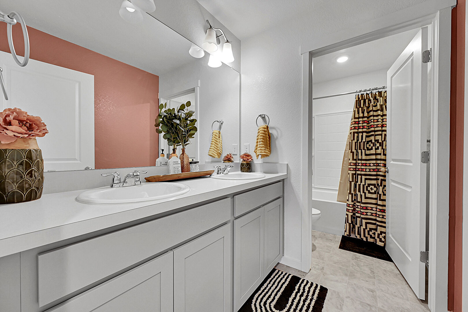 Combined Bath Shower, Drywall, Full Bathroom, Recessed Lighting, Tile Floor, Double Vanity
