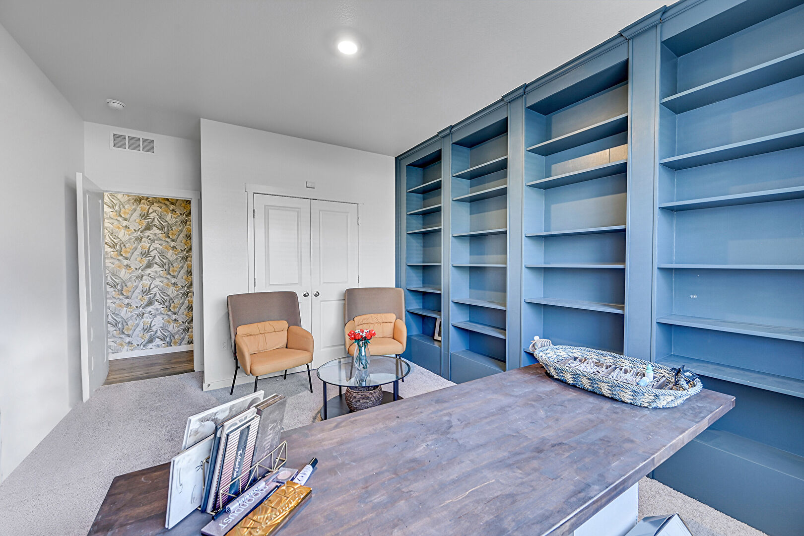 Baseboards Wall, Built In Shelves, Carpet, Drywall, Natural Light, Recessed Lighting, Vent, Baseboards Wall, Office Area