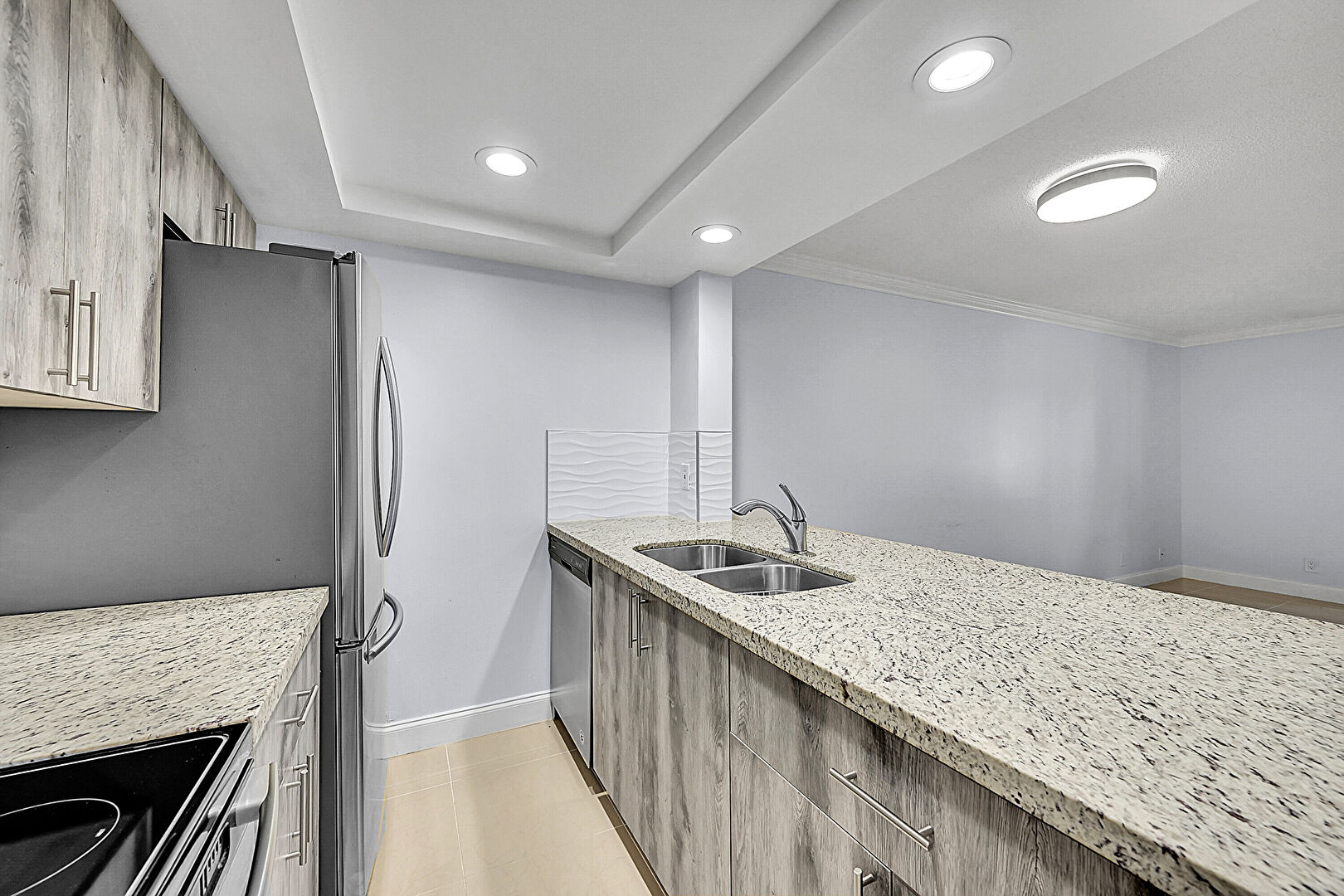 Baseboards Wall, Crown Molding, Drywall, Flat Panel Cabinets, Gray Cabinets, Kitchen Peninsula, Natural Light, Opens To Living Area, Recessed Lighting, Stone Countertops, Tile Floor, Tray Ceiling, Vent, Baseboards Wall, Drywall, Flat Panel Cabinets, Stone Countertops