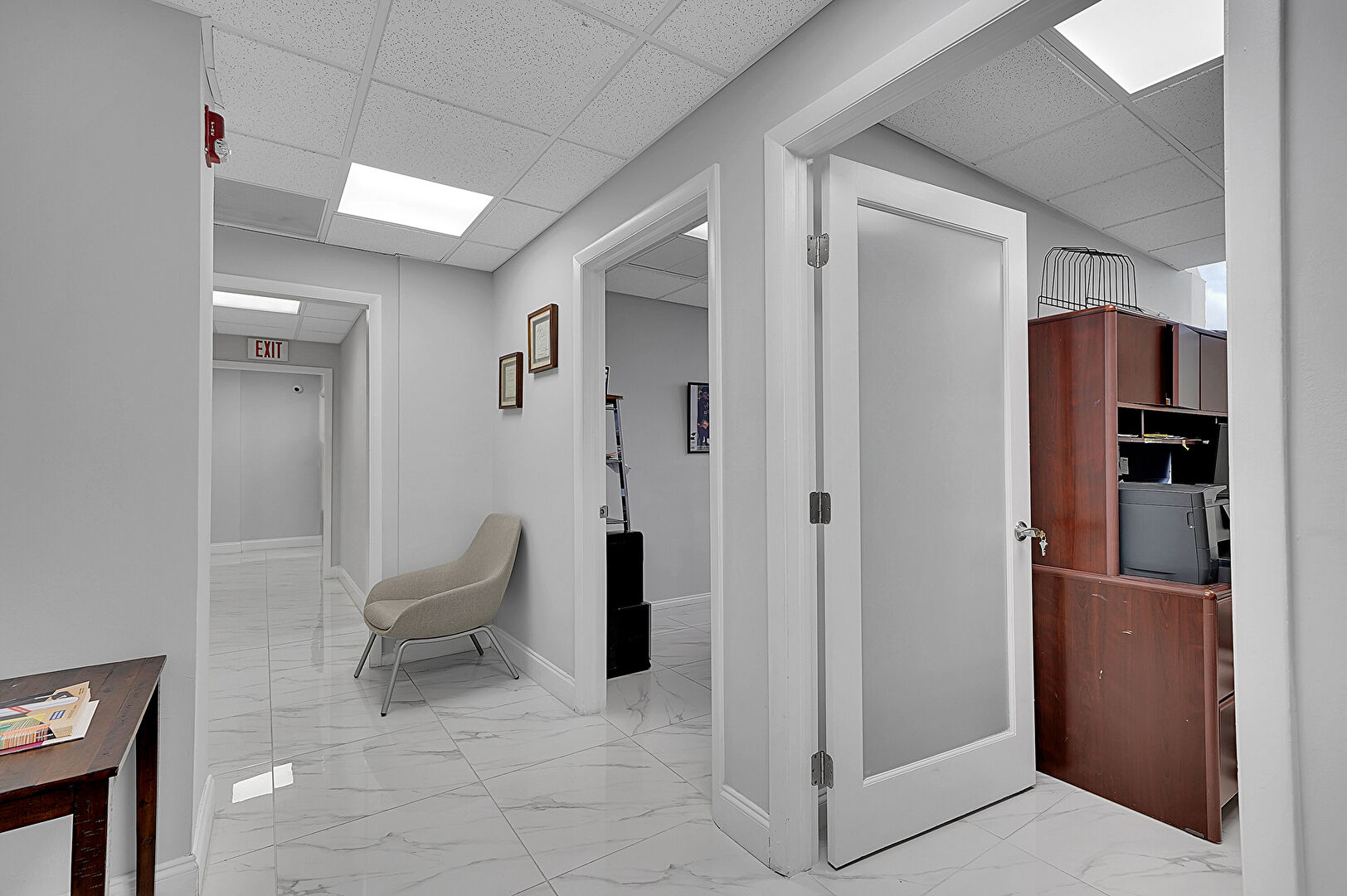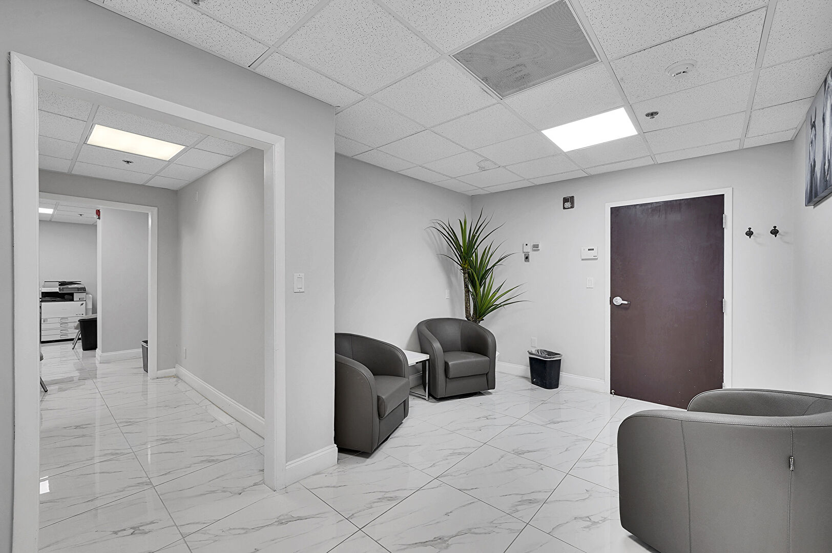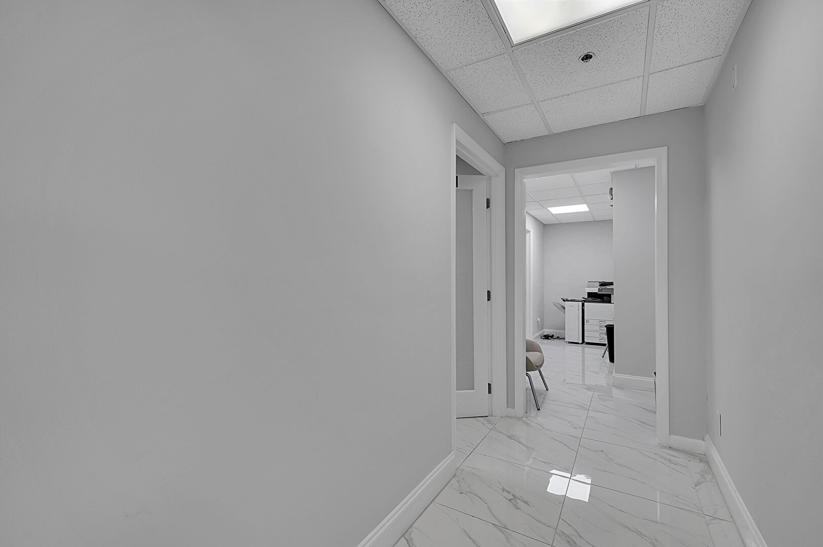 Baseboards Wall, Carpet, Drop Ceiling, Drywall, Elevator, Marble Finish Floor, Natural Light, Office Area, Recessed Lighting, Textured Wall, Tile Floor, Vent, Baseboards Wall, Drop Ceiling, Drywall, Elevator, Fire Alarm, Marble Finish Floor