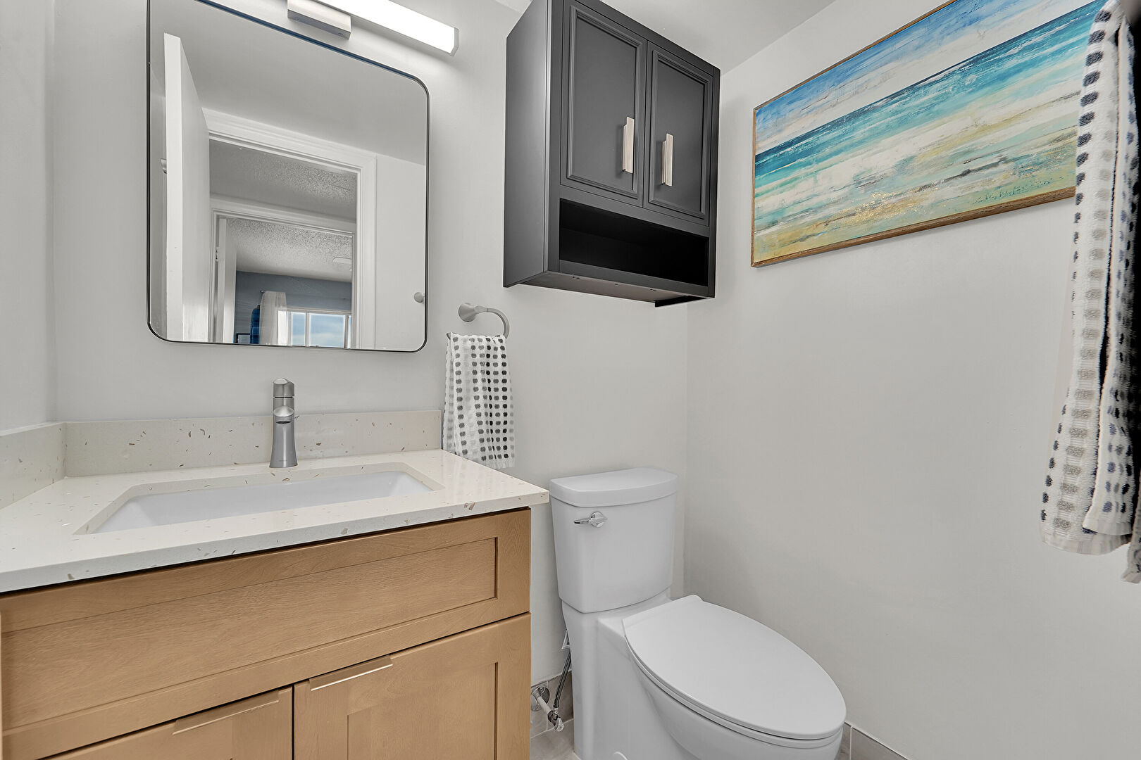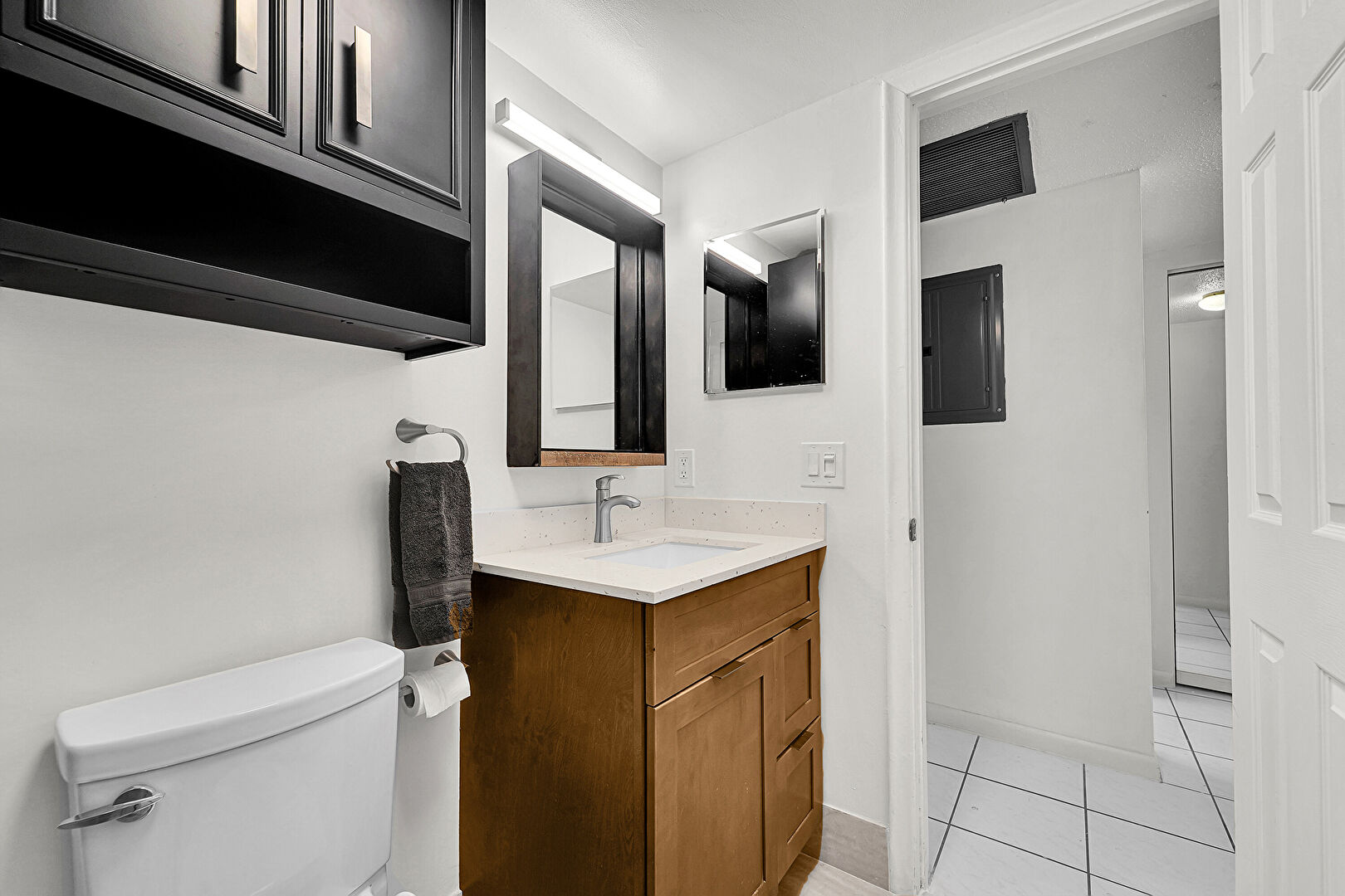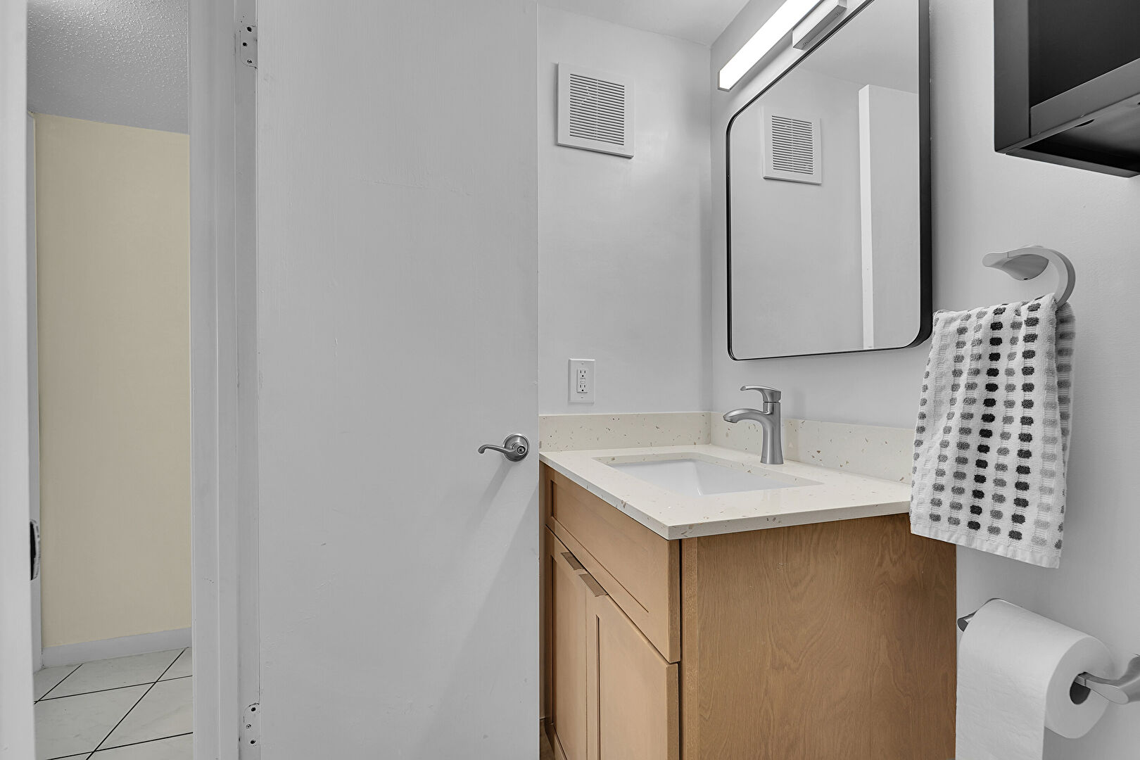 Baseboards Wall, Drywall, Half Bathroom, Textured Ceiling, Tile Floor, Vanity, Vent, Drywall, Vanity
