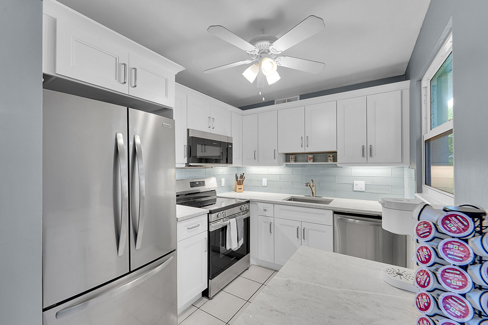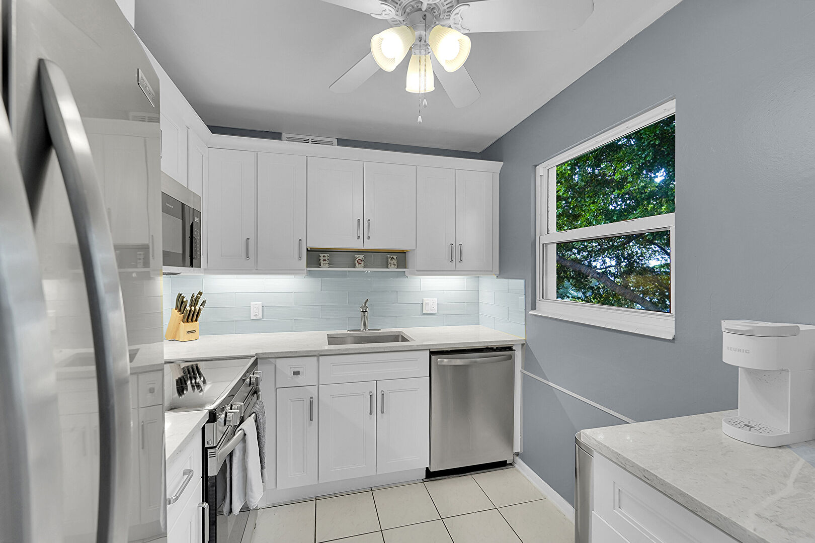 Baseboards Wall, Ceiling Fan, Crown Molding Cabinets, Drywall, Natural Light, Open Shelves, Shaker Cabinets, Stone Countertops, Tile Floor, Vent, Natural Light, Stone Countertops