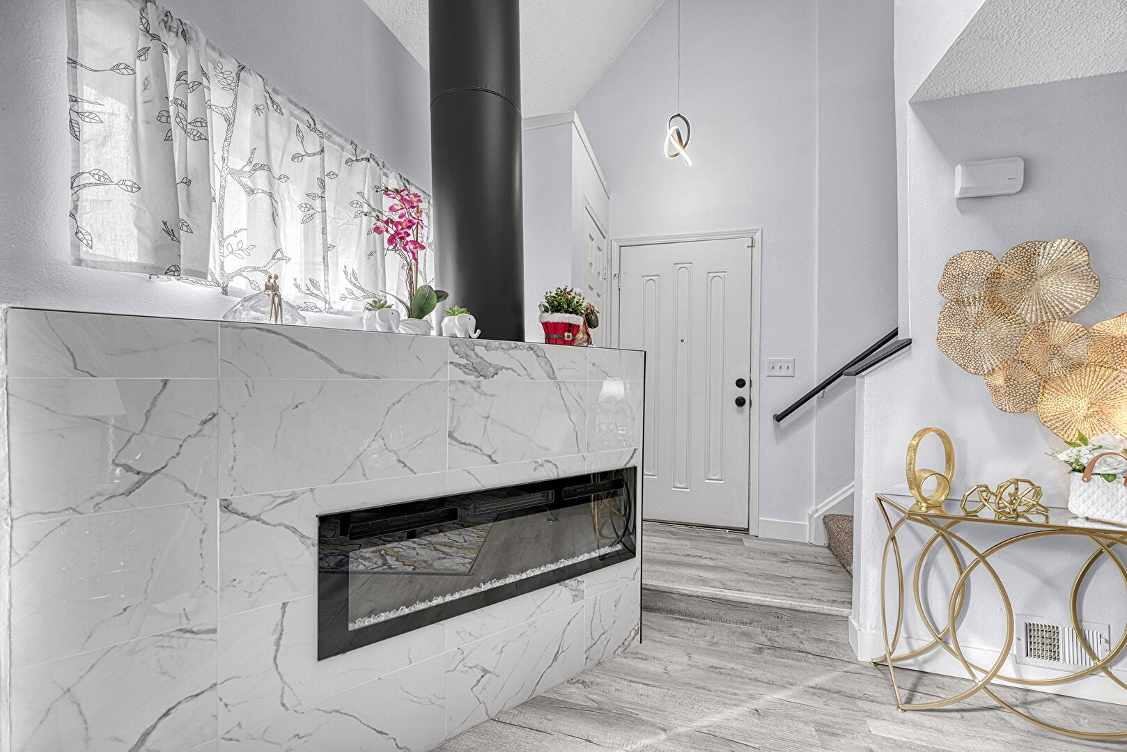 Baseboards Wall, Drywall, High Ceiling, Natural Light, Stairs, Vaulted Ceiling, Wood Finish Floor, Fireplace