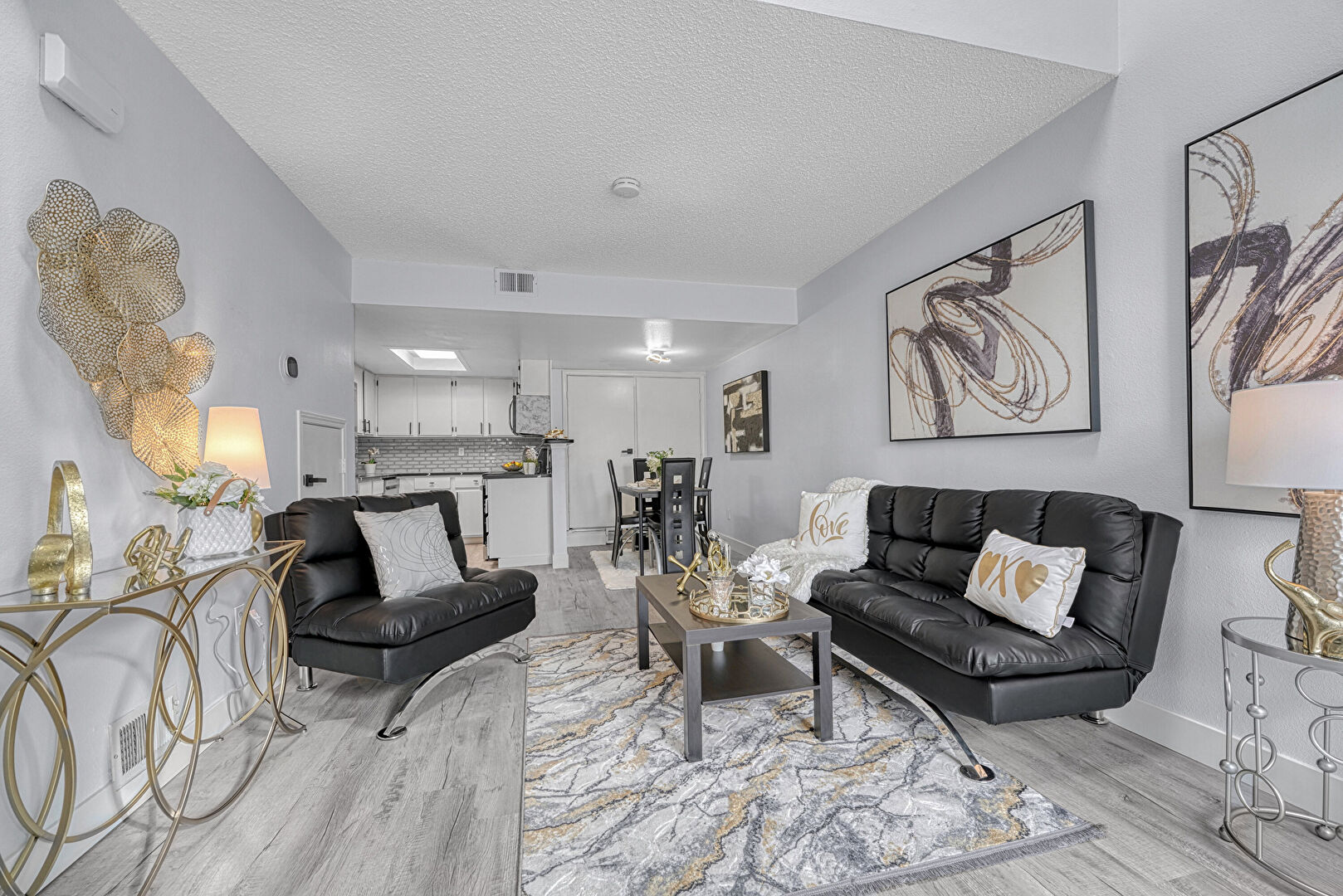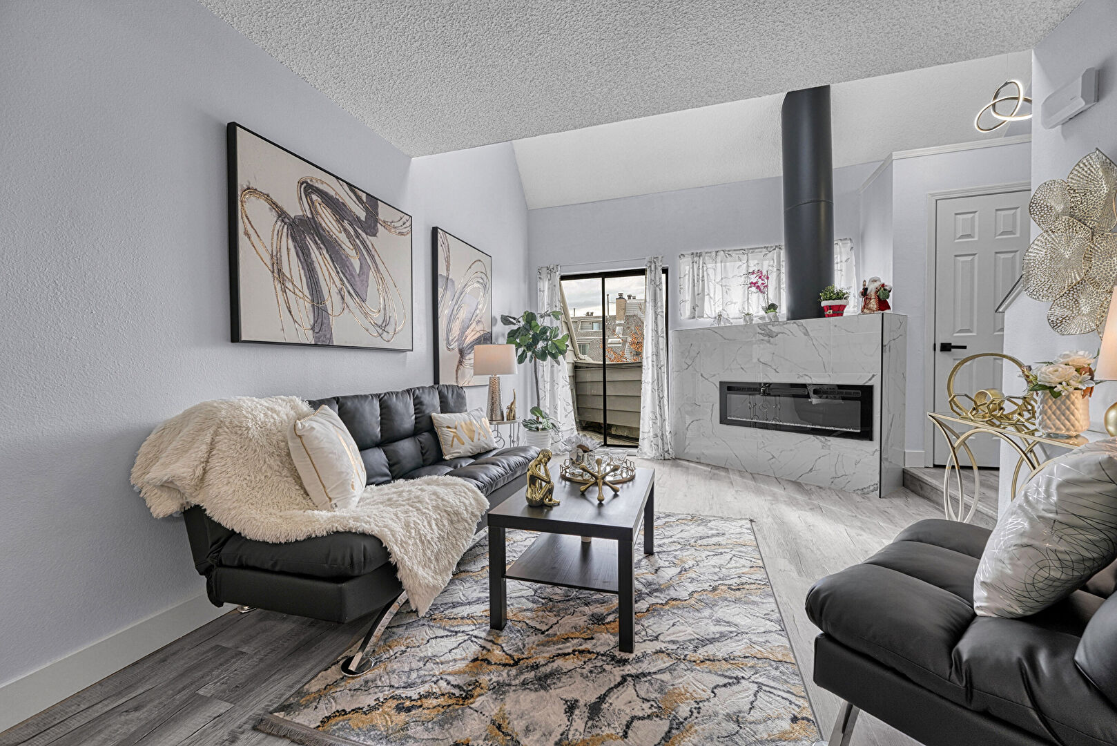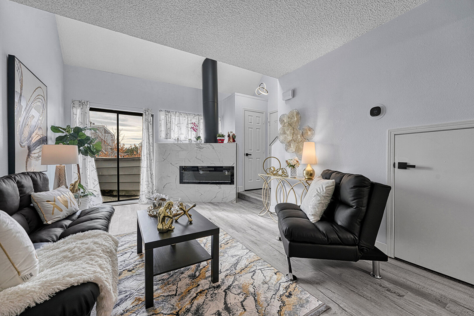 Baseboards Wall, Drywall, Fireplace, Natural Light, Smoke Carbon Monoxide Detector, Stairs, Textured Ceiling, Vaulted Ceiling, Vent, Wall Mounted Ac, Wood Finish Floor, Baseboards Wall, Fireplace, Textured Ceiling, Wood Stove