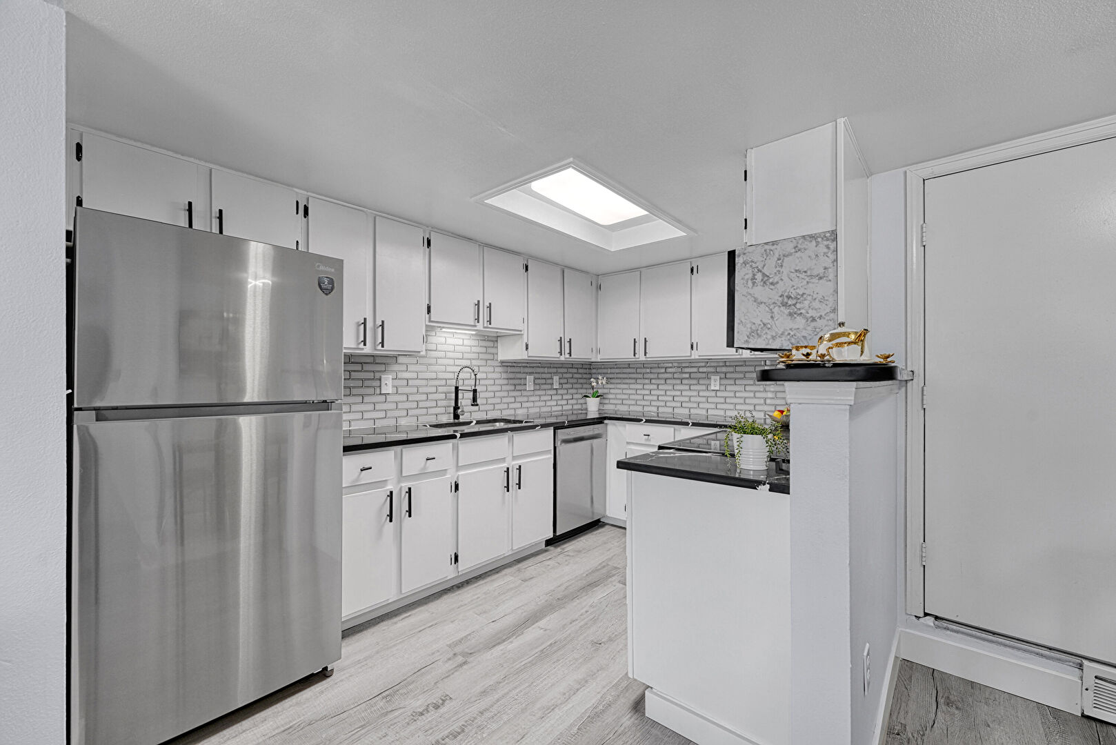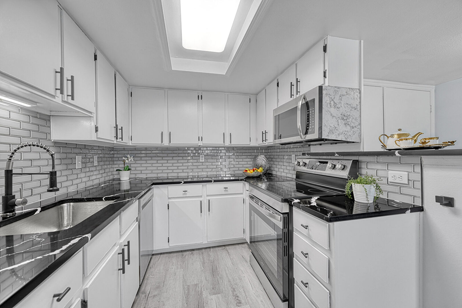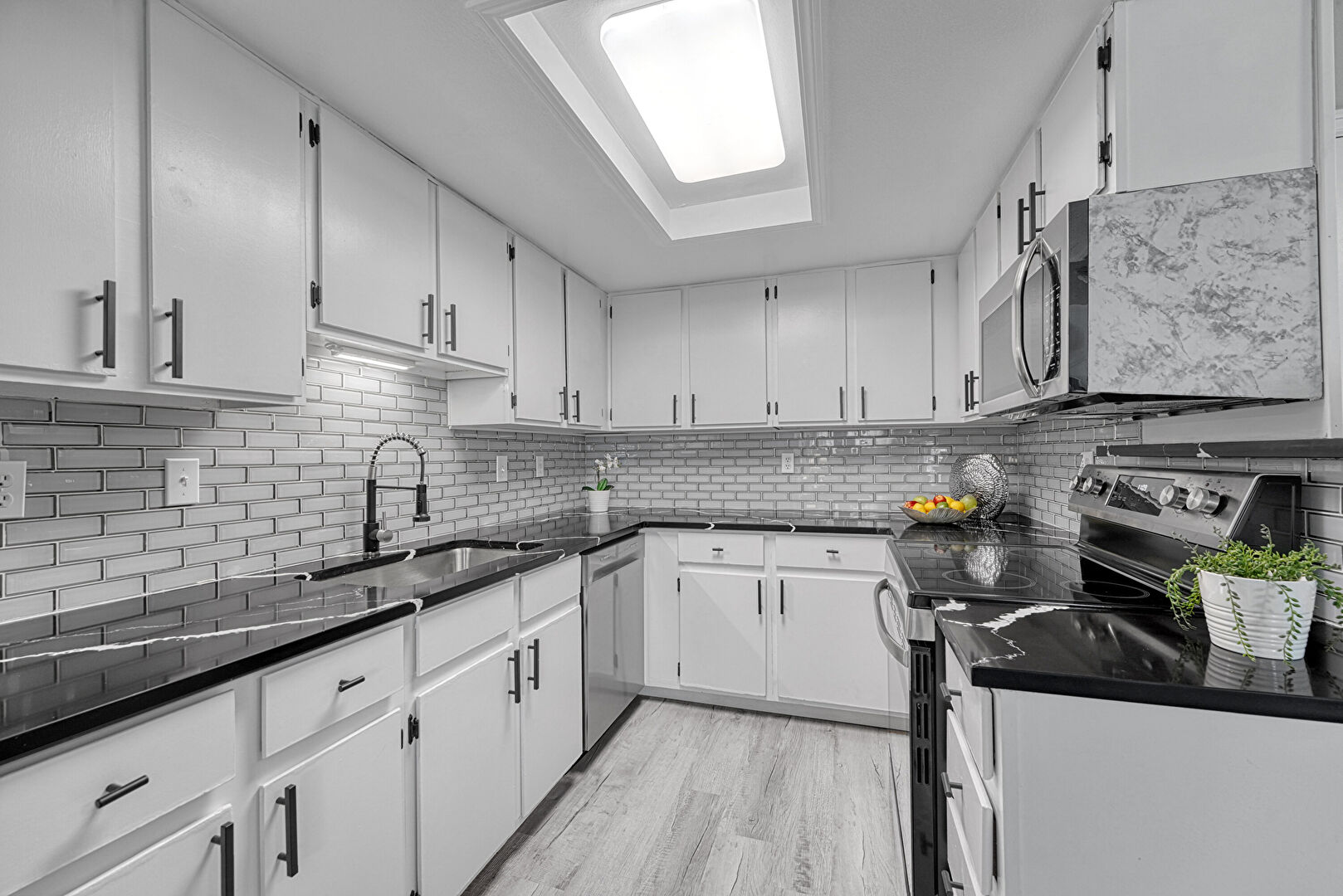 Baseboards Wall, Drywall, Natural Light, Opens To Living Area, Skylight, Stone Countertops, Textured Ceiling, Tray Ceiling, U Shaped Kitchen, Vent, Visible Hinge Cabinets, Wood Finish Floor, Drywall, Stone Countertops, Visible Hinge Cabinets