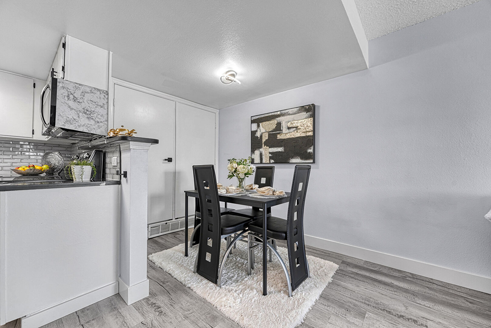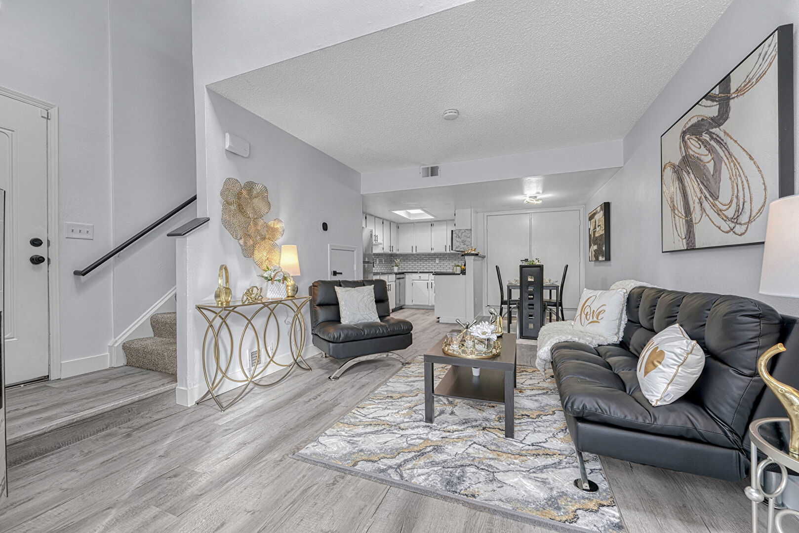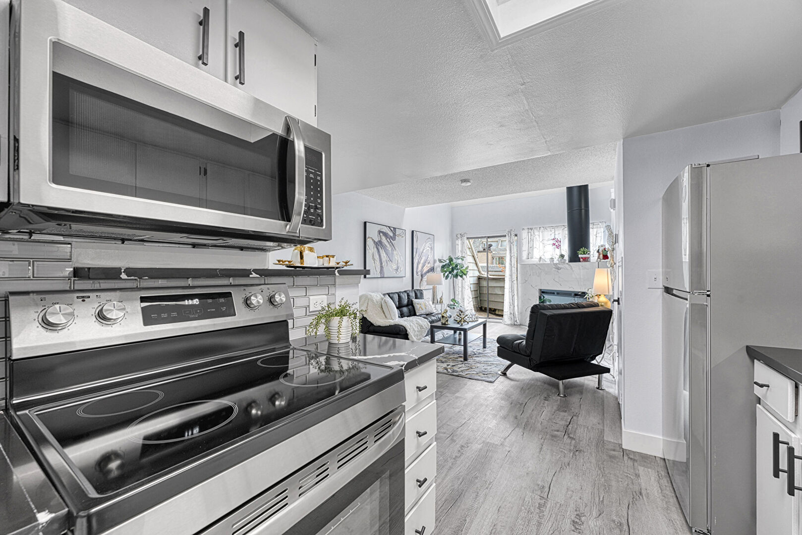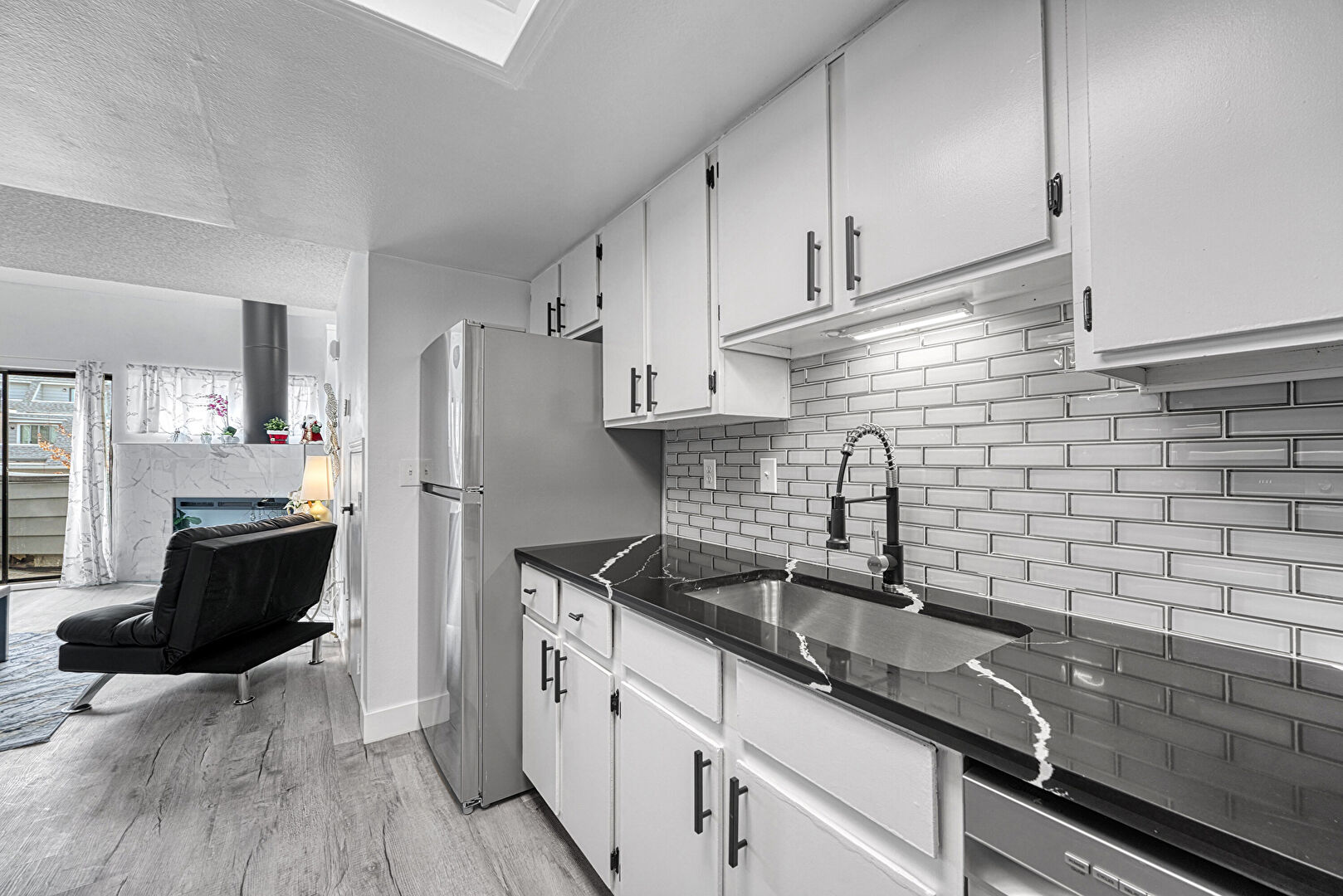 Baseboards Wall, Drywall, Natural Light, Opens To Living Area, Skylight, Stone Countertops, Textured Ceiling, Tray Ceiling, U Shaped Kitchen, Vent, Visible Hinge Cabinets, Wood Finish Floor, Drywall, Stone Countertops, Visible Hinge Cabinets