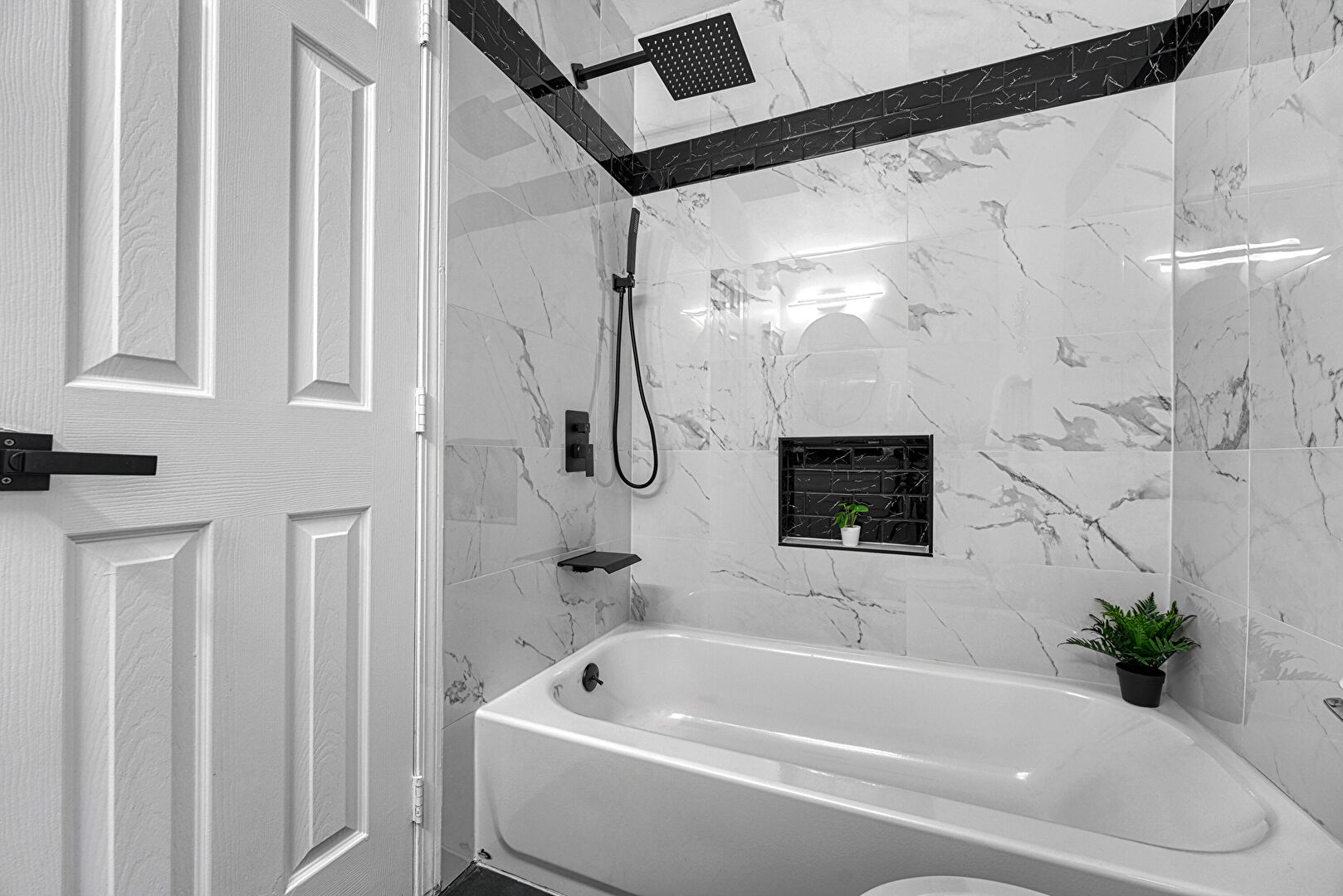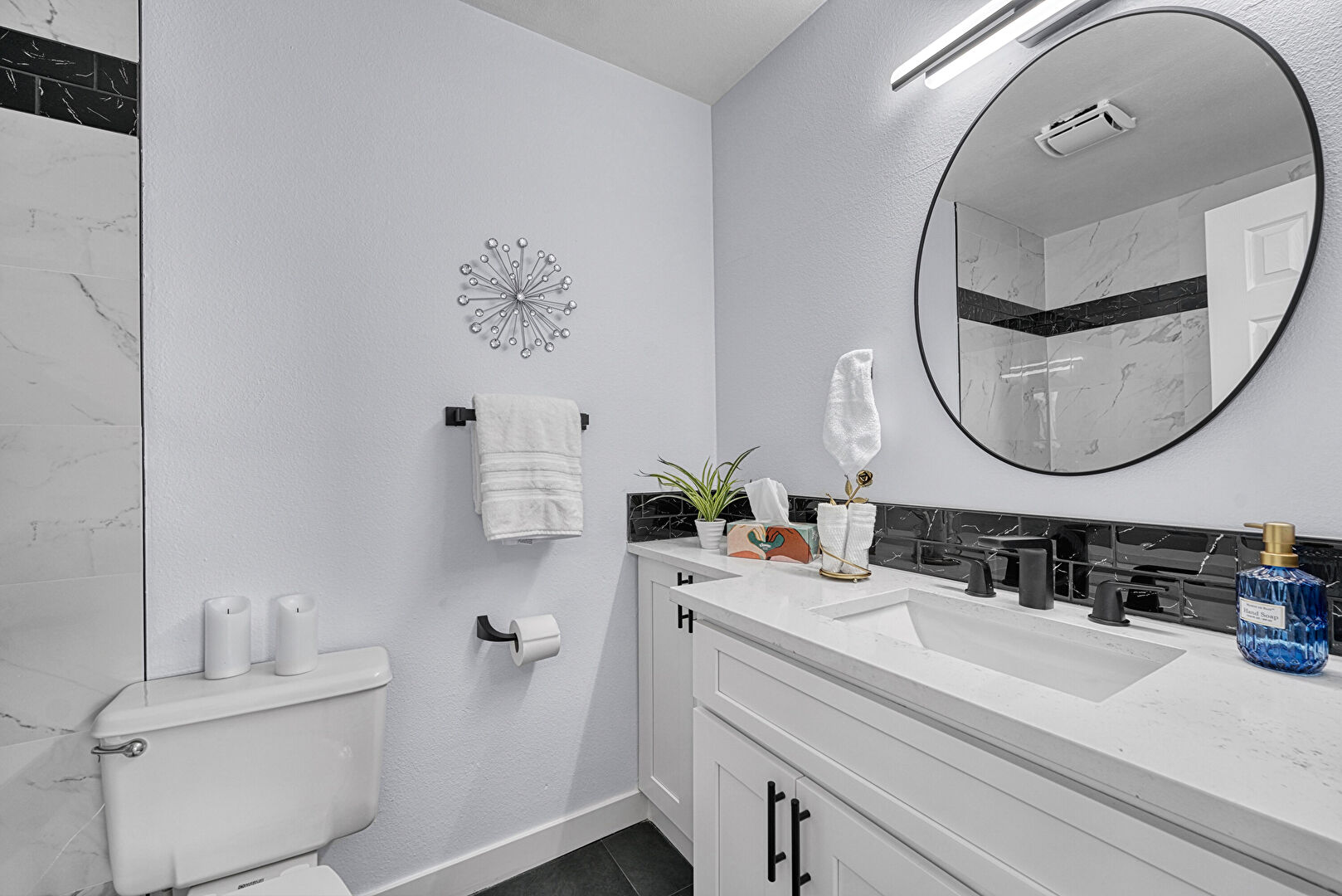 Baseboards Wall, Combined Bath Shower, Full Bathroom, Textured Wall, Vent, Full Bathroom, Vanity
