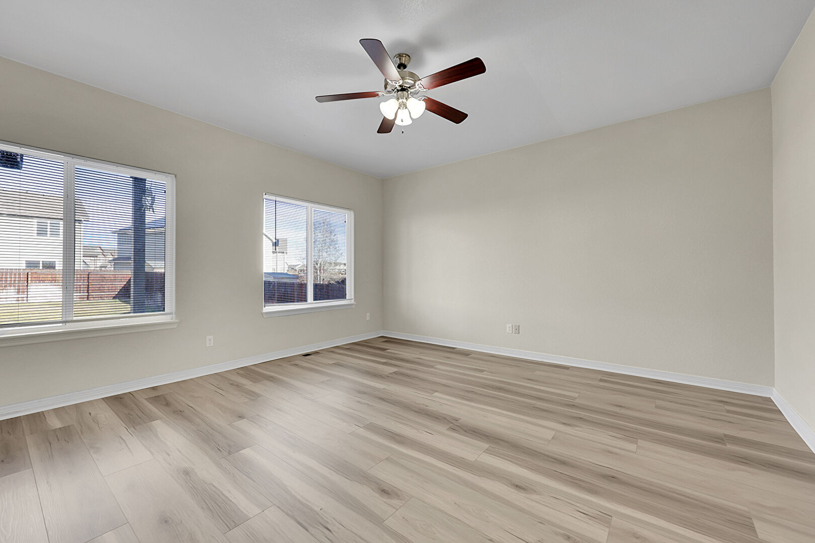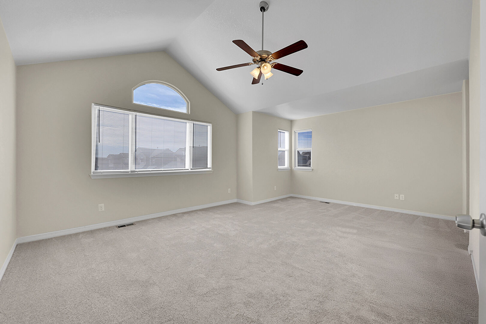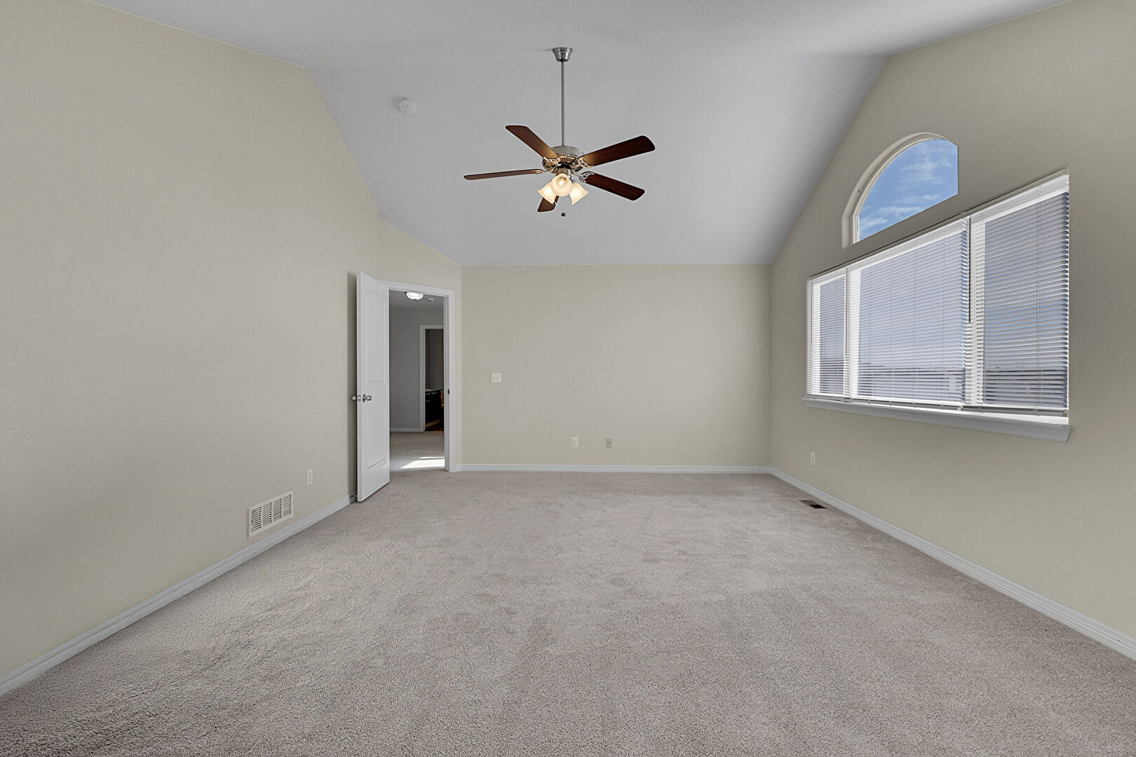 Baseboards Wall, Carpet, Cathedral Ceiling, Ceiling Fan, Drywall, High Ceiling, Natural Light, Vaulted Ceiling, Vent, Cathedral Ceiling, Ceiling Fan, Drywall