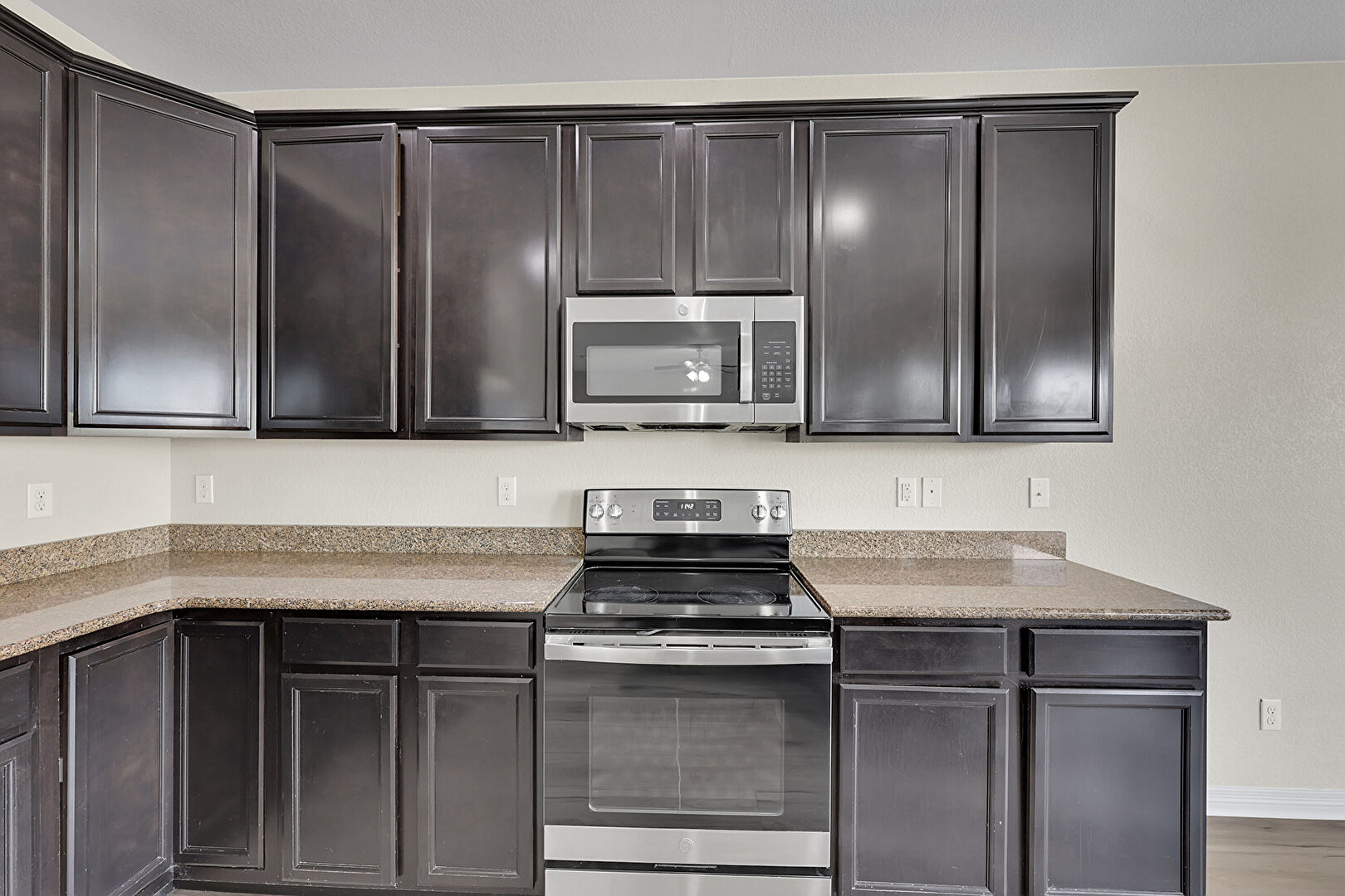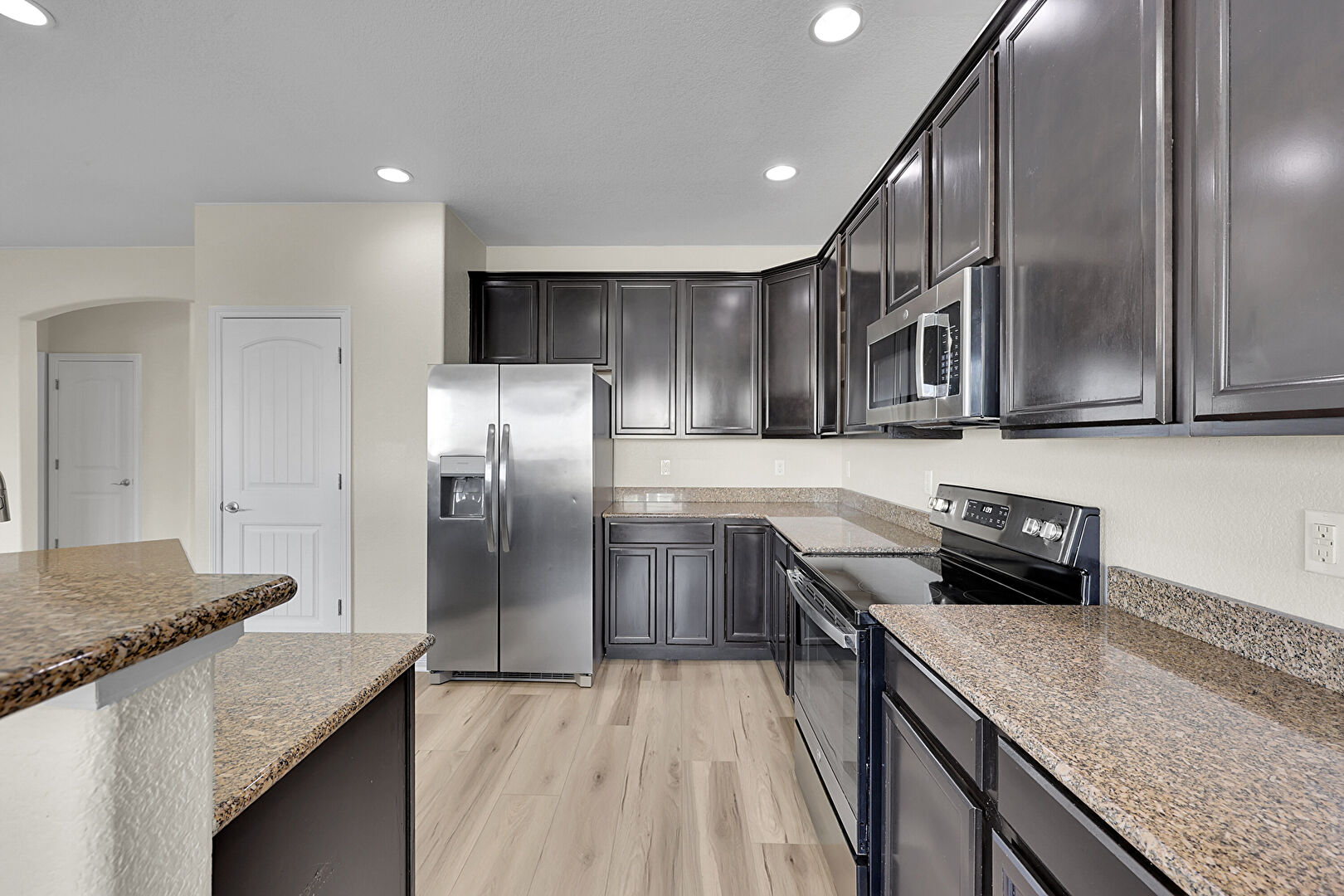 Arched Walkways, Baseboards Wall, Black Cabinets, Ceiling Fan, Crown Molding Cabinets, Dark Brown Cabinets, Drywall, Kitchen Island, Natural Light, Notable Chandelier, Pendant Lighting, Recessed Lighting, Shaker Cabinets, Stone Countertops, Textured Ceiling, Vent, Wood Finish Floor, Baseboards Wall, Black Cabinets, Crown Molding Cabinets, Opens To Living Area