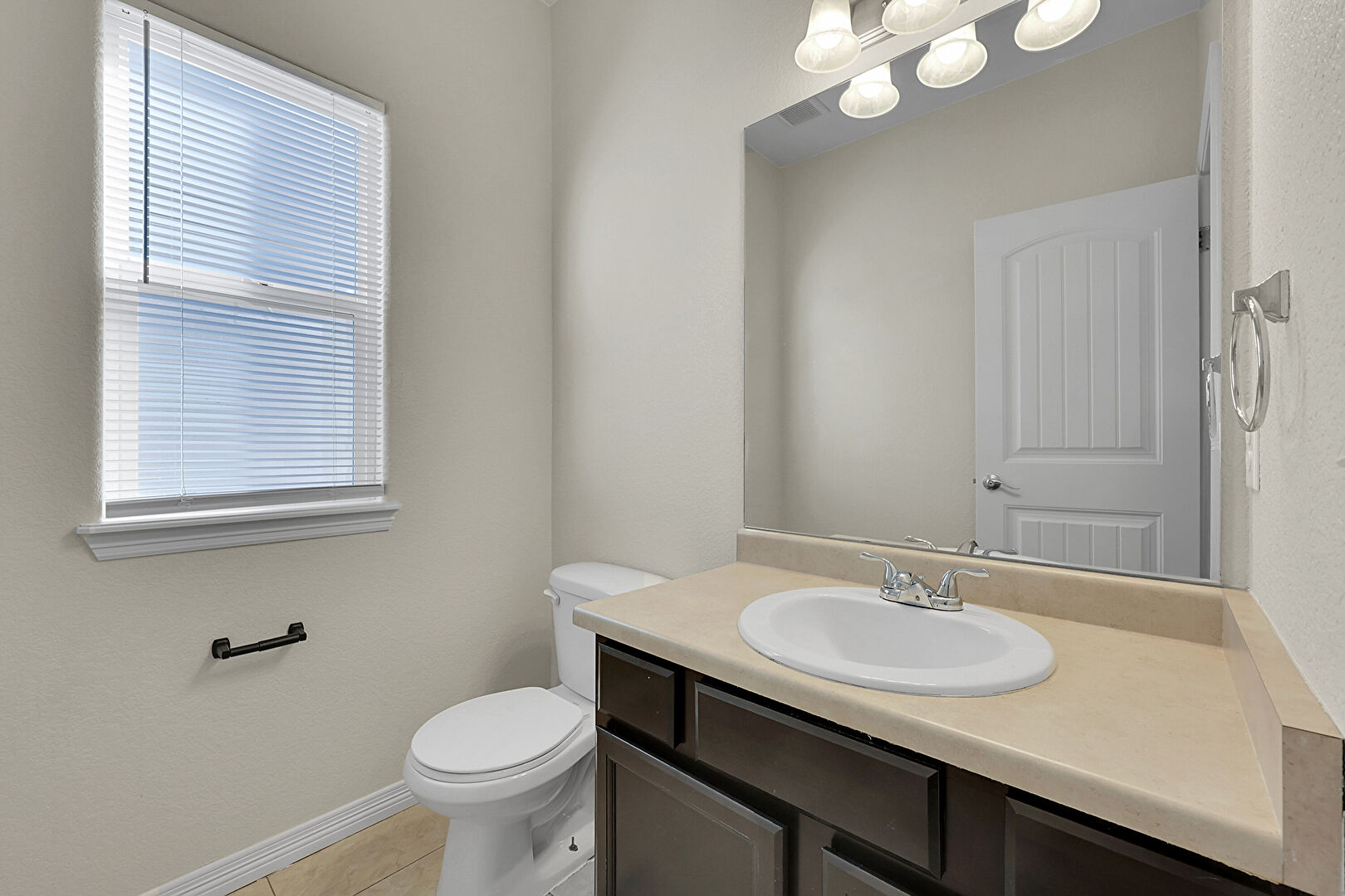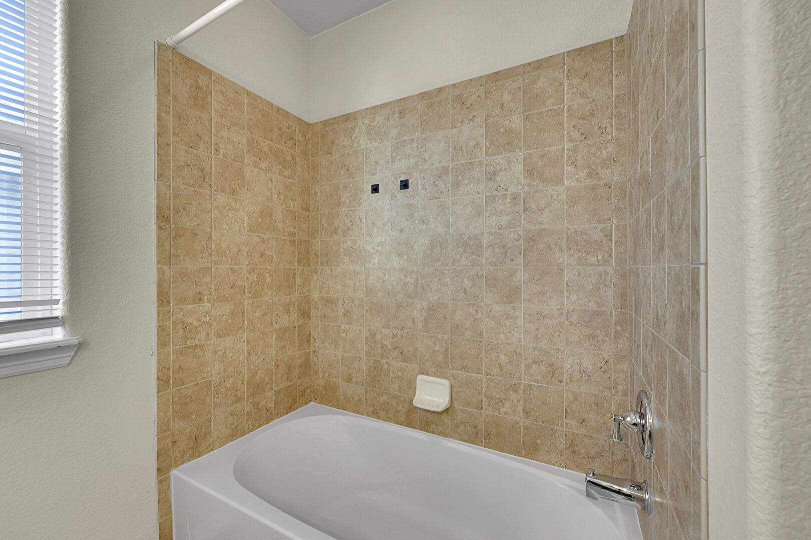Baseboards Wall, Combined Bath Shower, Drywall, Full Bathroom, Half Bathroom, Natural Light, Textured Wall, Vanity, Vent, Natural Light, Textured Wall, Tile Floor