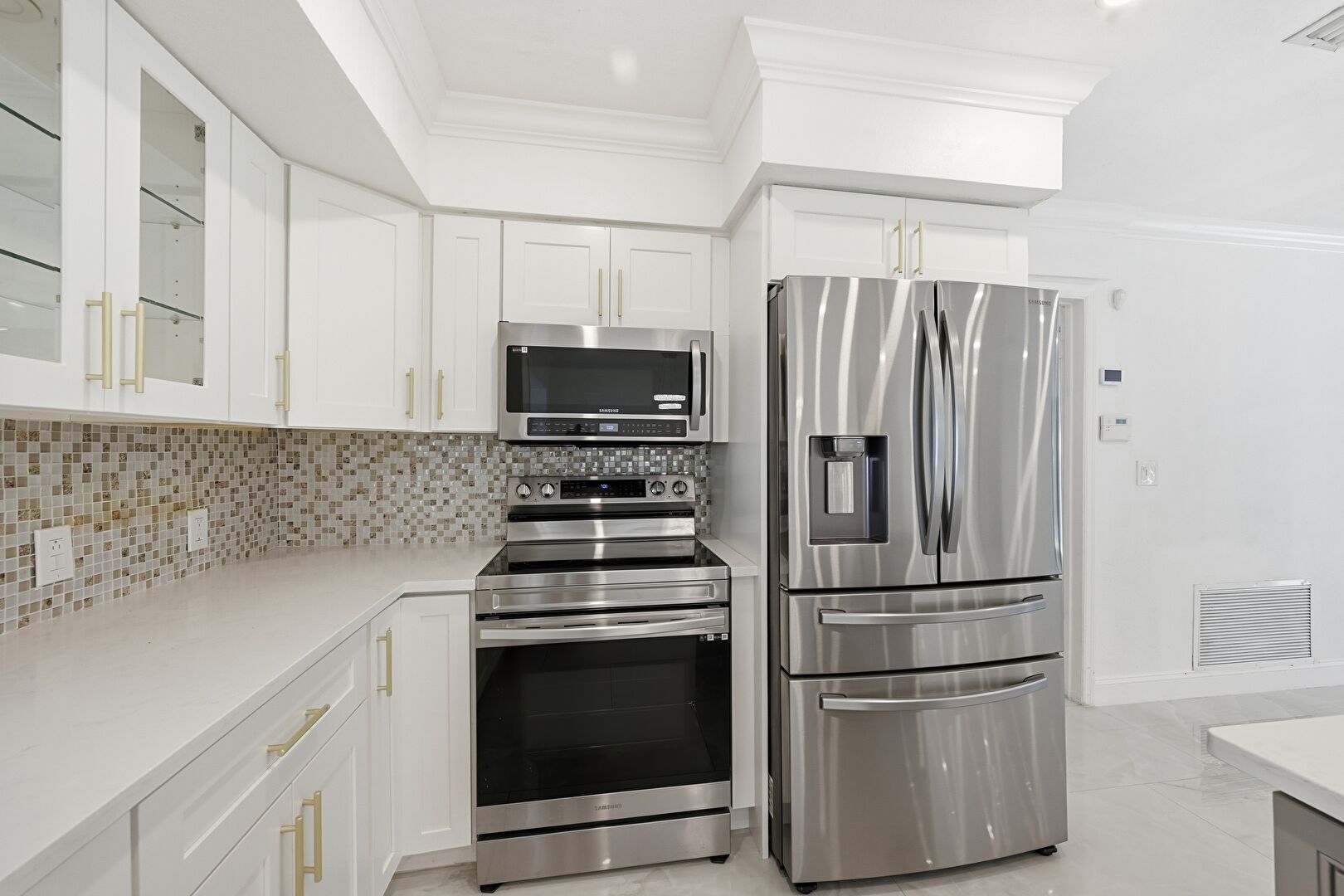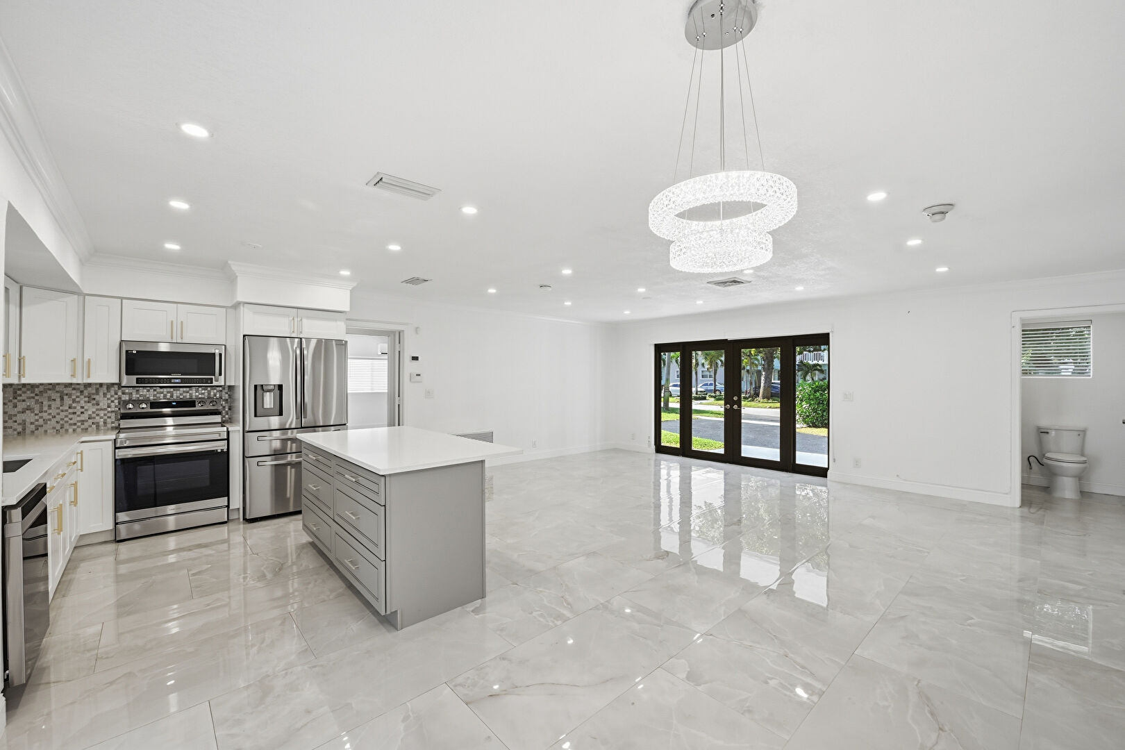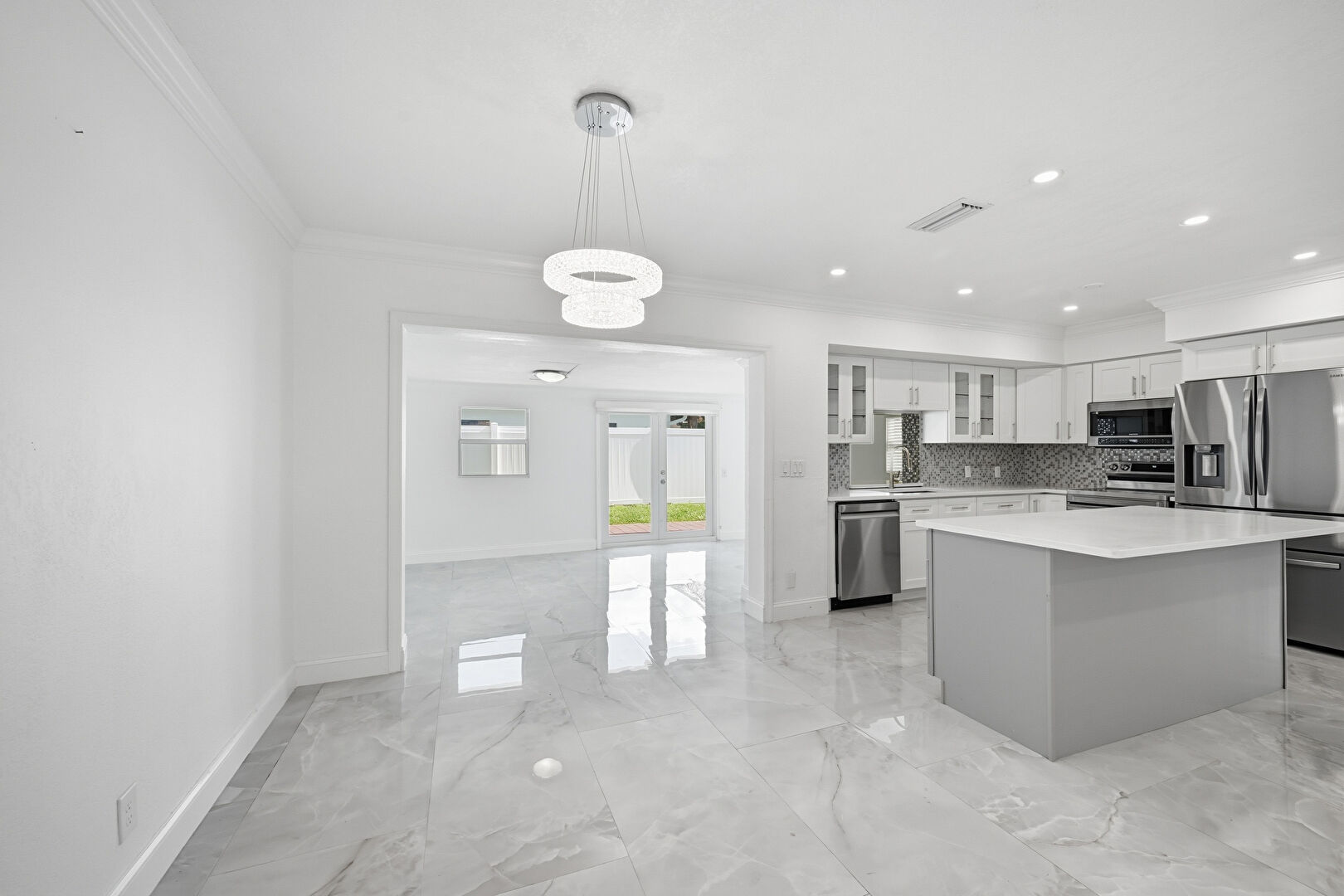Baseboards Wall, Crown Molding, Drywall, French Doors, Glass Insert Cabinets, Gray Cabinets, Kitchen Island, L Shaped Kitchen, Marble Finish Floor, Natural Light, Pendant Lighting, Recessed Lighting, Shaker Cabinets, Stone Countertops, Vent, Notable Chandelier