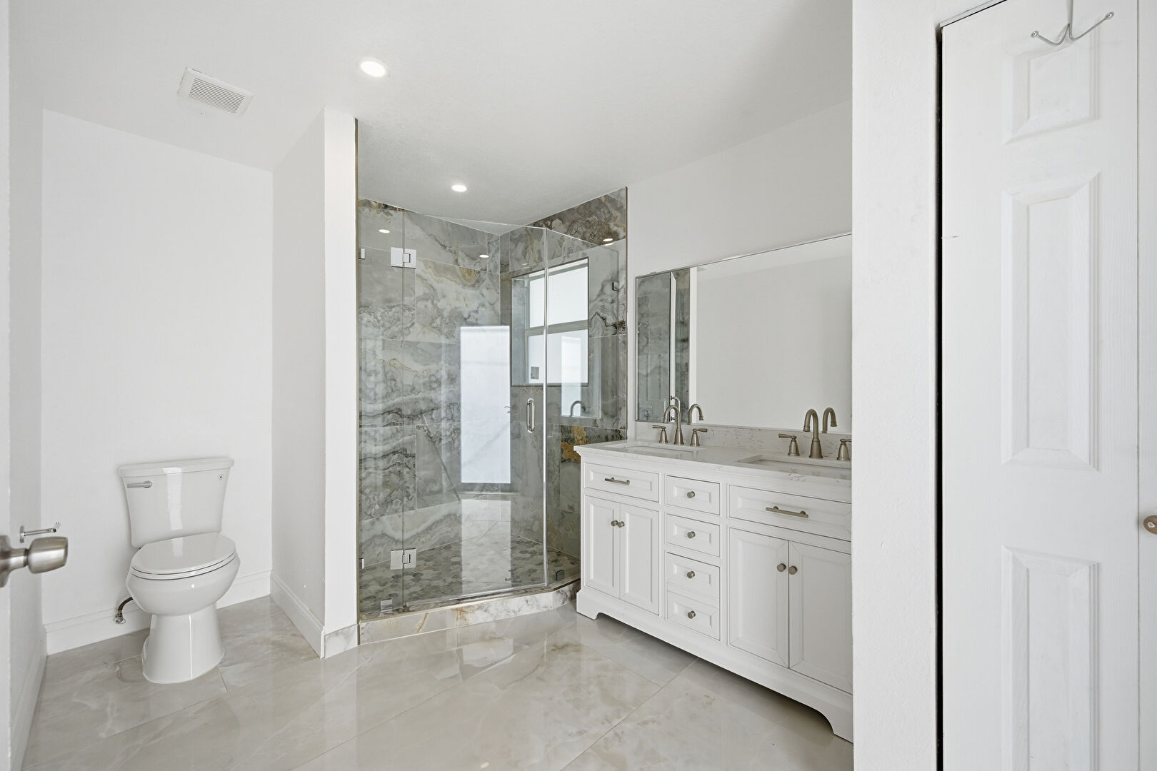 Baseboards Wall, Closet, Double Vanity, Drywall, Full Bathroom, Marble Finish Floor, Natural Light, Recessed Lighting, Vent, Double Vanity, Drywall