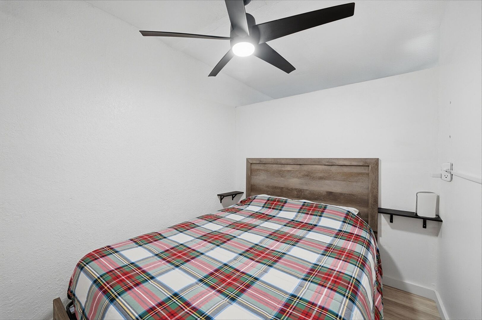 Barn Door, Baseboards Wall, Ceiling Fan, Natural Light, Textured Wall, Vaulted Ceiling, Wood Finish Floor, Wall Mounted Ac, Wood Finish Floor