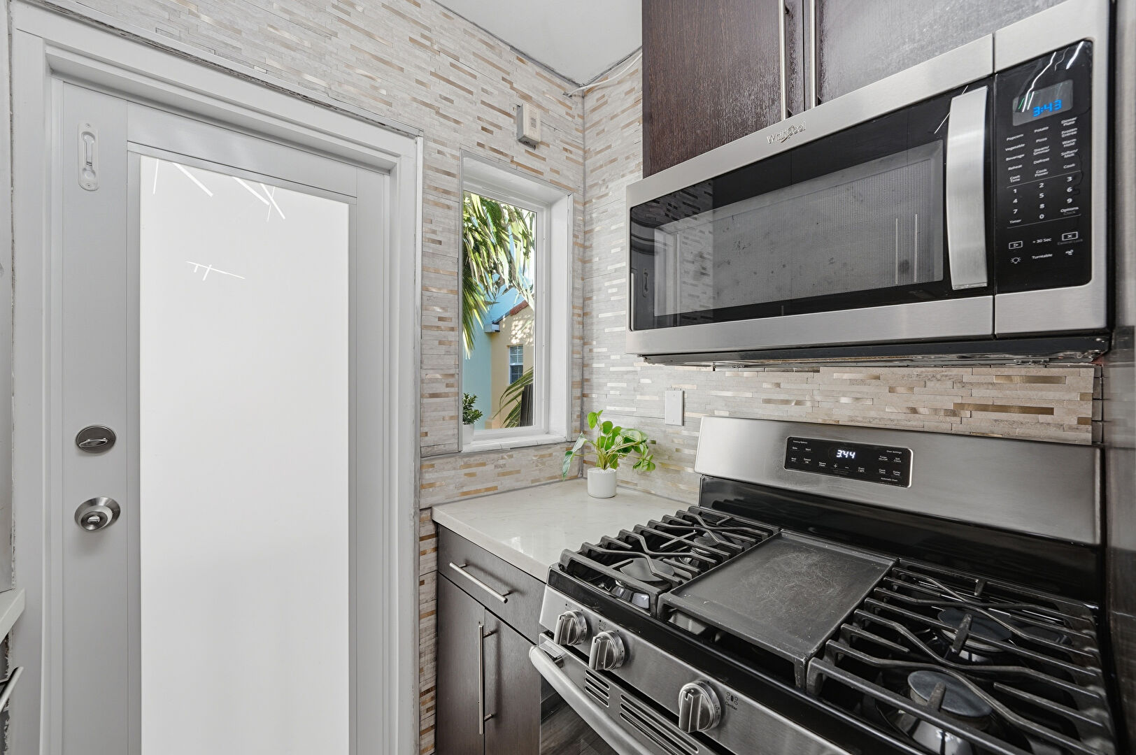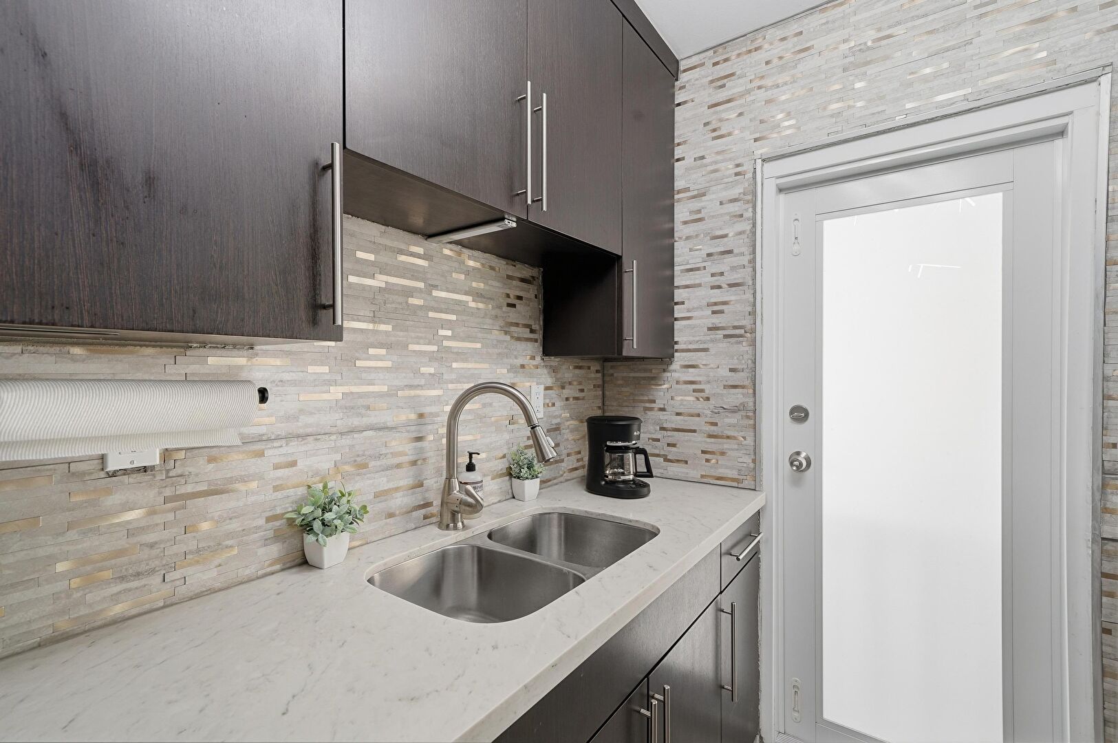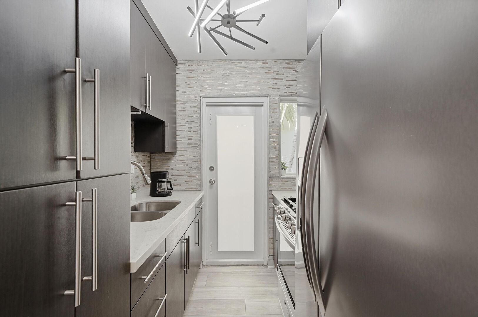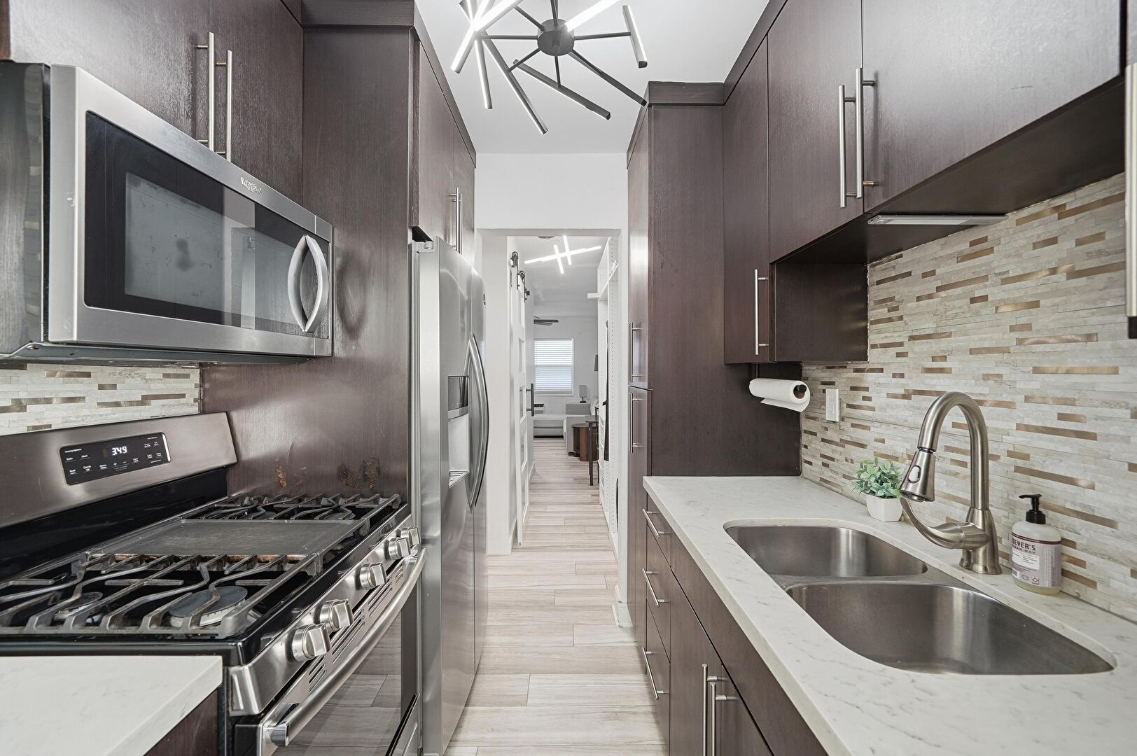 Ceiling Fan, Dark Brown Cabinets, Natural Light, Stone Countertops, Wood Finish Floor, Dark Brown Cabinets, Flat Panel Cabinets, Textured Wall