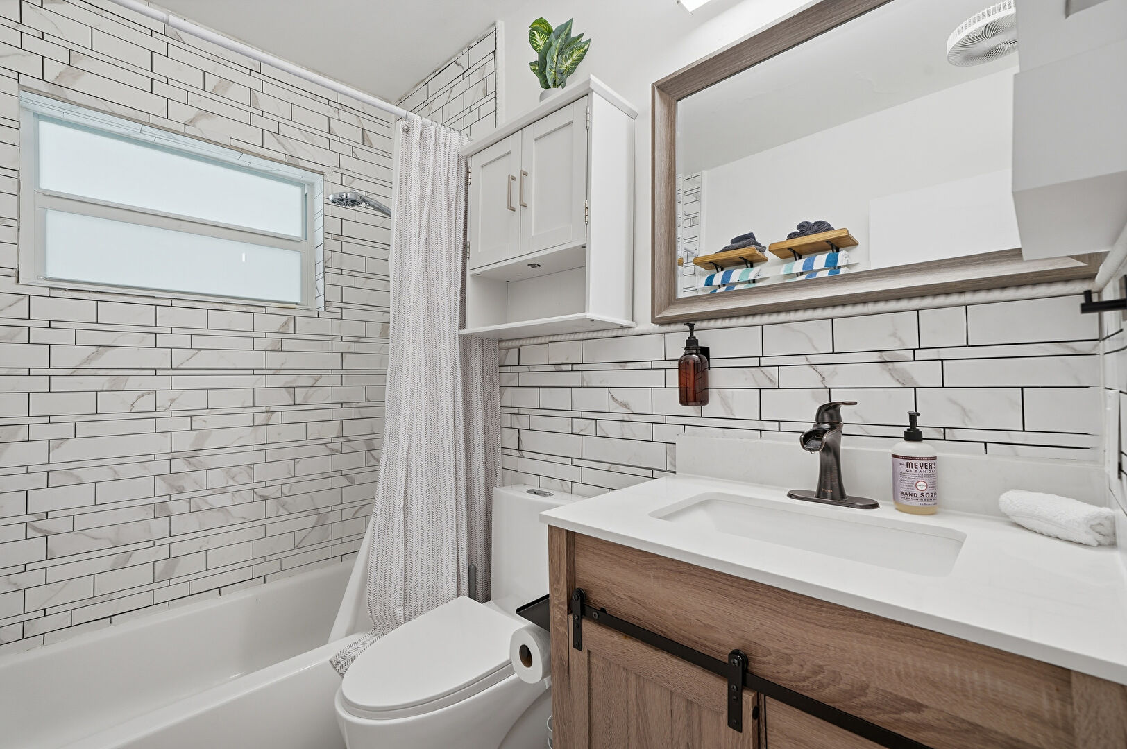 Combined Bath Shower, Dehumidifier, Full Bathroom, Natural Light, Tile Wall, Vanity, Vent, Natural Light, Vanity