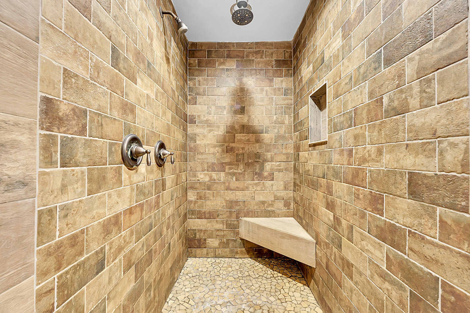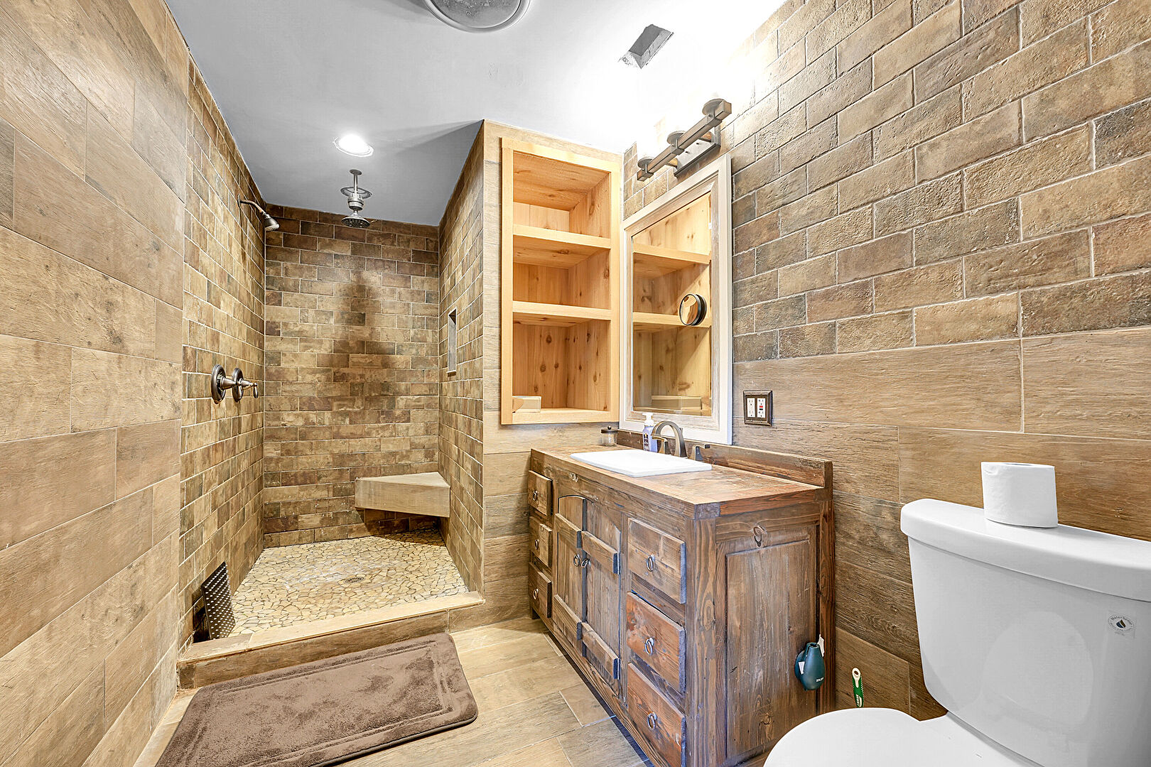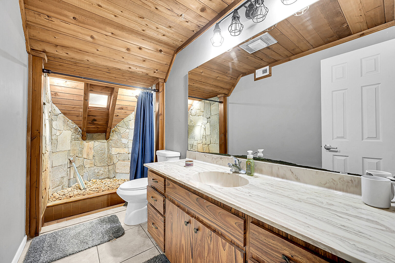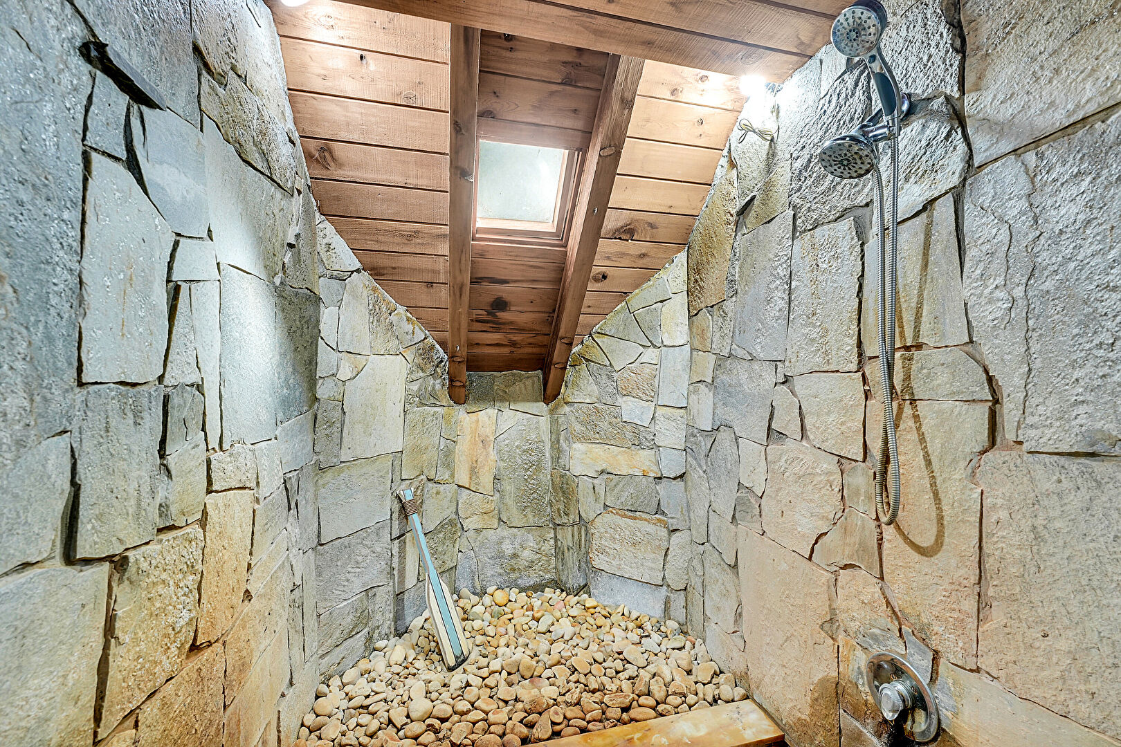 Beamed Ceiling, Drywall, Full Bathroom, Recessed Lighting, Stone Wall, Tile Floor, Tile Wall, Vanity, Vaulted Ceiling, Vent, Wood Ceiling, Full Bathroom, Vaulted Ceiling