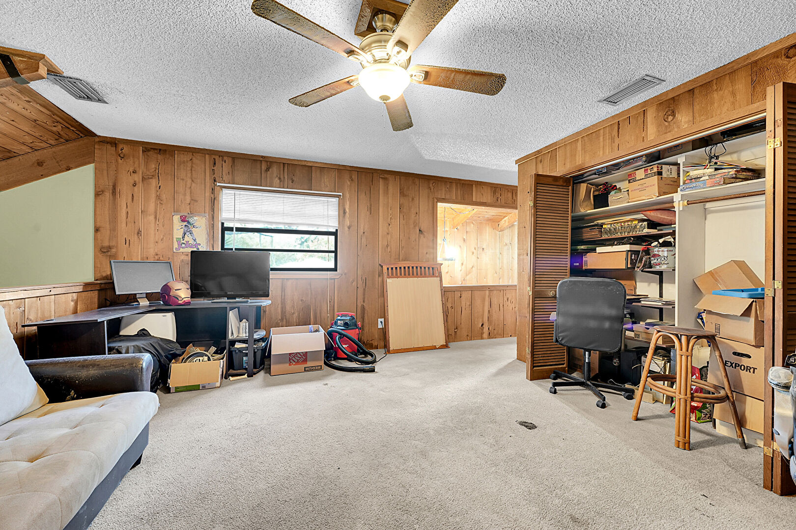 Carpet, Ceiling Fan, Natural Light, Office Area, Textured Ceiling, Vaulted Ceiling, Vent, Wood Wall, Textured Ceiling, Vent