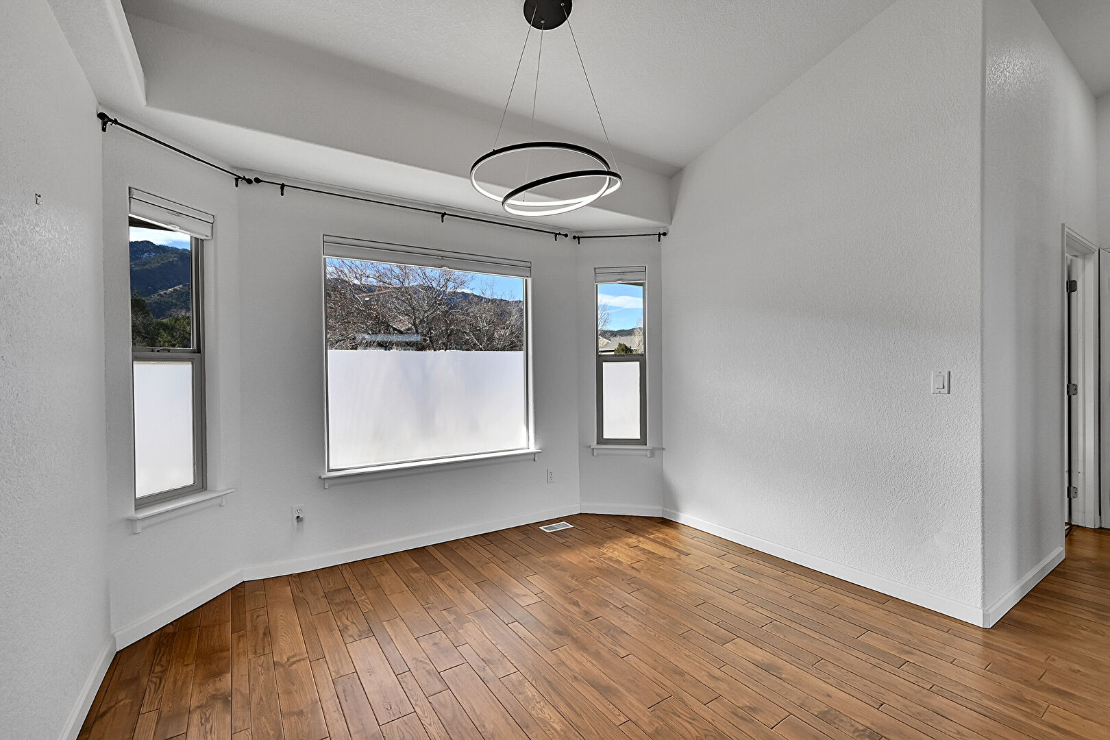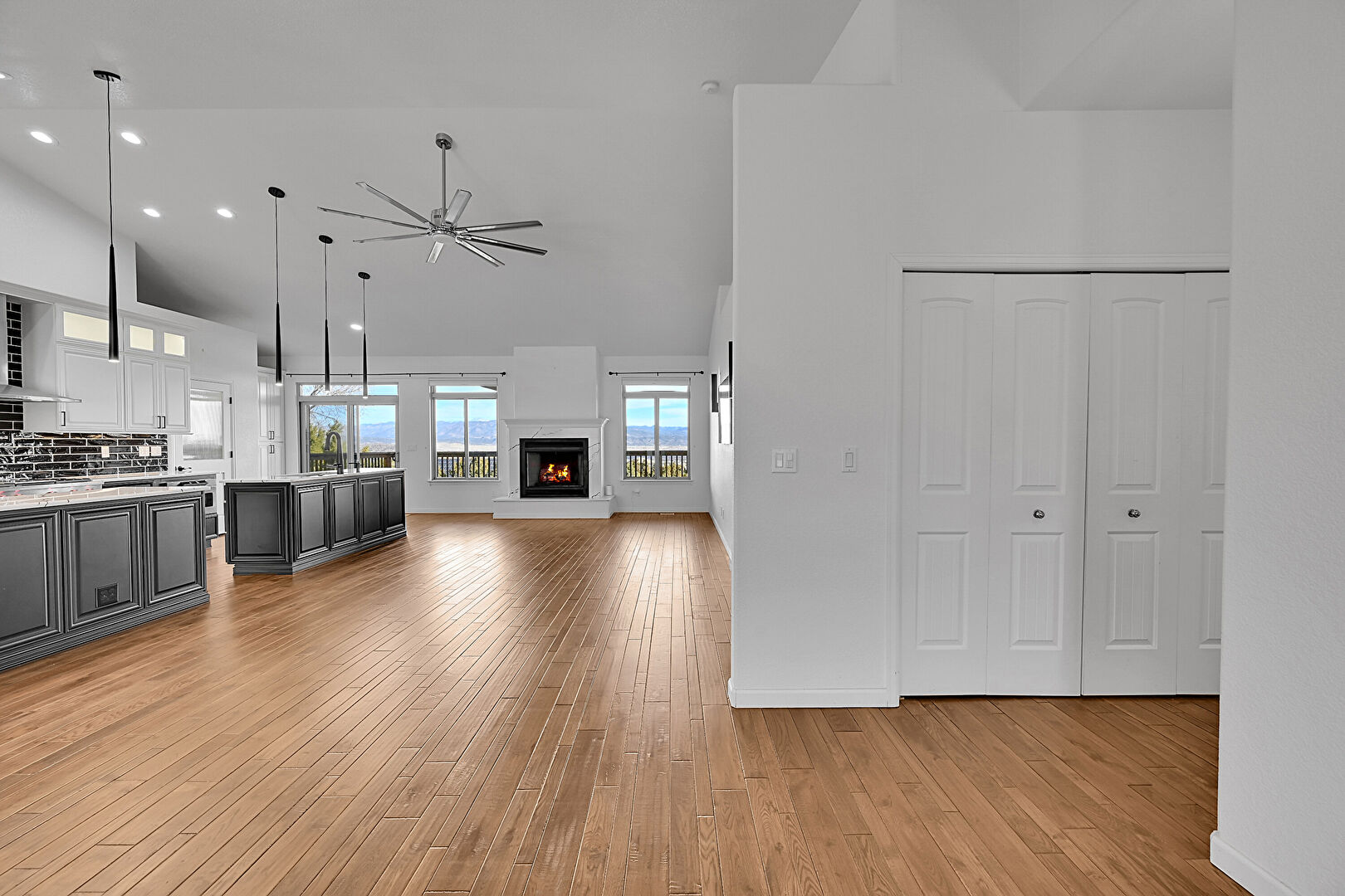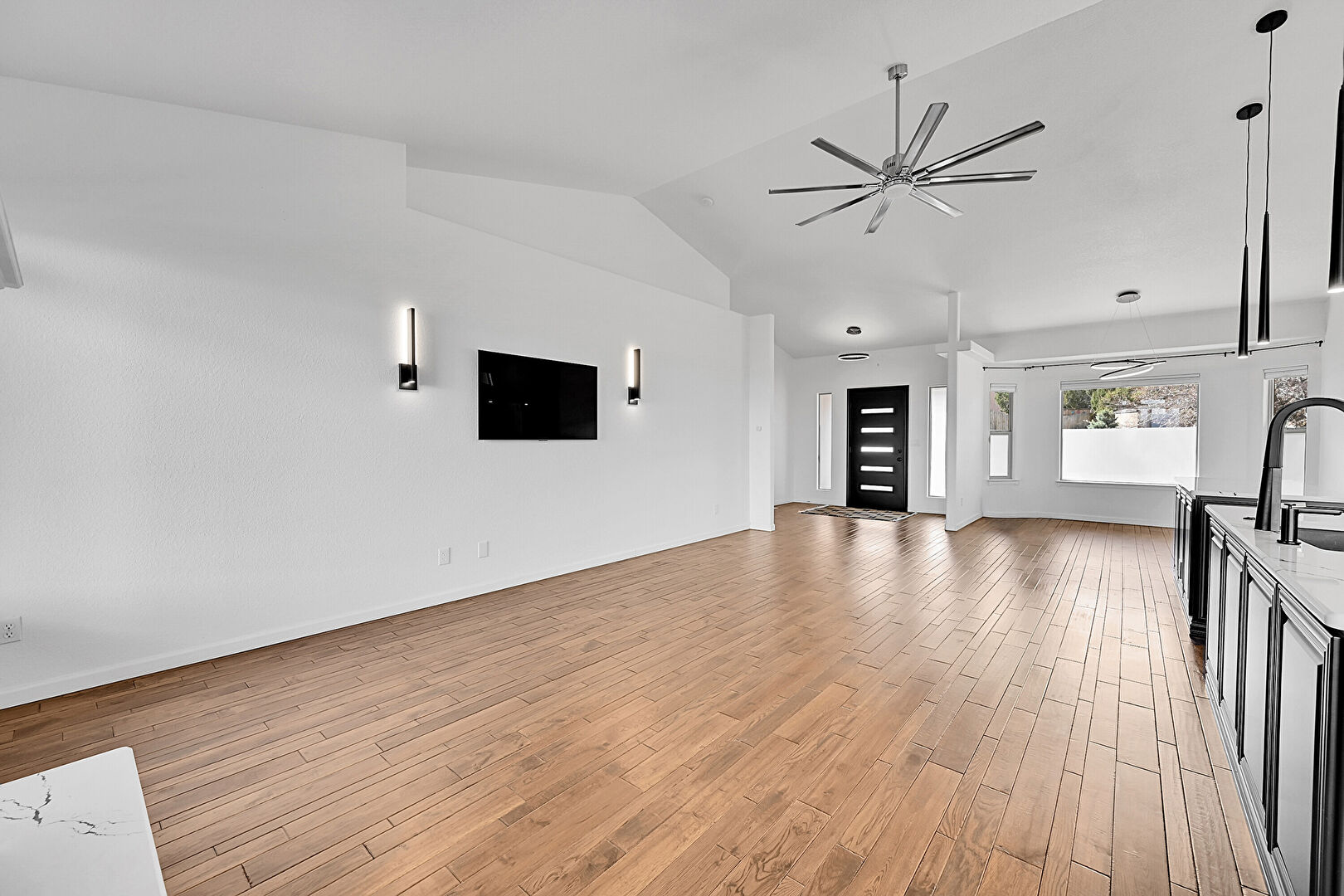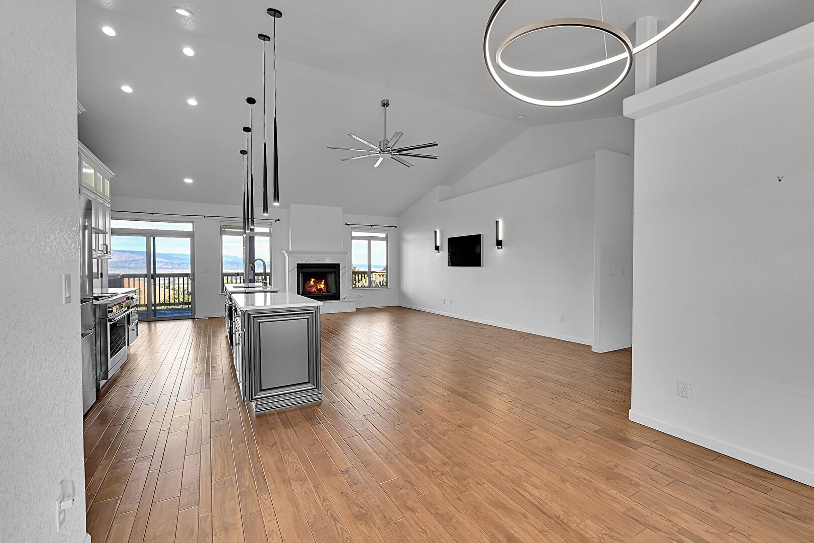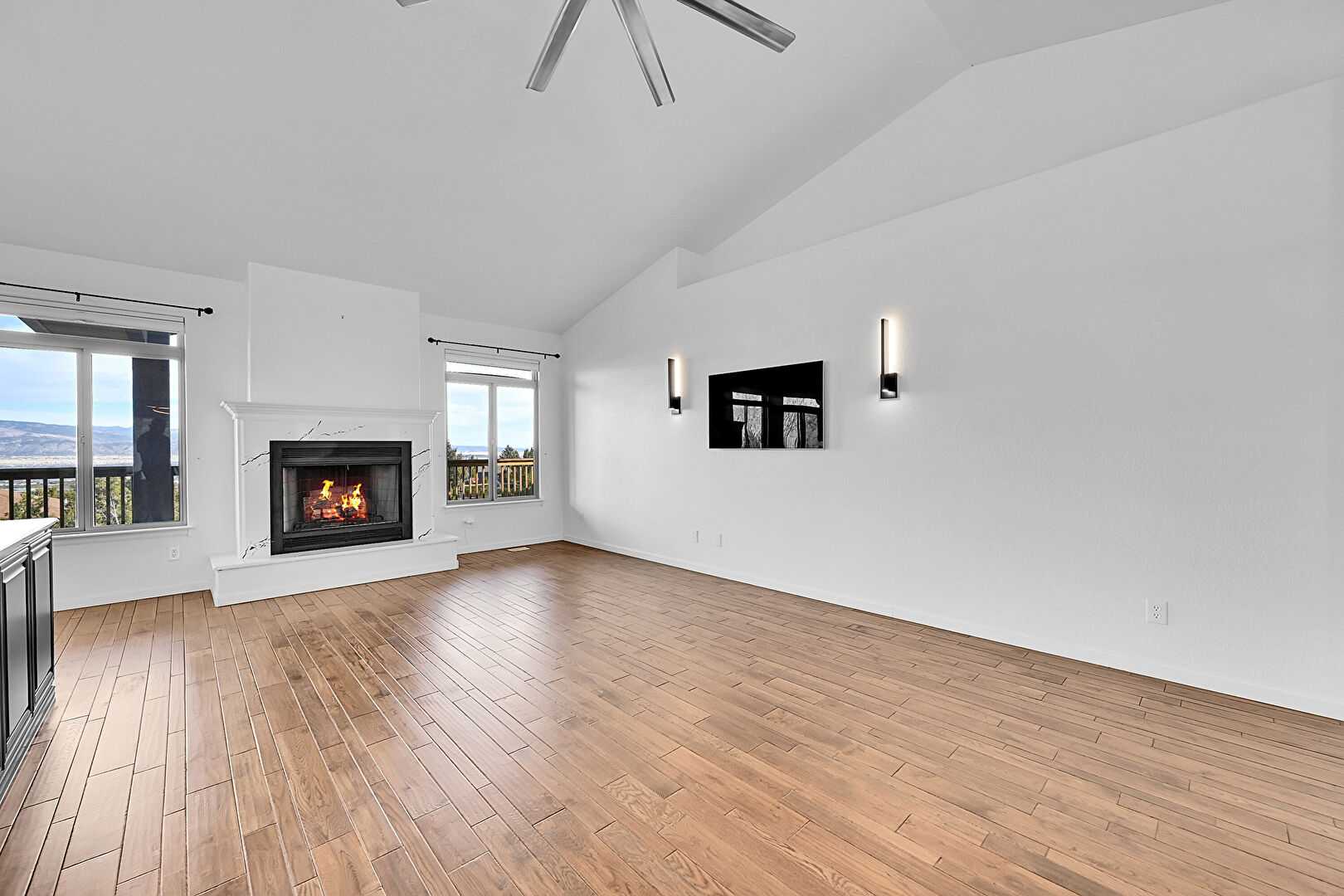 Baseboards Wall, Drywall, Fireplace, High Ceiling, Natural Light, Recessed Lighting, Vaulted Ceiling, Vent, Wood Finish Floor, Ceiling Fan, Textured Wall