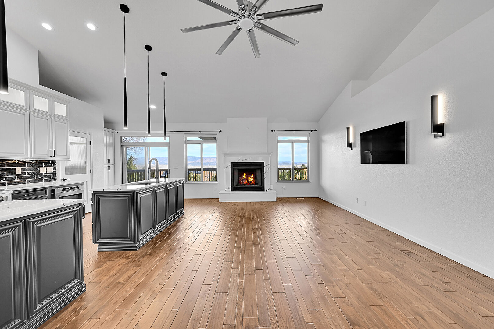 Baseboards Wall, Ceiling Fan, Drywall, Fireplace, Glass Insert Cabinets, Gray Cabinets, High Ceiling, Kitchen Island, Natural Light, Opens To Living Area, Pendant Lighting, Raised Cabinets, Recessed Lighting, Stone Countertops, Textured Wall, Vaulted Ceiling, Wood Finish Floor, Crown Molding Cabinets, Natural Light, Vent