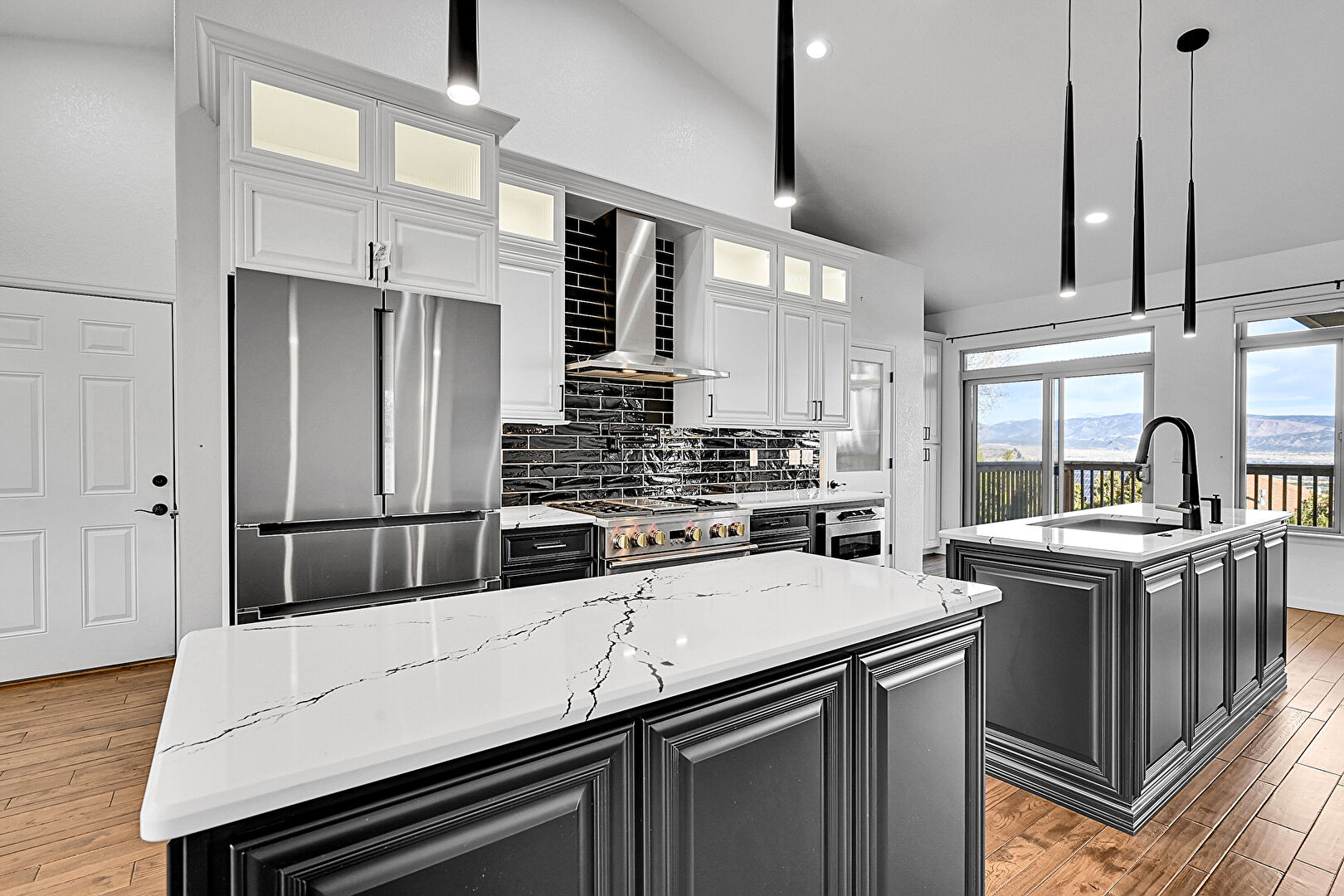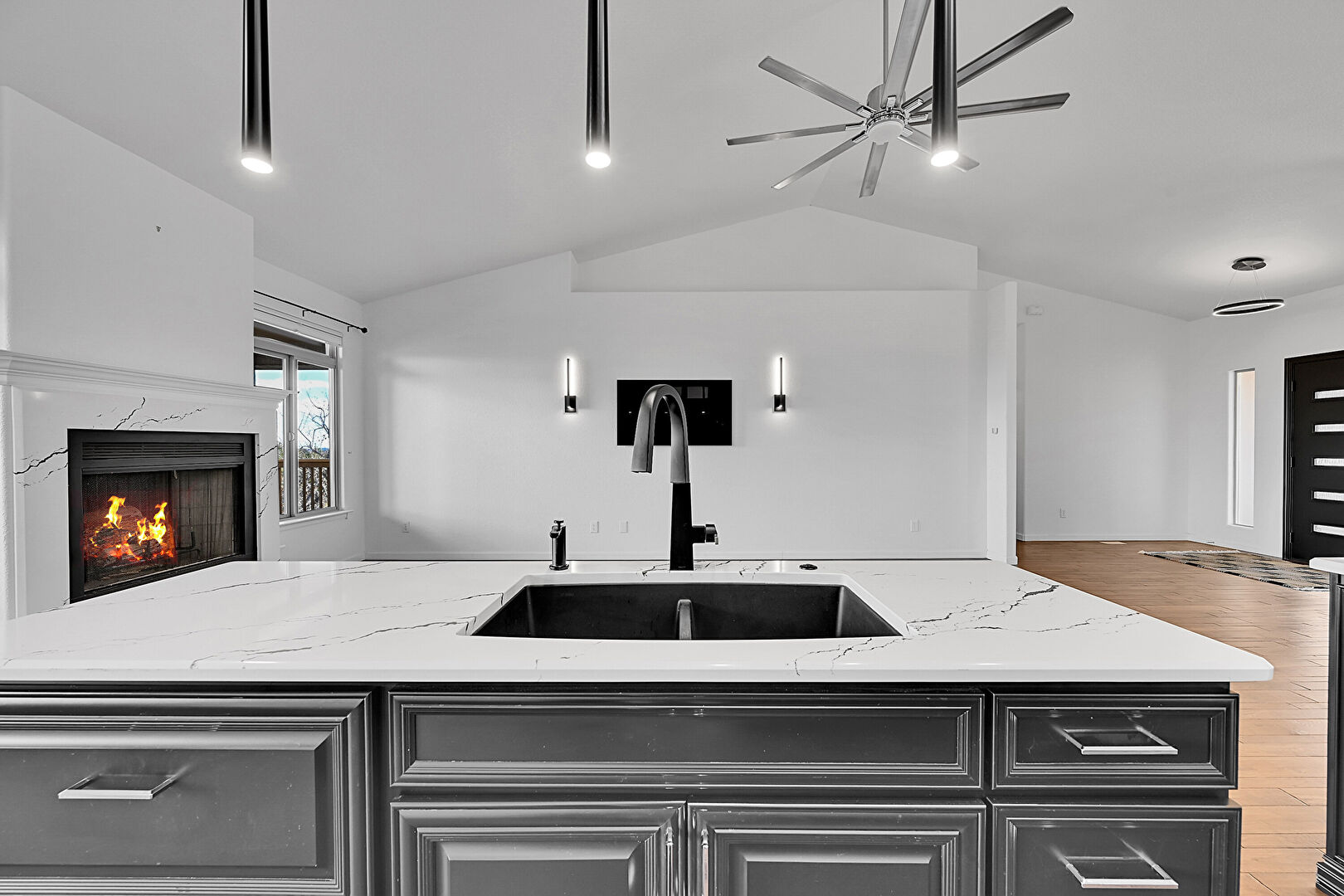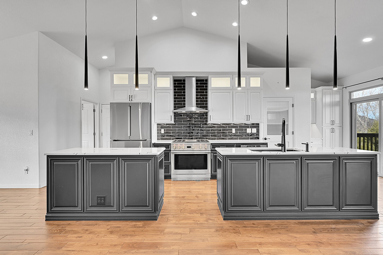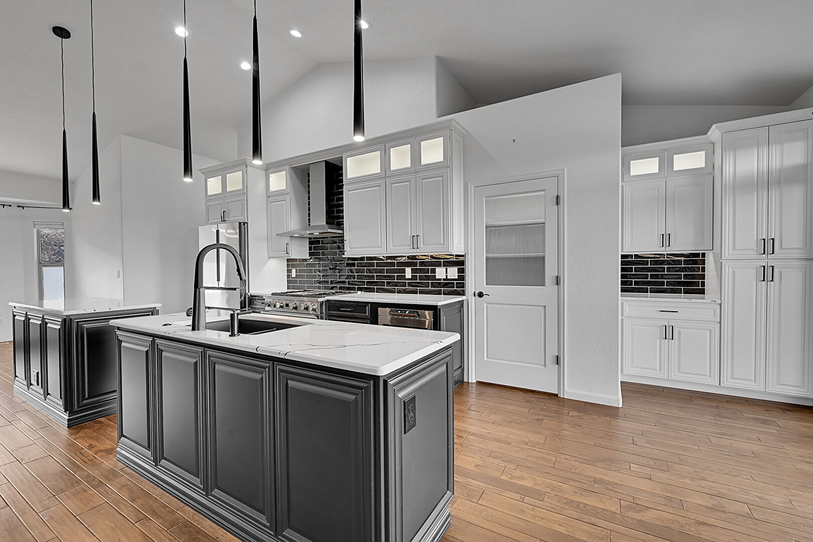Baseboards Wall, Black Cabinets, Cathedral Ceiling, Ceiling Fan, Crown Molding Cabinets, Drywall, Fireplace, Glass Insert Cabinets, Gray Cabinets, High Ceiling, Indoor Bar, Kitchen Island, L Shaped Kitchen, Multiple Kitchen Islands, Natural Light, Opens To Living Area, Pendant Lighting, Pot Filler, Raised Cabinets, Recessed Lighting, Stone Countertops, Textured Wall, Track Lighting, Vaulted Ceiling, Wood Finish Floor, Black Cabinets, Drywall, Fireplace, Glass Insert Cabinets, Kitchen Island, Natural Light, Pendant Lighting, Stone Countertops