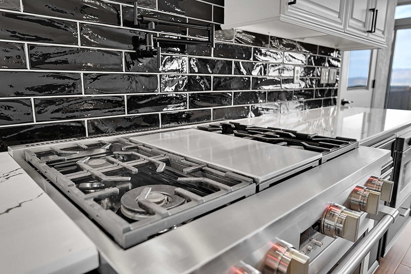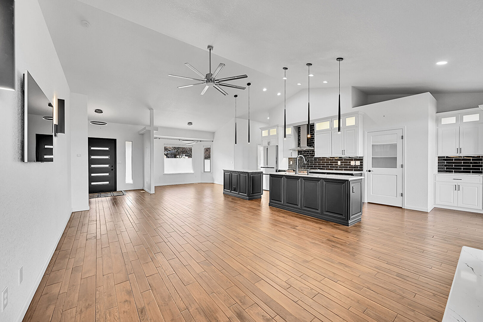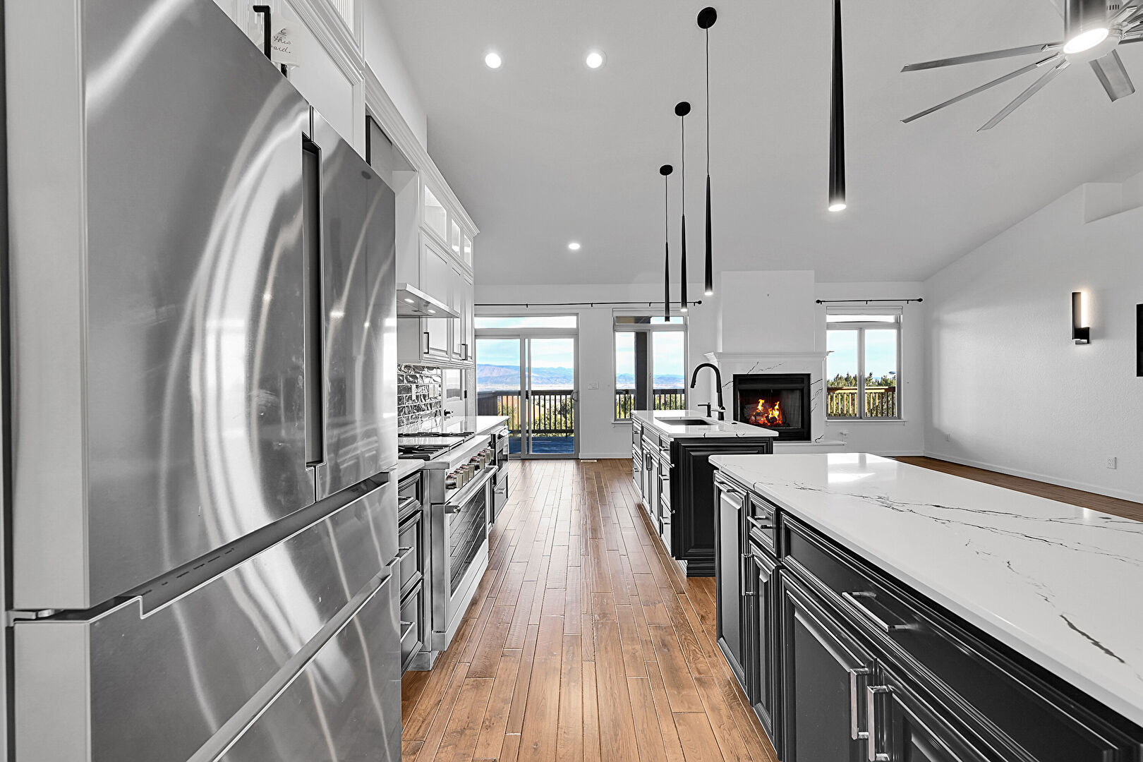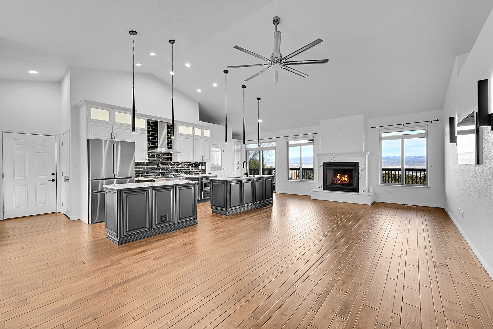 Baseboards Wall, Black Cabinets, Cathedral Ceiling, Ceiling Fan, Crown Molding Cabinets, Drywall, Fireplace, Glass Insert Cabinets, Gray Cabinets, High Ceiling, Indoor Bar, Kitchen Island, L Shaped Kitchen, Multiple Kitchen Islands, Natural Light, Opens To Living Area, Pendant Lighting, Pot Filler, Raised Cabinets, Recessed Lighting, Stone Countertops, Textured Wall, Track Lighting, Vaulted Ceiling, Wood Finish Floor, Black Cabinets, Drywall, Fireplace, Glass Insert Cabinets, Kitchen Island, Natural Light, Pendant Lighting, Stone Countertops