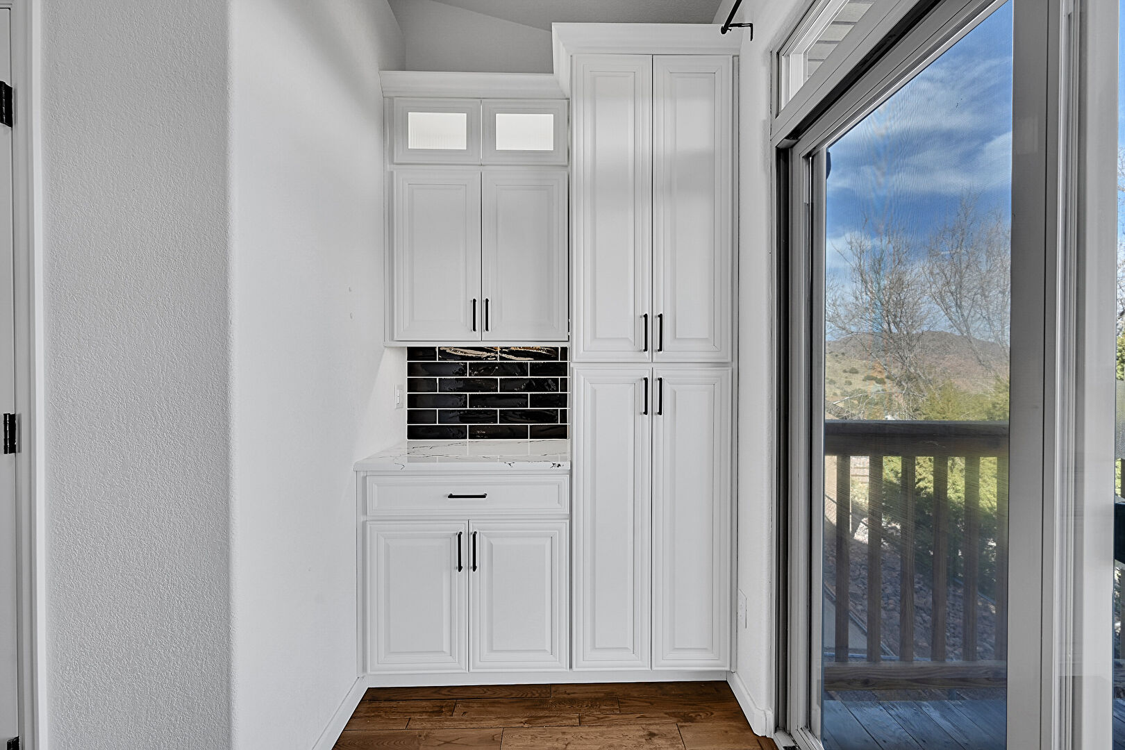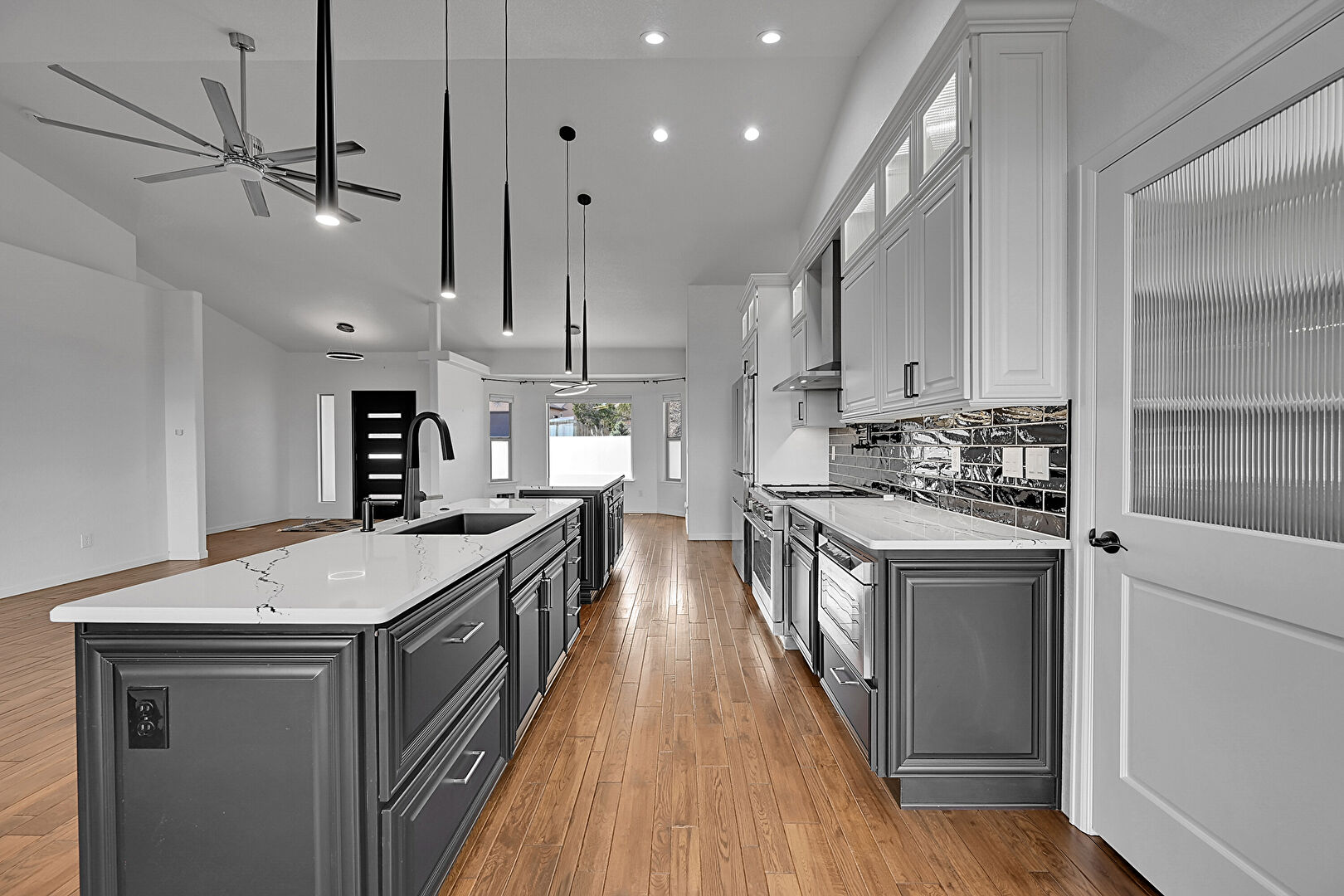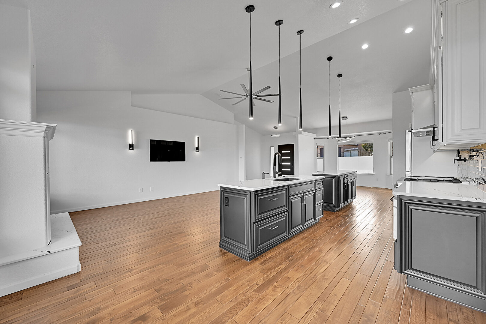 Baseboards Wall, Ceiling Fan, Crown Molding Cabinets, Drywall, Fireplace, Glass Insert Cabinets, Gray Cabinets, High Ceiling, Kitchen Island, Natural Light, Opens To Living Area, Pendant Lighting, Raised Cabinets, Recessed Lighting, Stone Countertops, Vaulted Ceiling, Wood Finish Floor, Cathedral Ceiling, Drywall, Natural Light