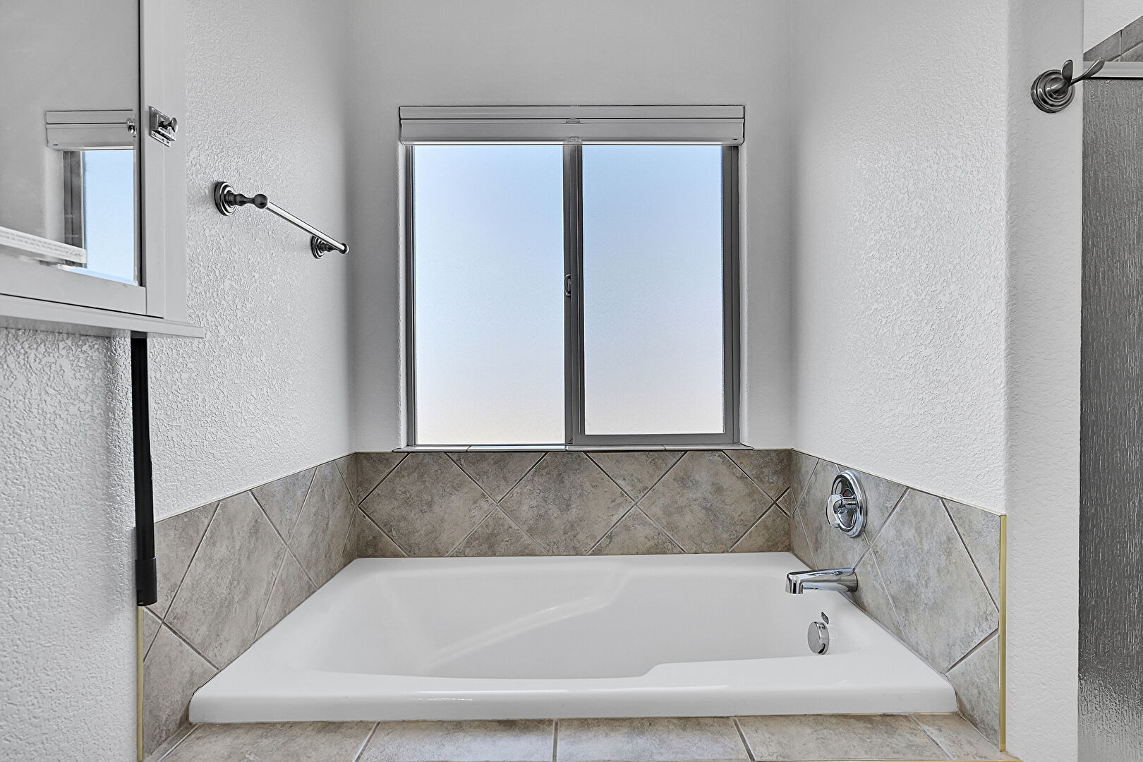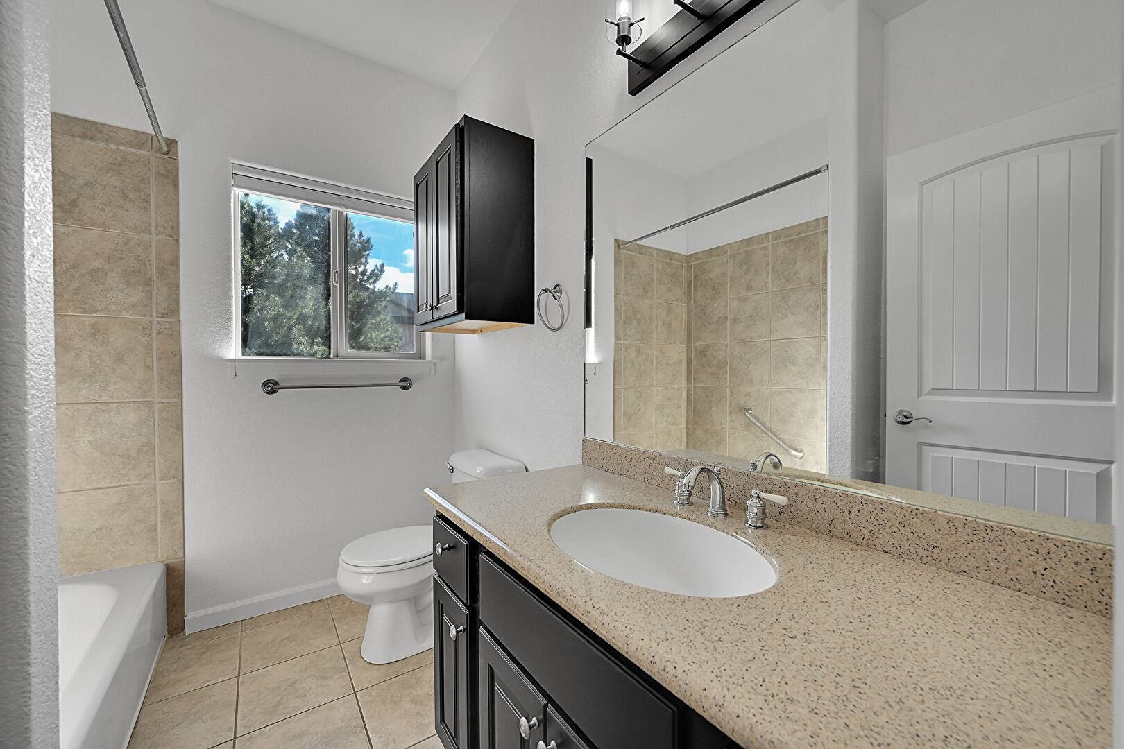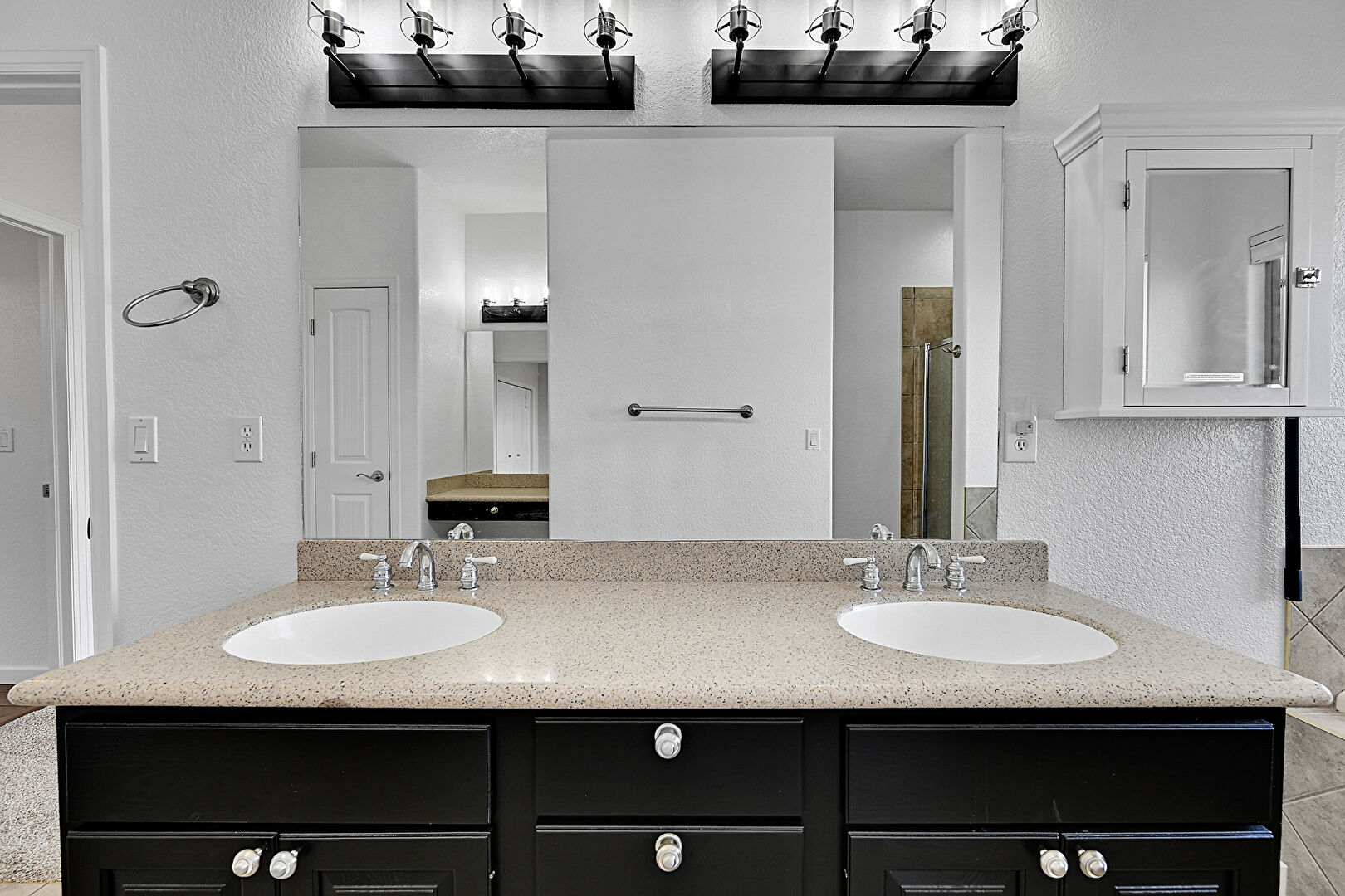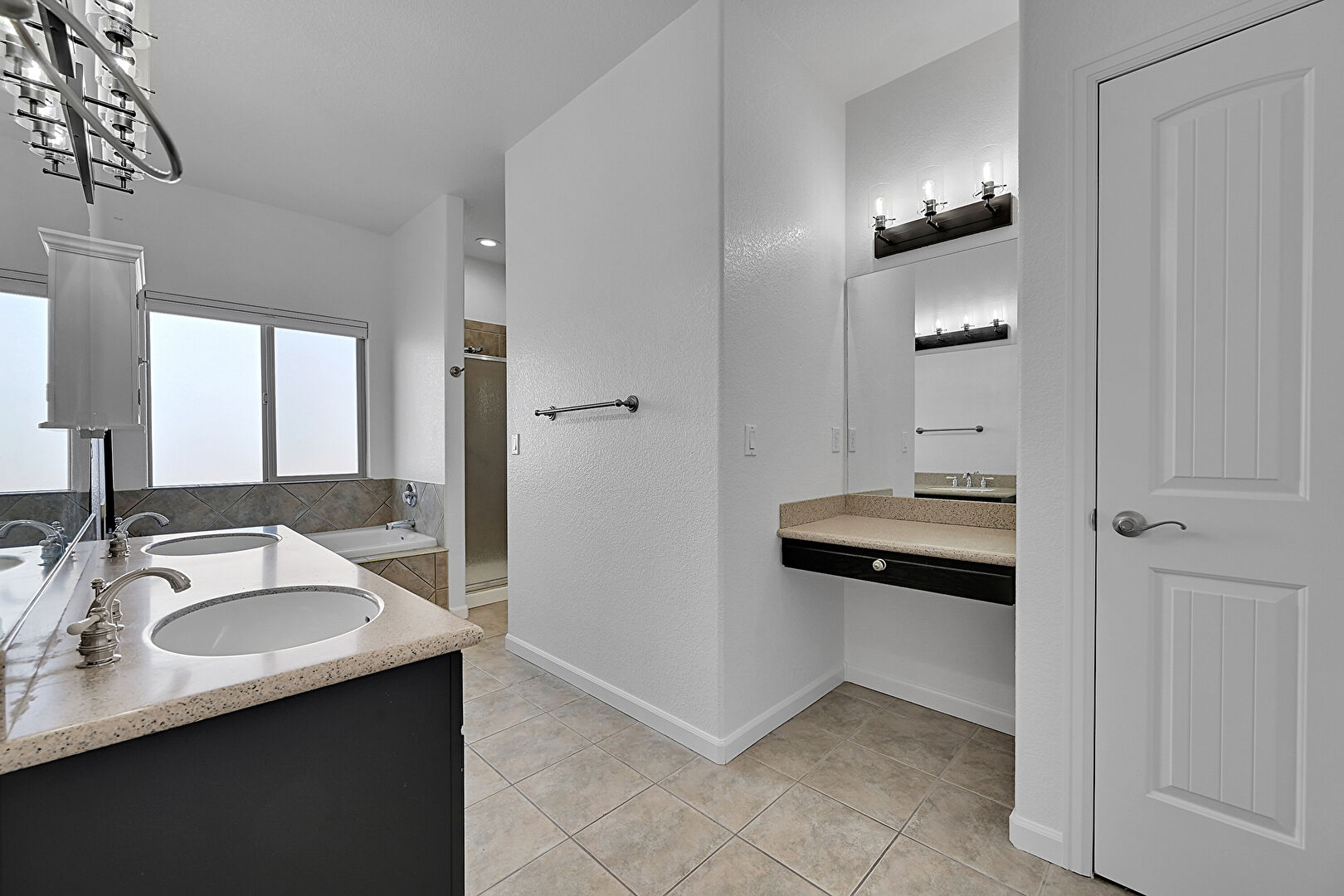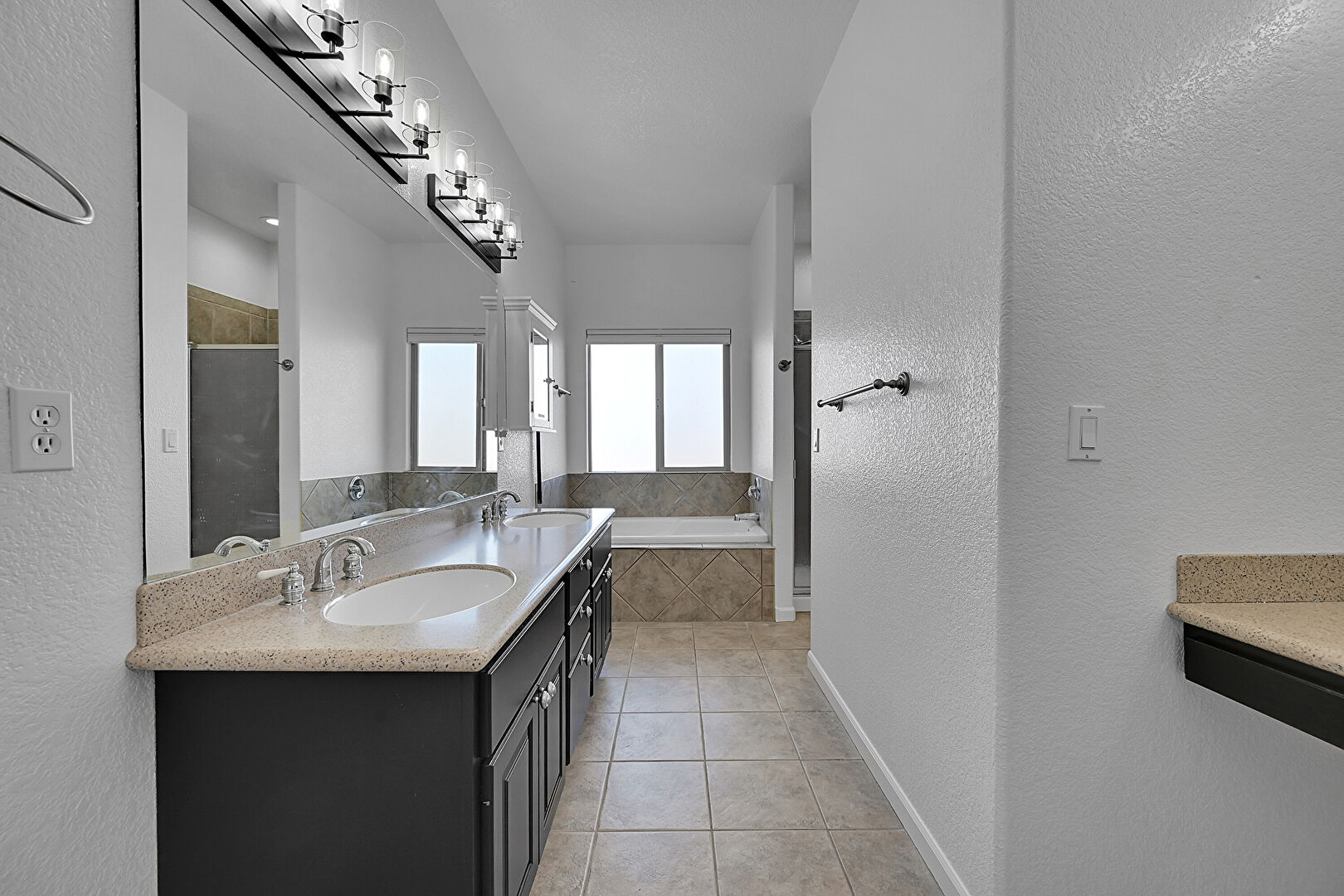 Baseboards Wall, Double Vanity, Drywall, Full Bathroom, Natural Light, Textured Wall, Tile Floor, Full Bathroom, Natural Light, Textured Wall