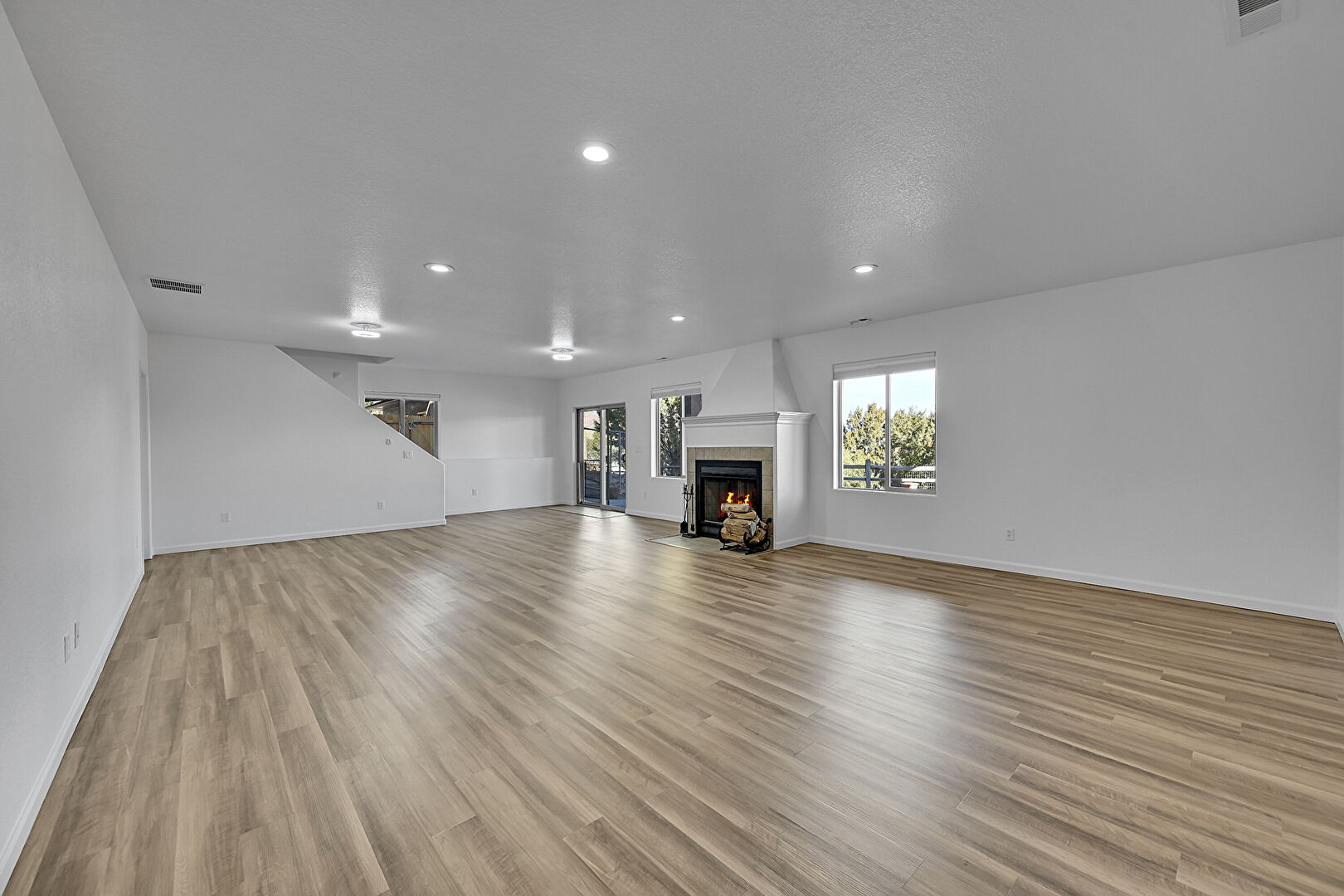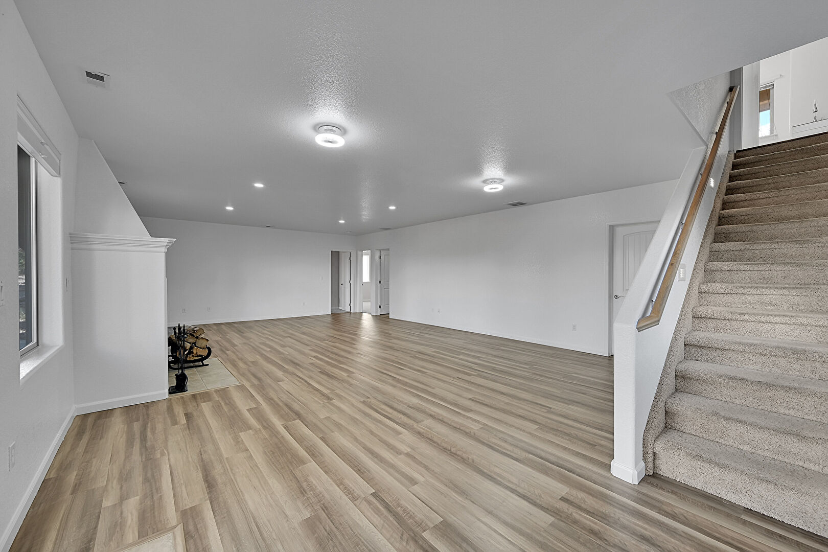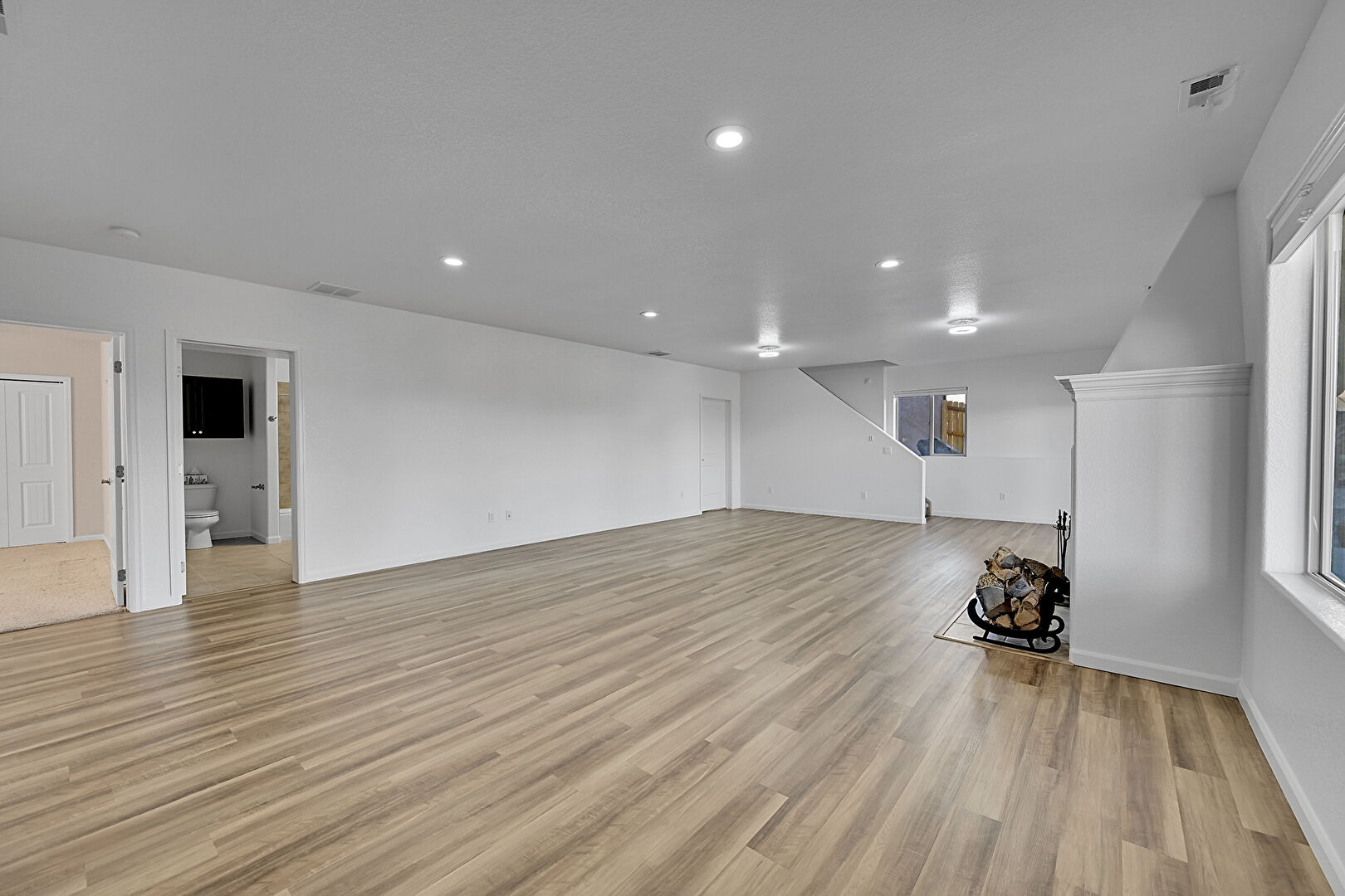 Baseboards Wall, Basement, Drywall, Fireplace, Natural Light, Recessed Lighting, Stairs, Textured Ceiling, Vent, Wood Finish Floor, Baseboards Wall, Recessed Lighting, Vent