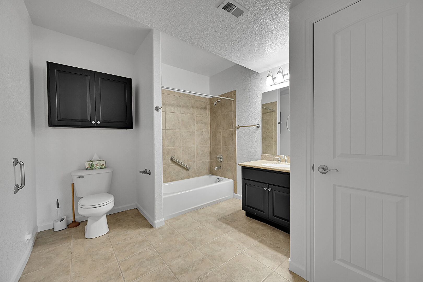 Baseboards Wall, Closet, Combined Bath Shower, Full Bathroom, Natural Light, Textured Ceiling, Tile Floor, Vanity, Vent, Drywall, Full Bathroom