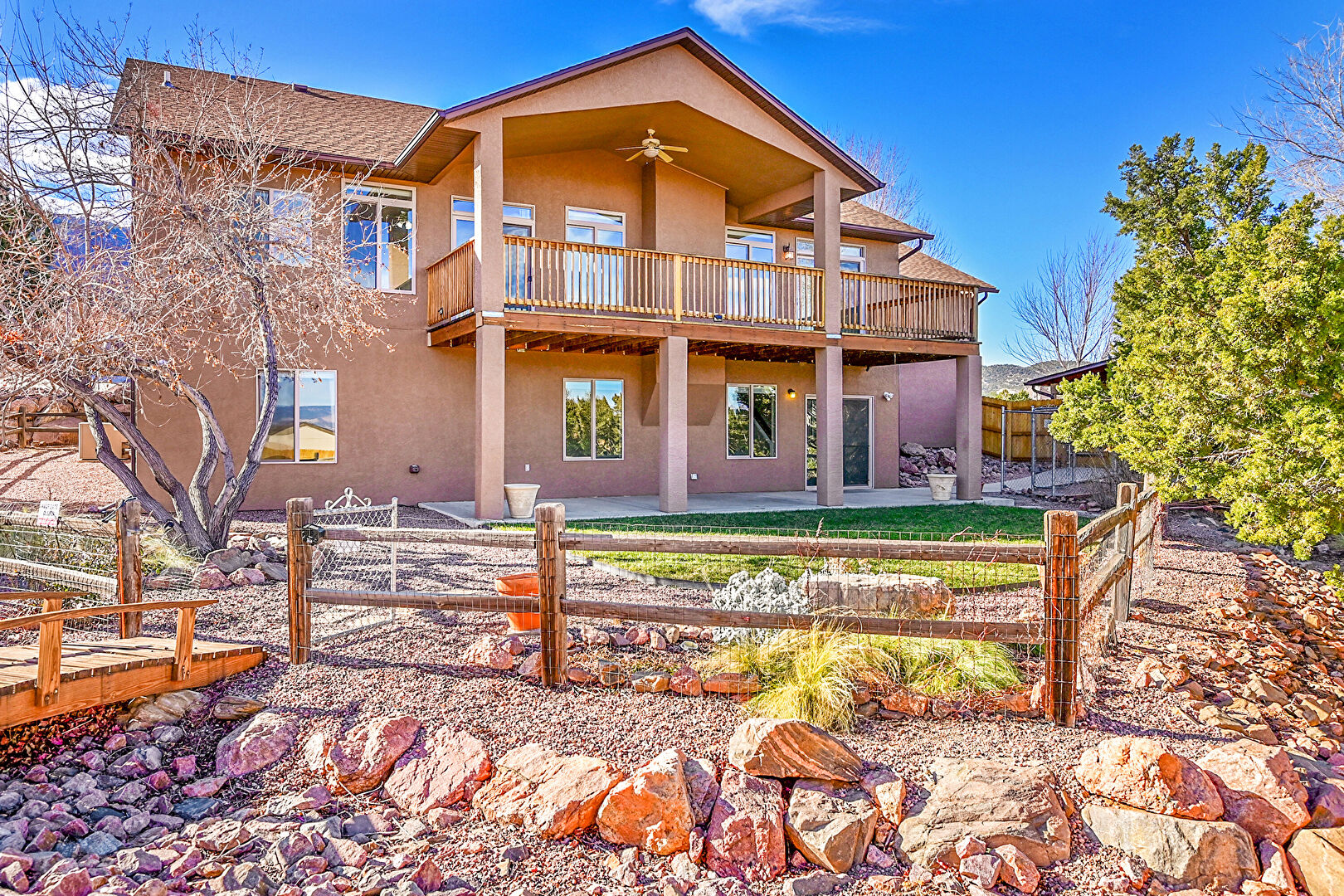 Balcony, Basement Walk Out, Ceiling Fan, Central Ac, Deck, Downspout, Fence, Gate, Gutters, Lawn, Patio, Stucco Siding, Ceiling Fan, Deck, Downspout, Fence, Lawn, Mountain View, Shingle Roof