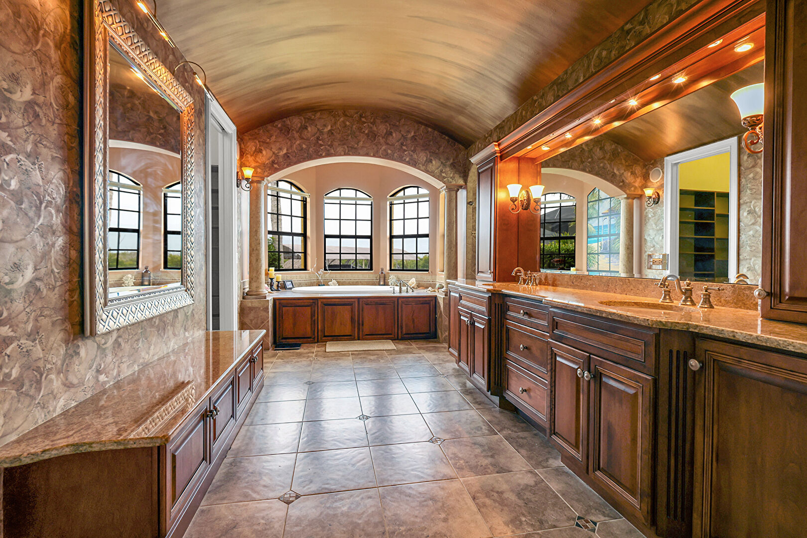 Barrel Ceiling, Natural Light, Notable Chandelier, Tile Floor, Vanity, Vaulted Ceiling, Full Bathroom