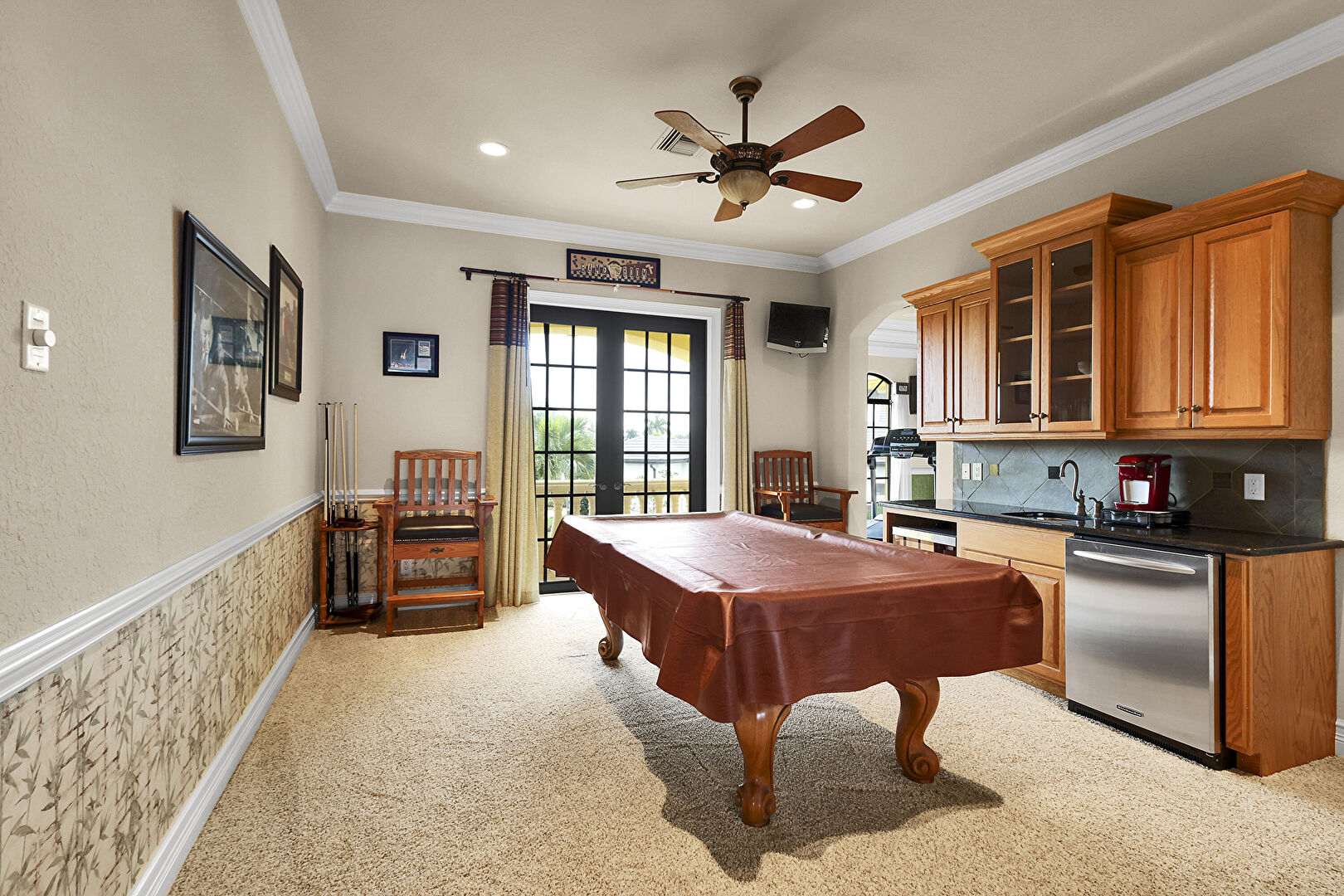 Baseboards Wall, Billiards, Carpet, Ceiling Fan, Crown Molding, Drywall, French Doors, Natural Light, Recessed Lighting, Wainscot Wall, Wine Cooler, Vent