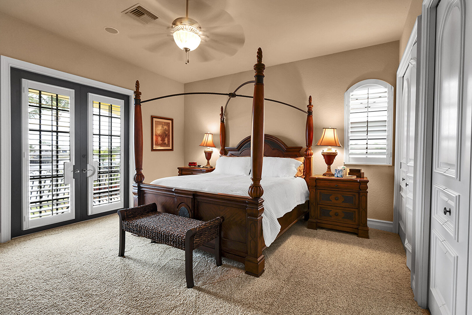 Access To Exterior, Carpet, Ceiling Fan, Closet, Drywall, French Doors, Natural Light, Vent, Baseboards Wall