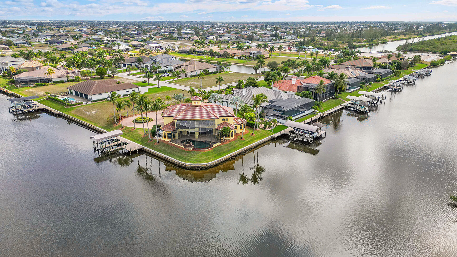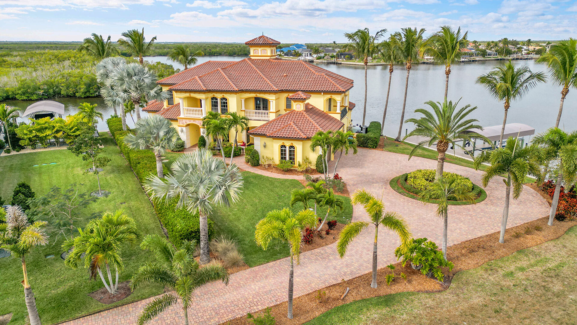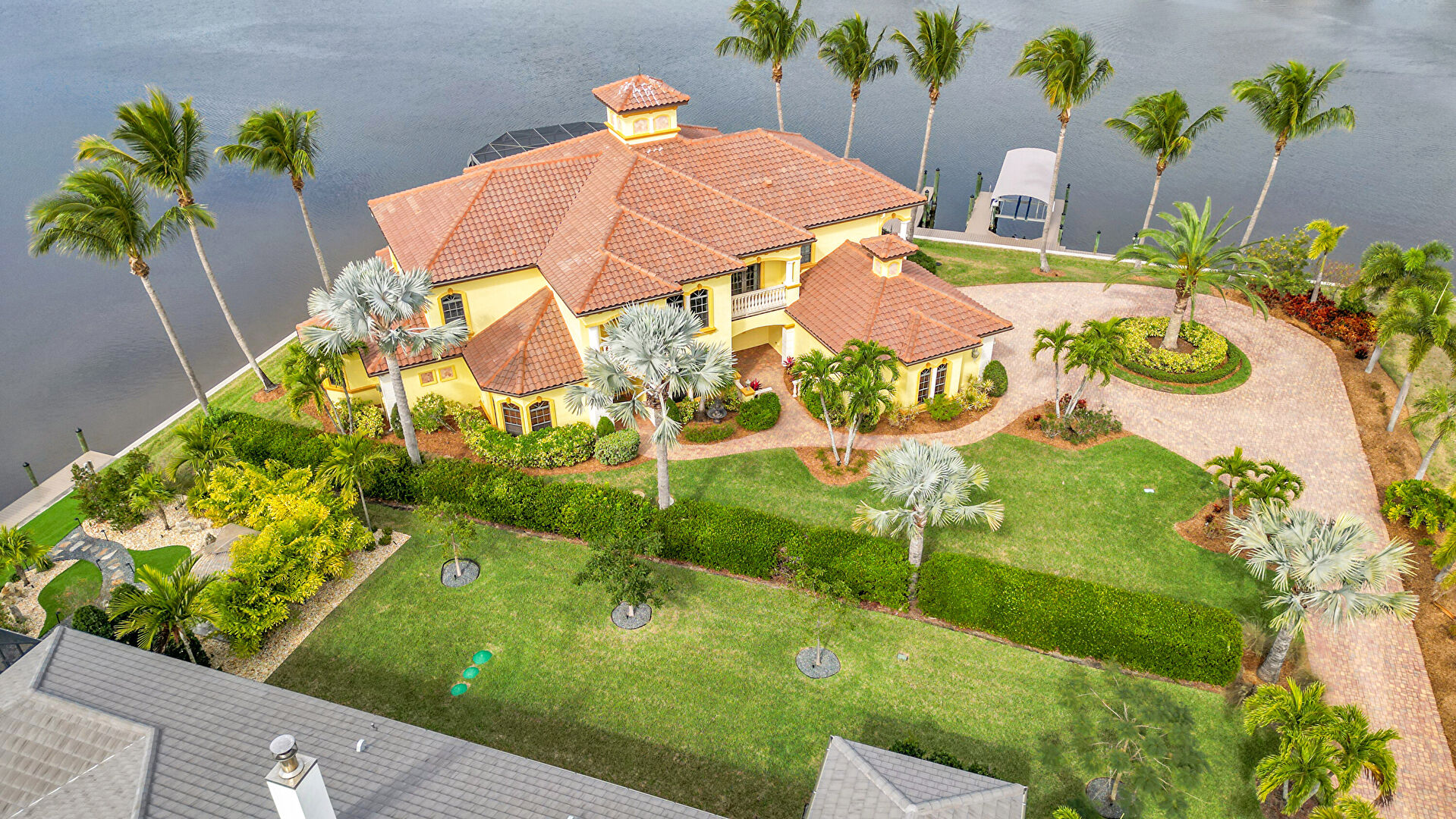 Balcony, Chimney, Driveway, Fence, Gate, Lawn, Parking Pad, Stucco Siding, Tile Roof, Water View, Lawn, Stucco Siding, Tile Roof