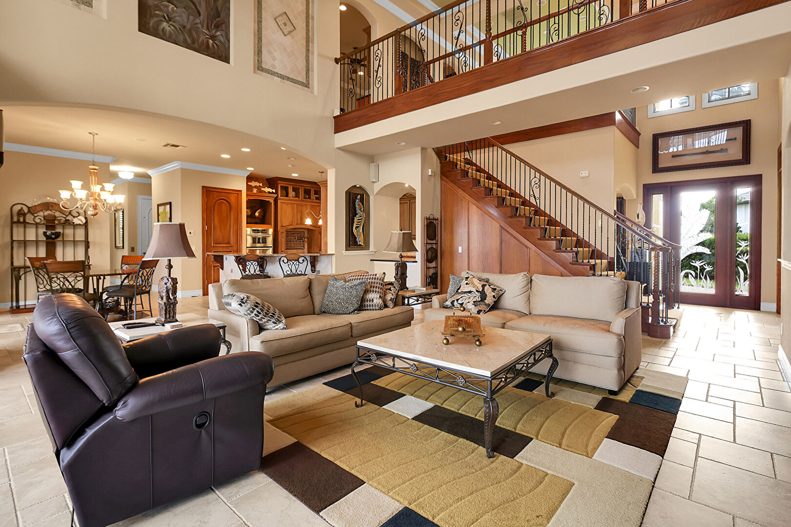 Arched Walkways, Baseboards Wall, Drywall, High Ceiling, Stairs, Stone Finish Floor, Natural Light