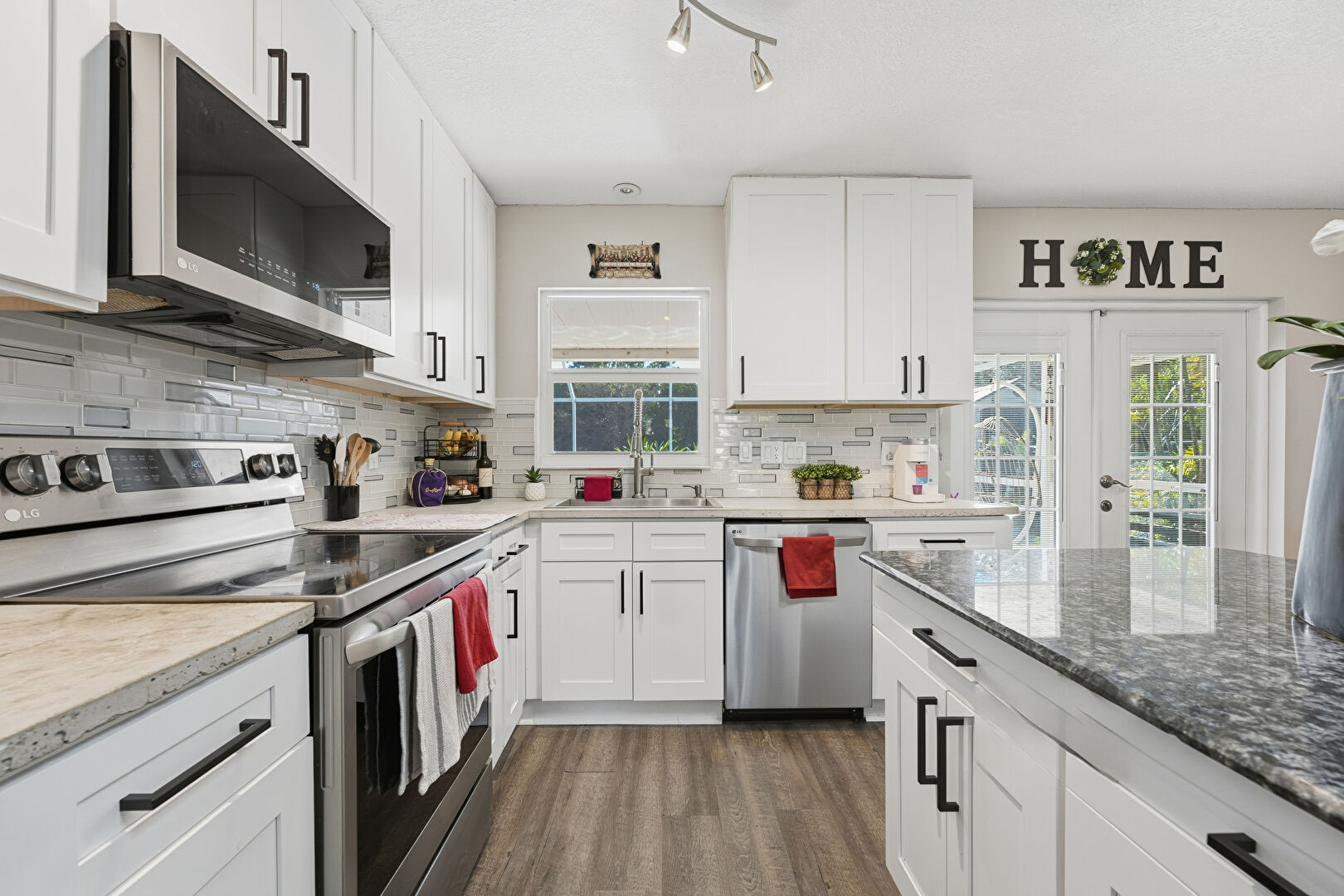 Drywall, Kitchen Island, Natural Light, Shaker Cabinets, Stone Countertops, Wood Finish Floor, French Doors, L Shaped Kitchen